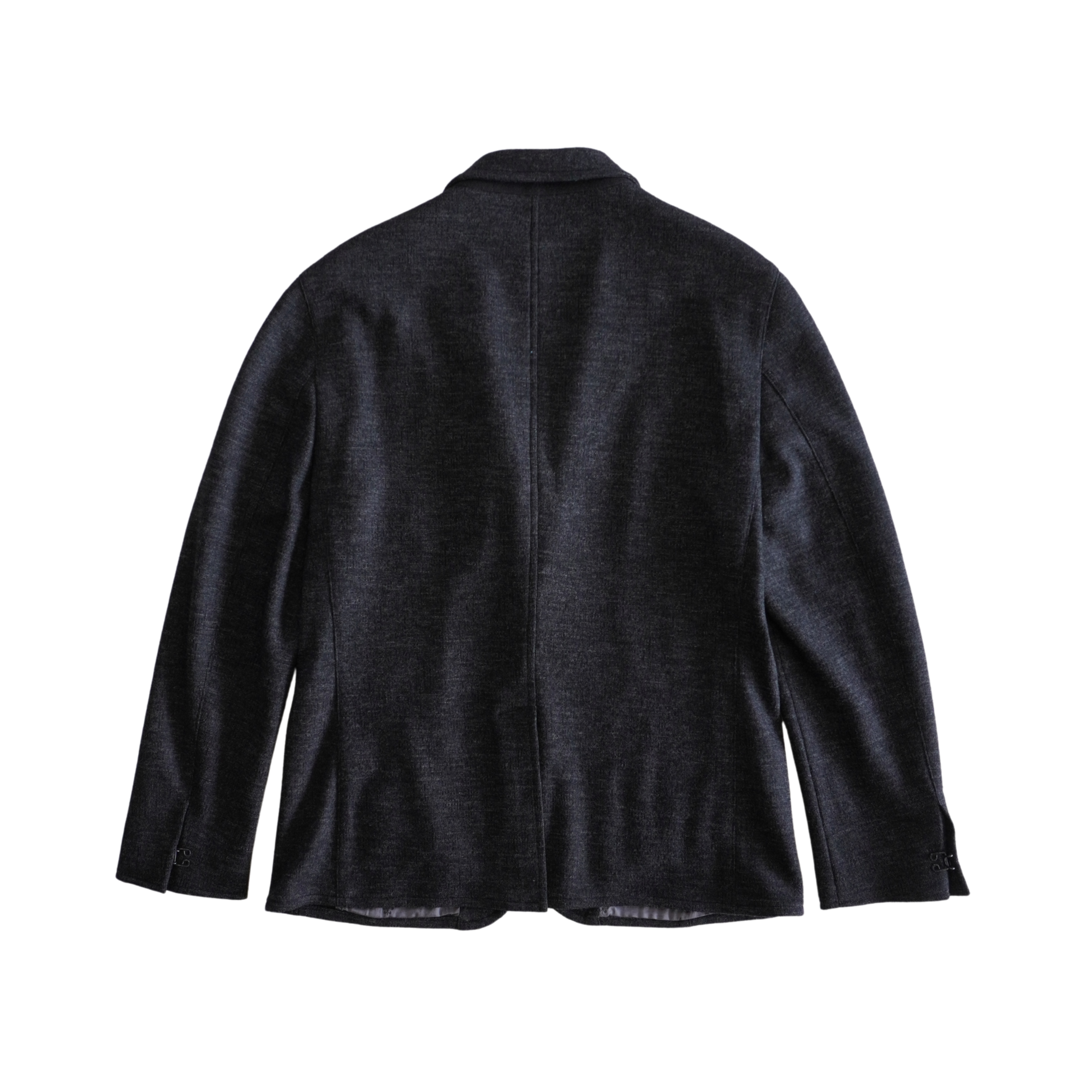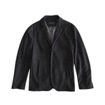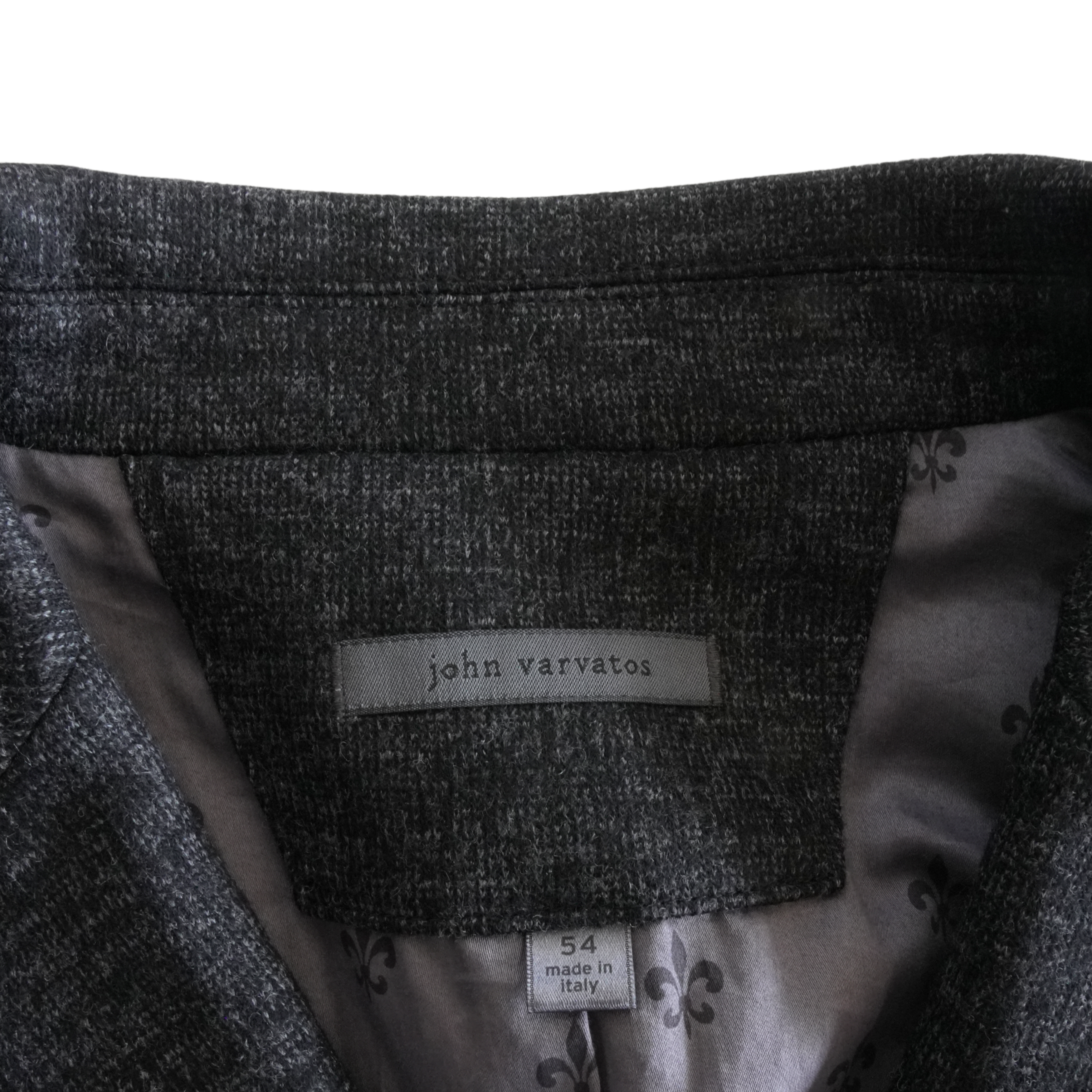 John Varvatos unstructured blazer in dark heathered grey wool with two front slip pockets, lapel collar, back vent and gunmetal hook and eye closure.