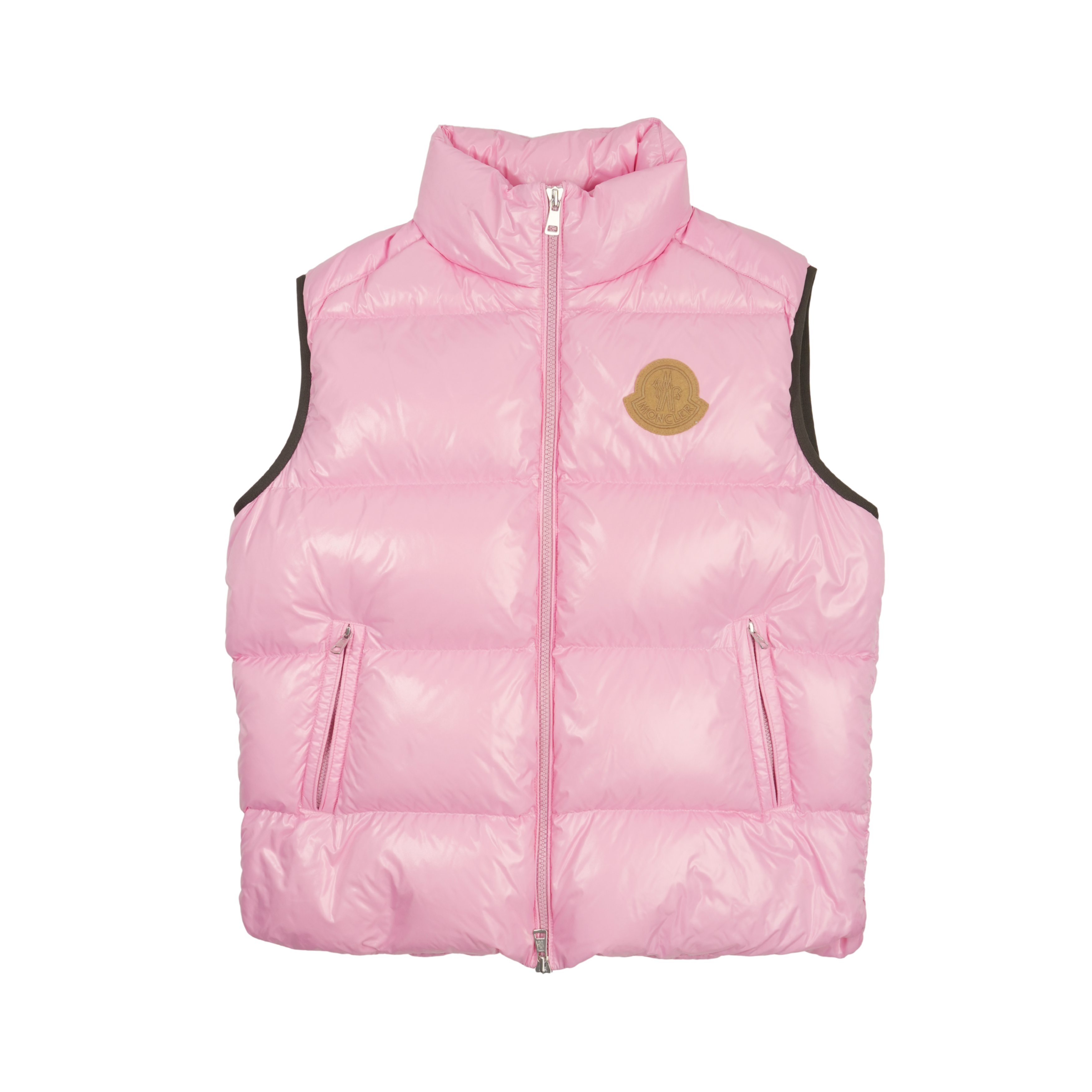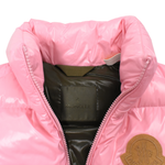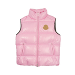 Moncler Genius 'Adrastea' down puffer vest in bright pink with brown felt logo patch on chest. Features zip pockets on front, dark brown interior and piping around arms, and a double zip with silver hardware.