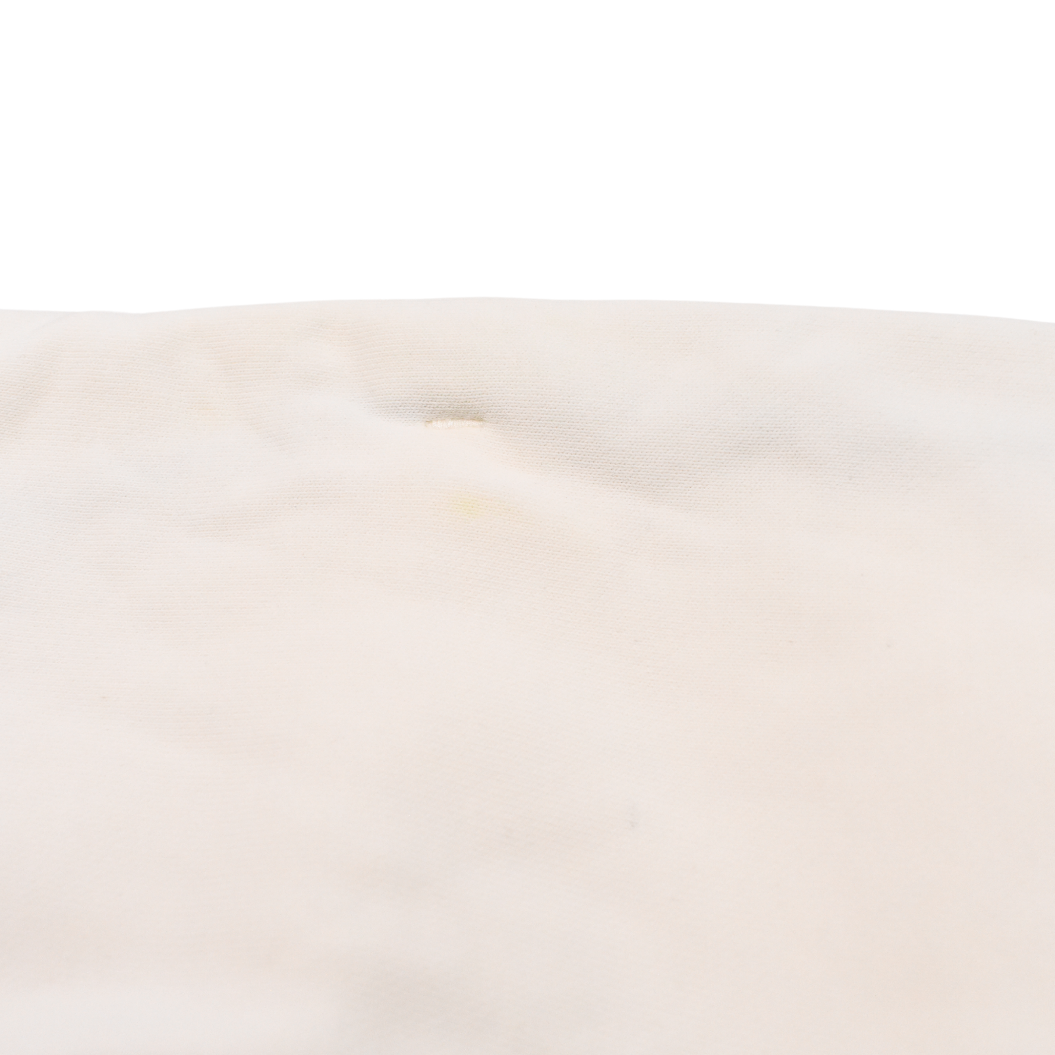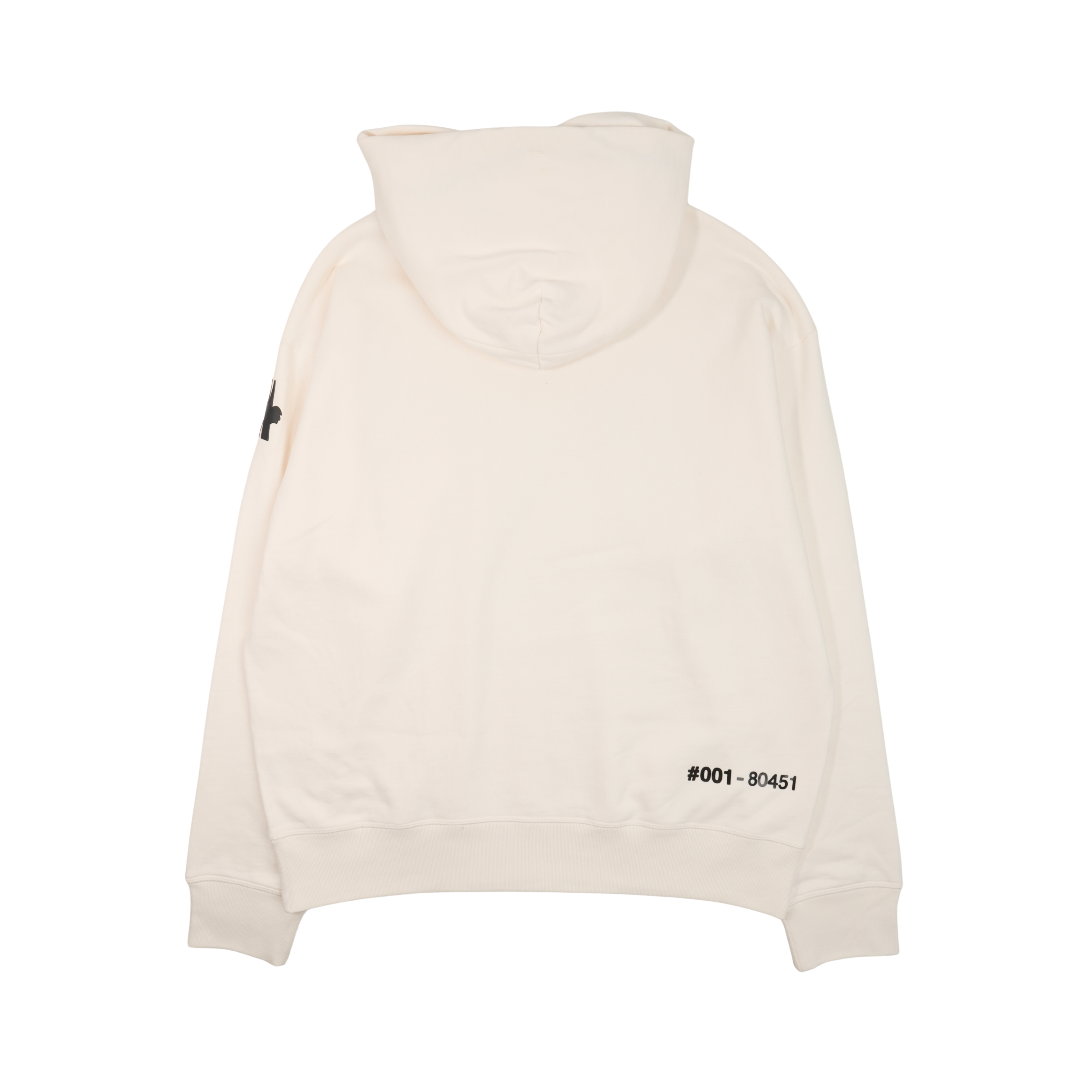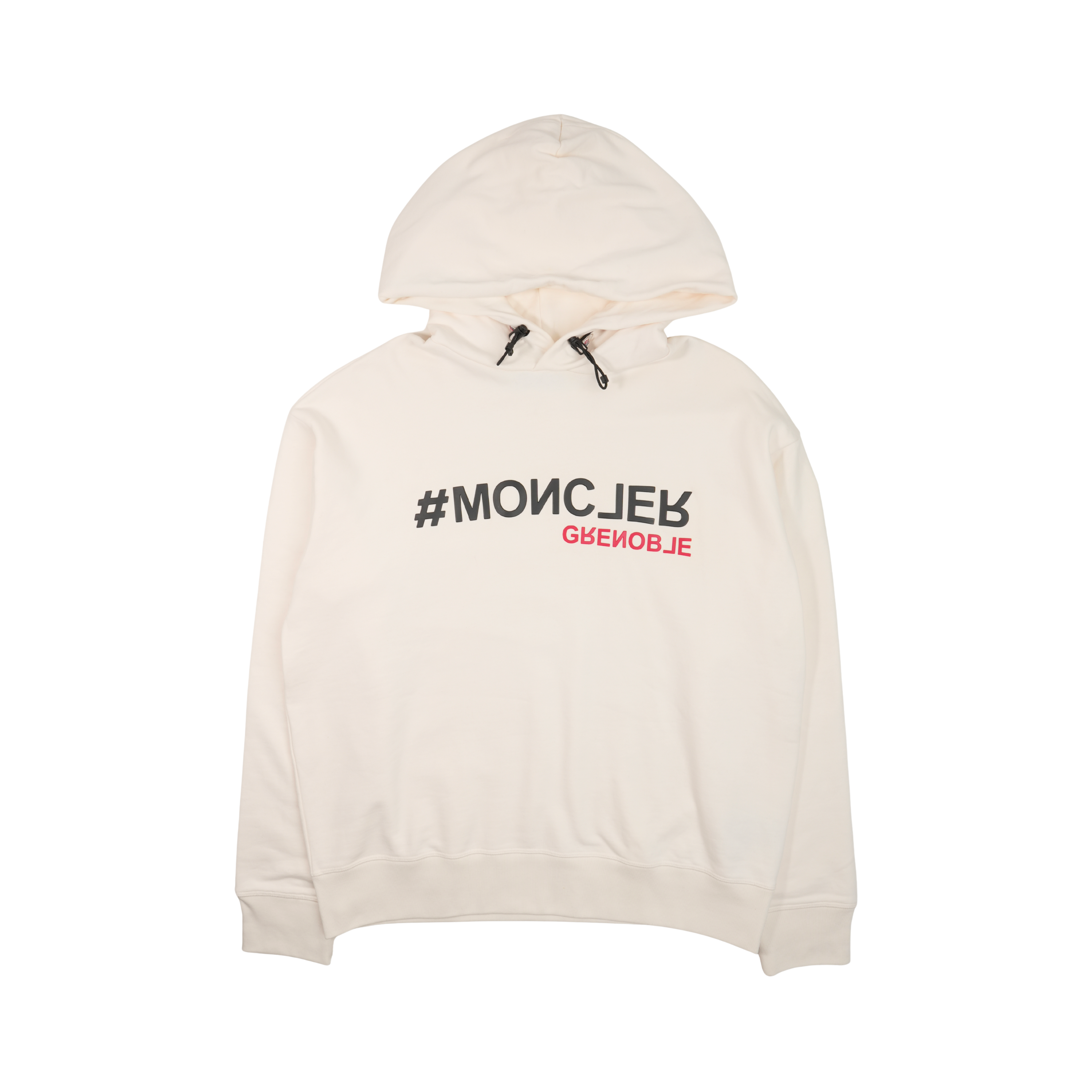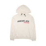 Moncler Grenoble hoodie in cream cotton with a large raised red and black twisted logo graphic on the chest and black drawstrings at the hood.