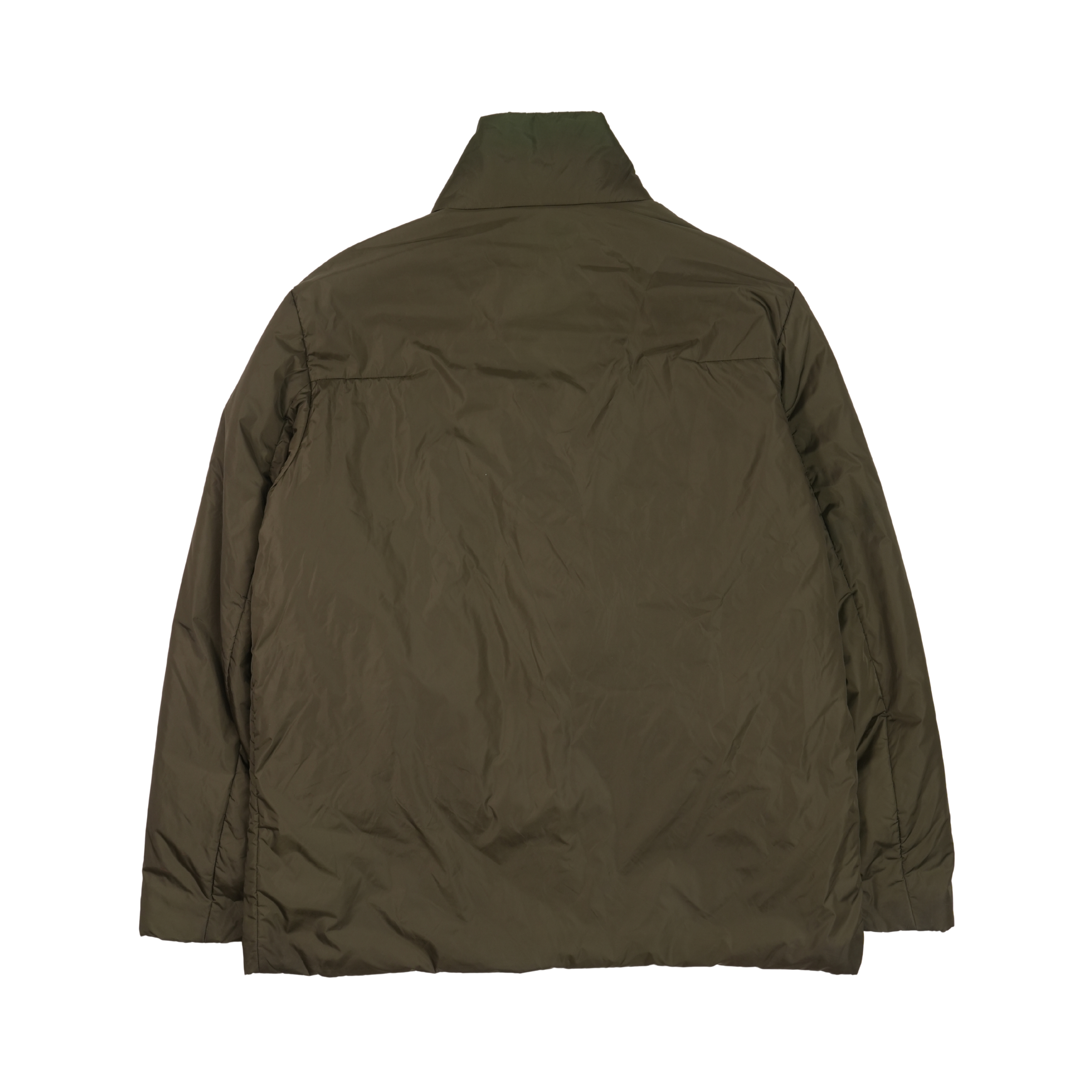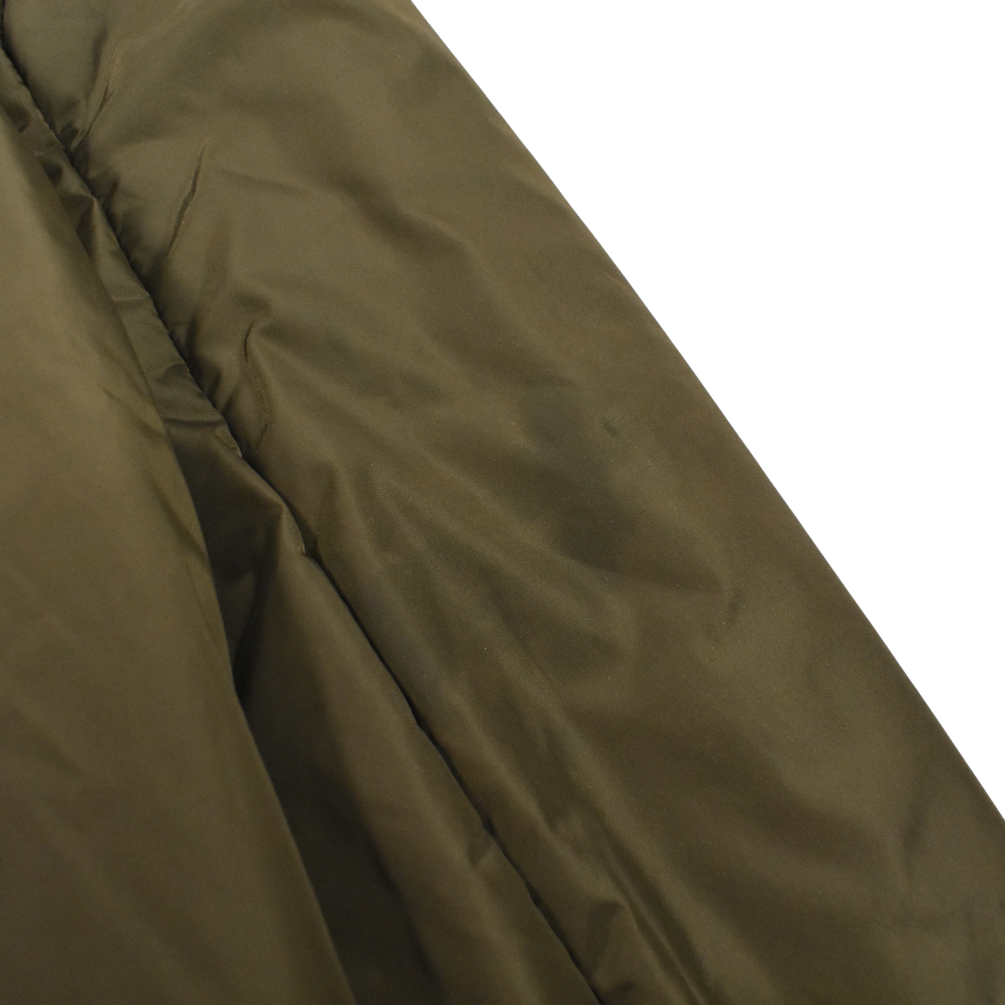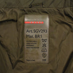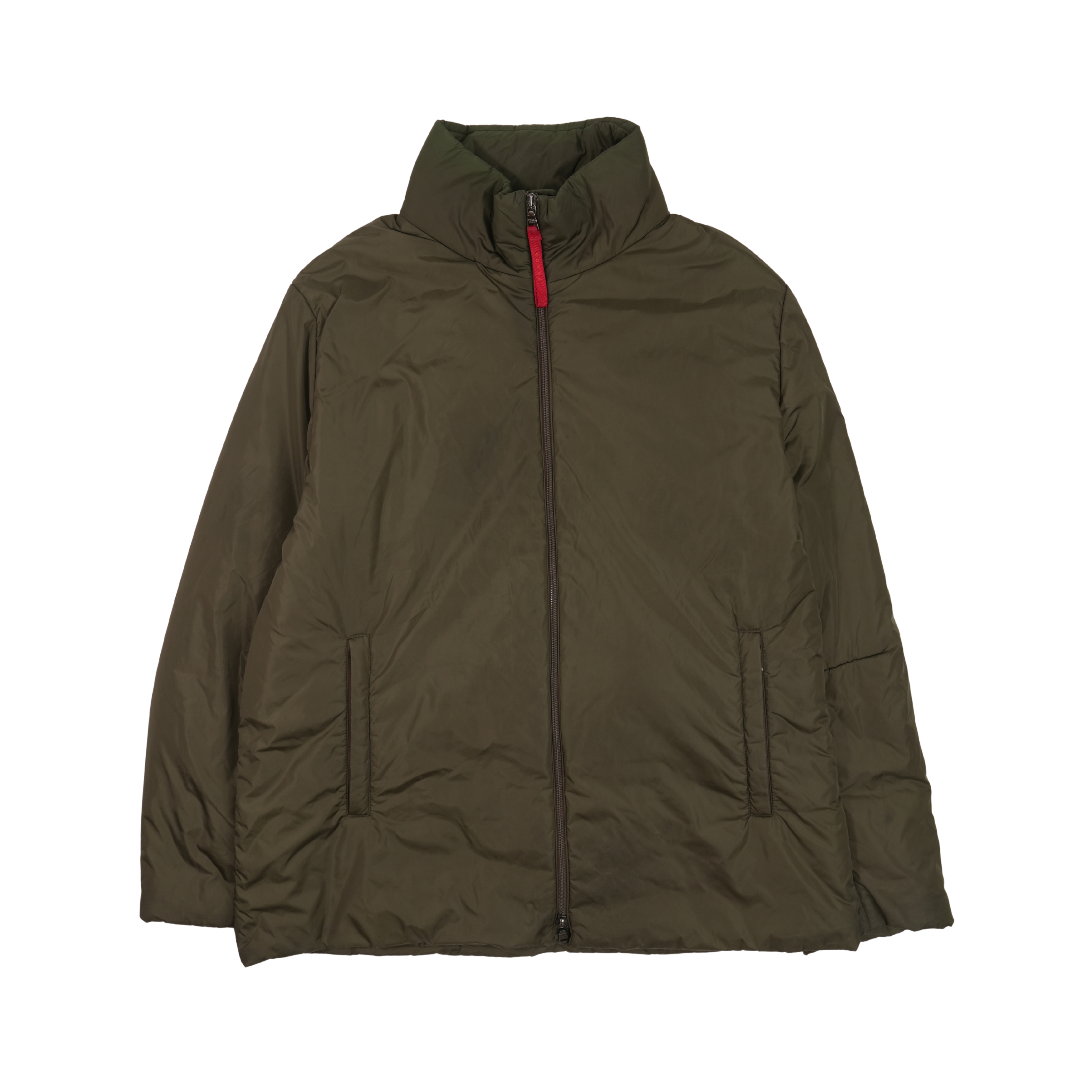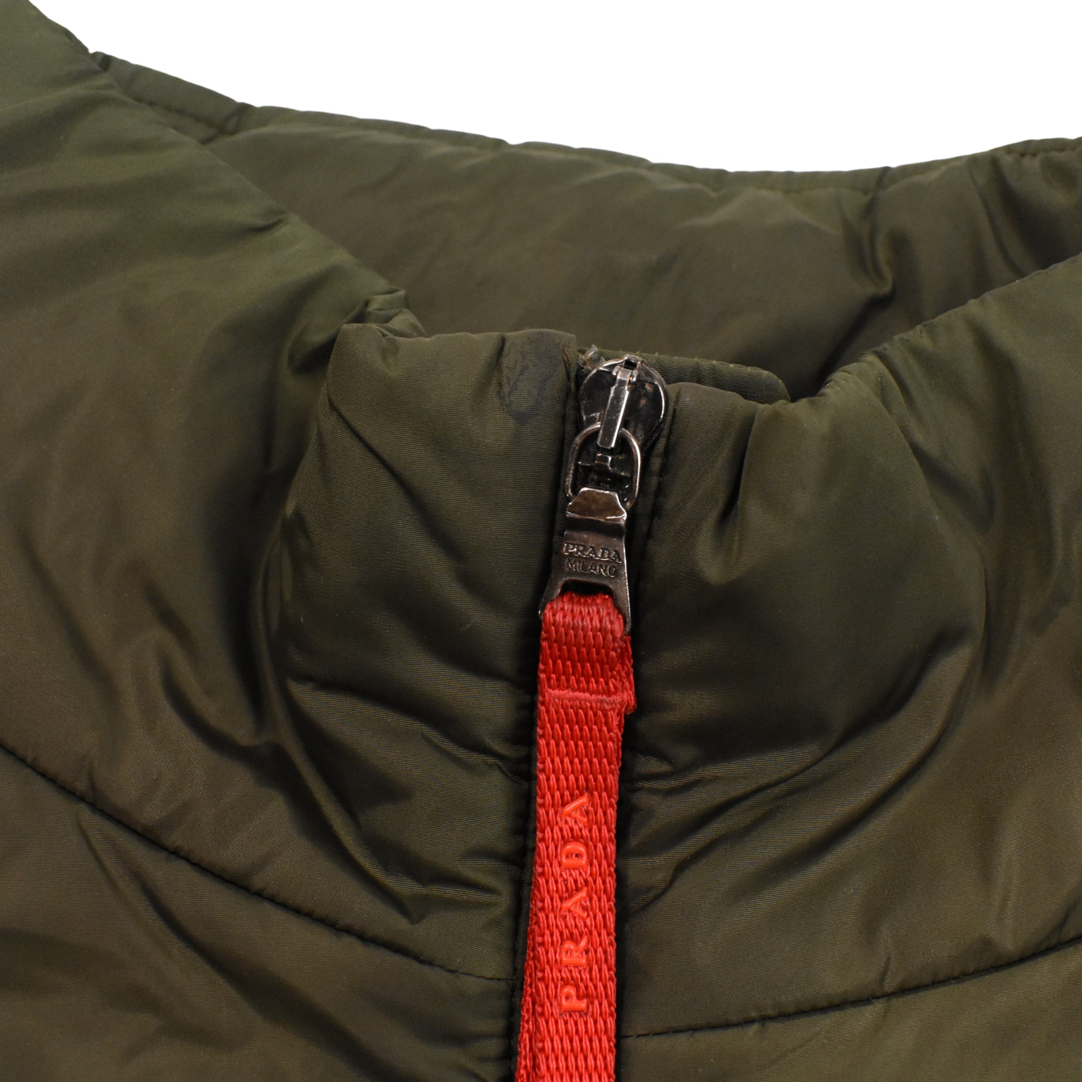Prada Nylon lightweight puffer jacket in army green with a funnel neck collar, tonal two-way zipper and red zipper pull. Features cinched underlayer cuff and cinched hem lining for wind resistance.
