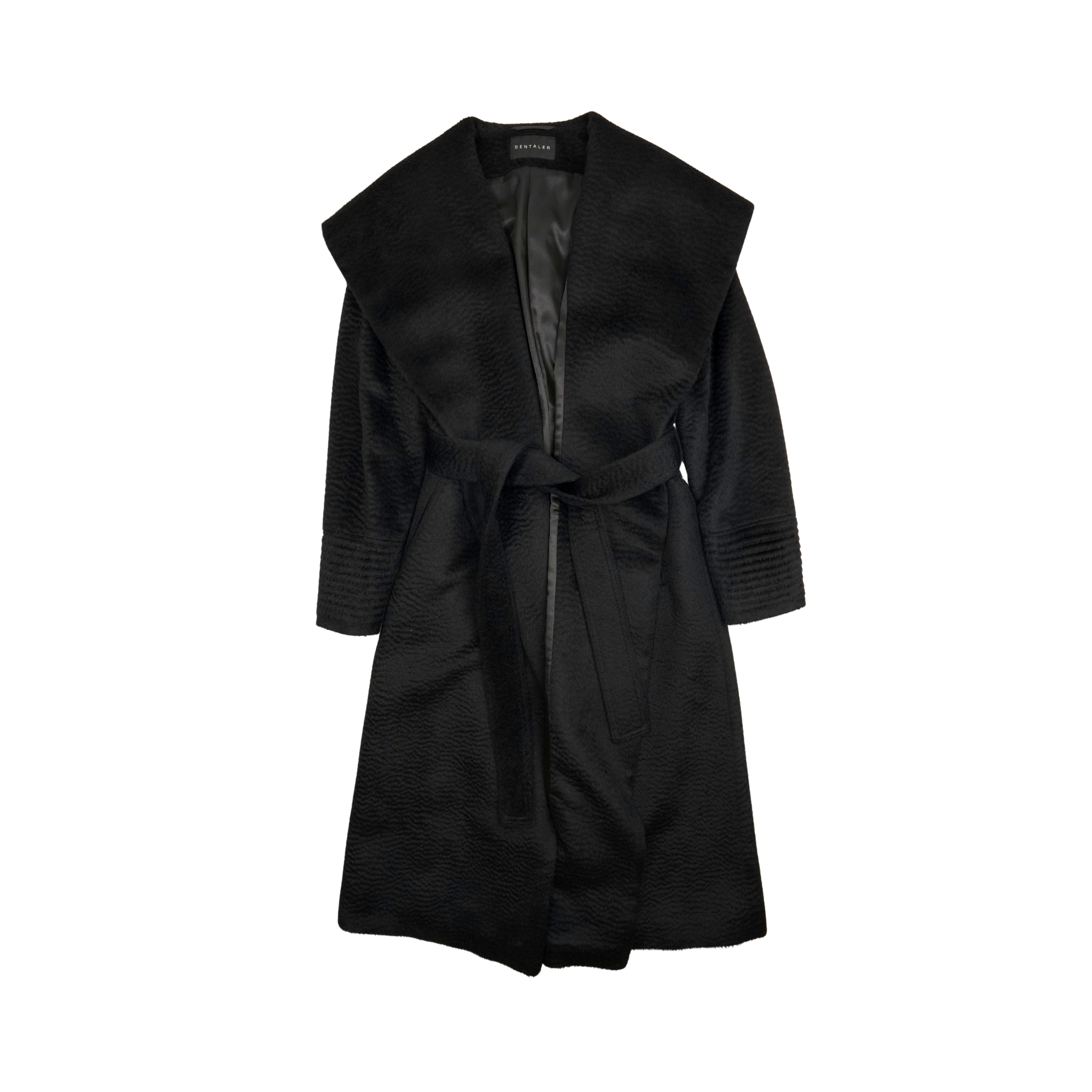 Sentaler 'Alpaca Long' wrap coat in black alpaca wool with a wide shawl collar and a wrap belt at the waist.