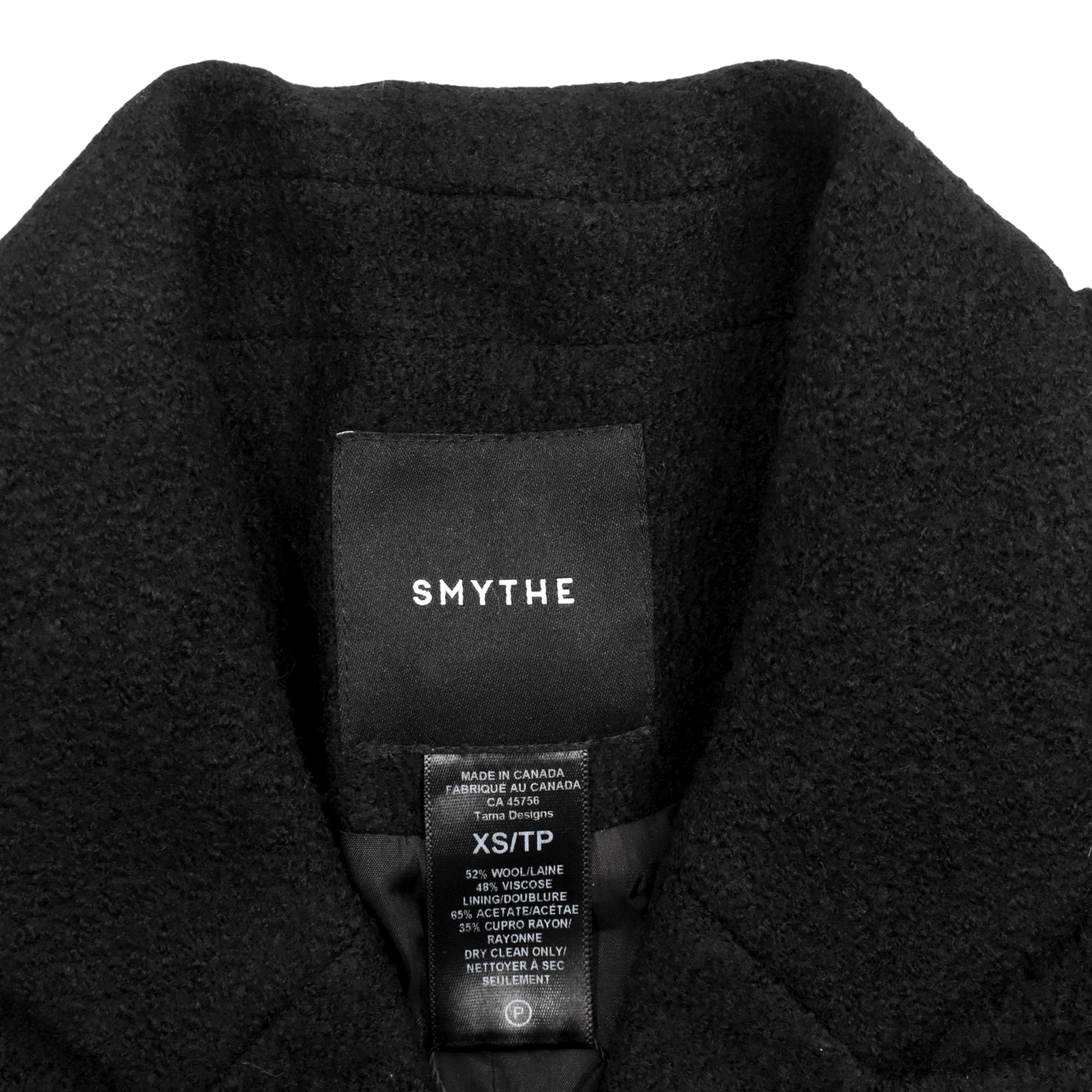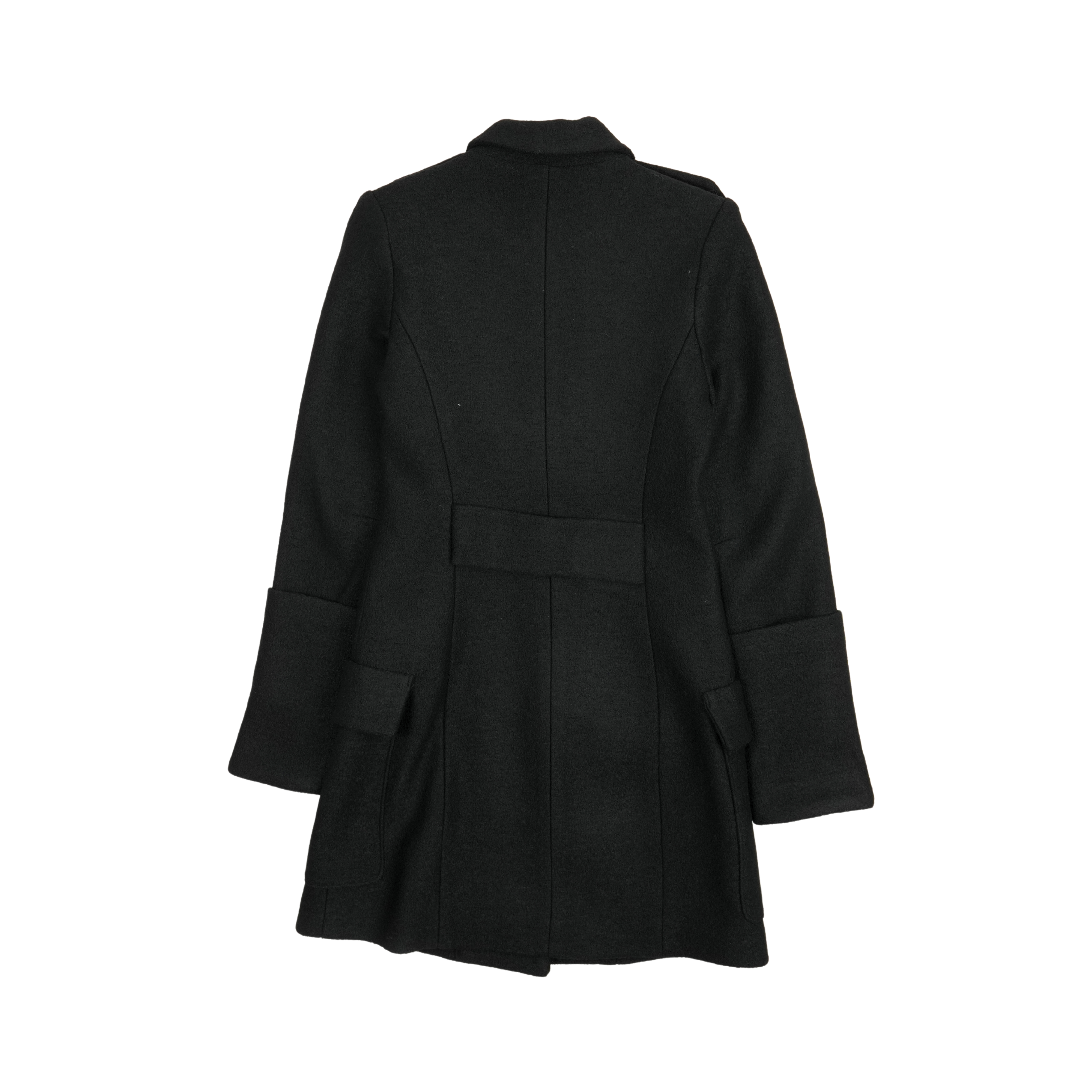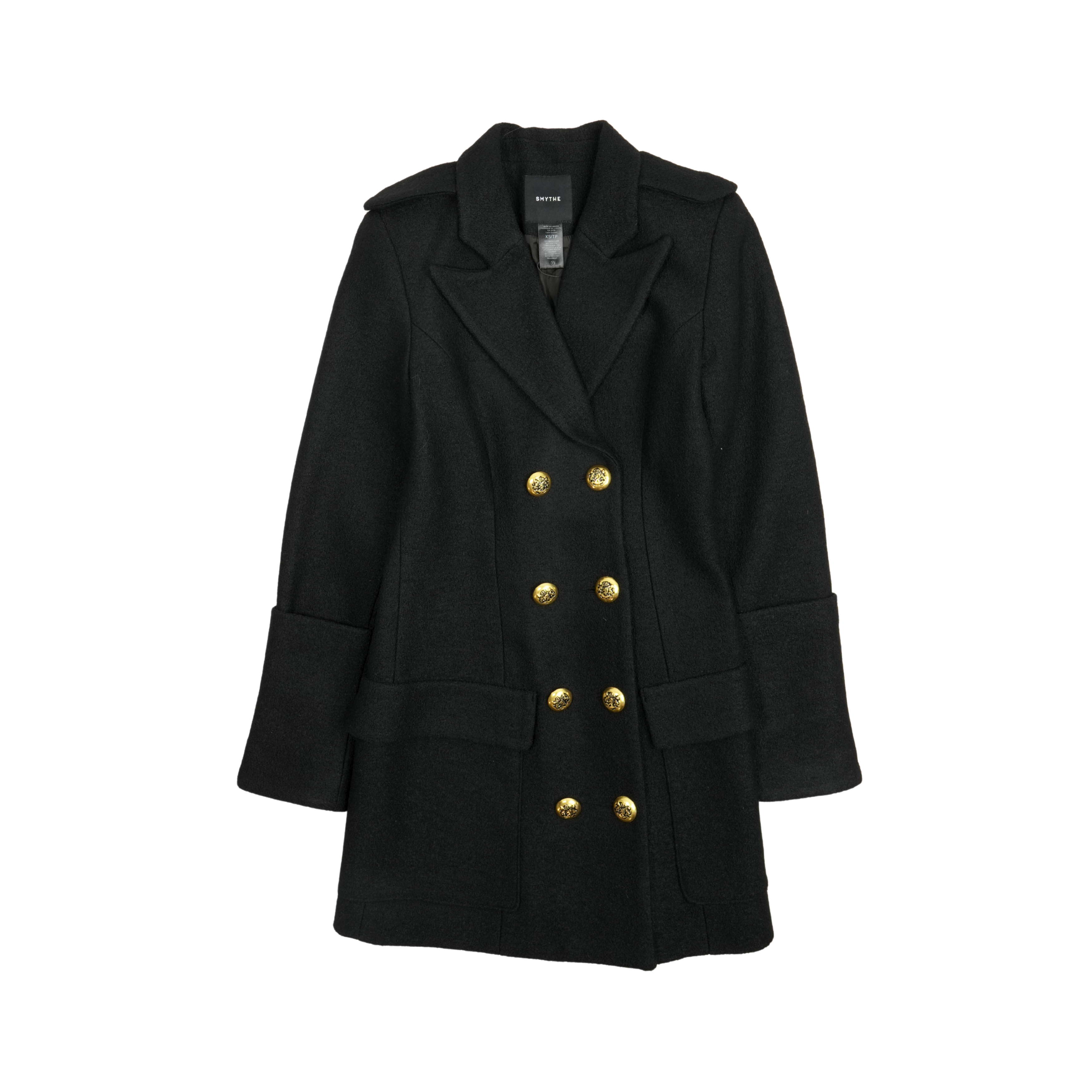 Smythe mid-length double breasted coat in black boiled wool with two front flap pockets, shoulder epaulettes, stylized notch collar and extended cuffs. Features oversized buttons with lion decal in gold hardware.