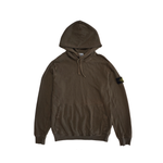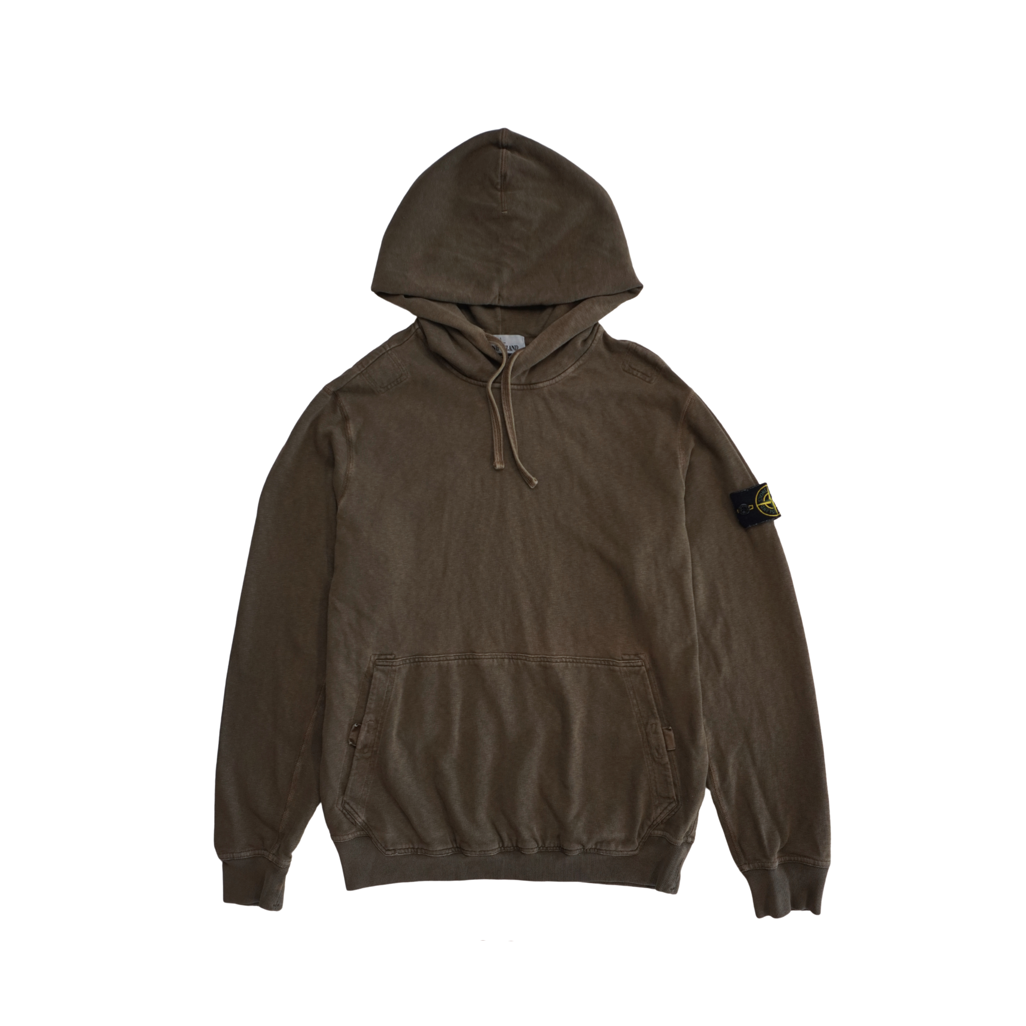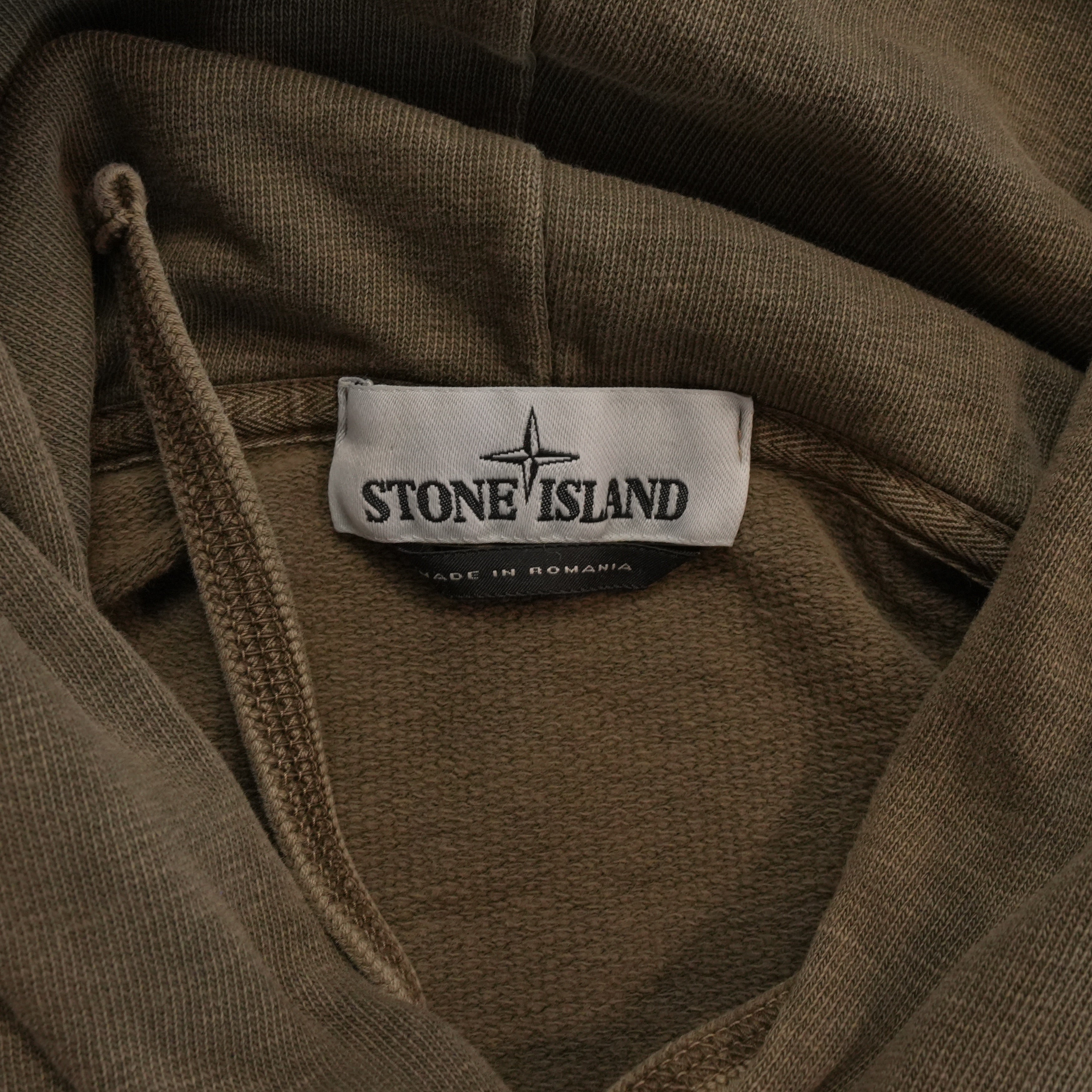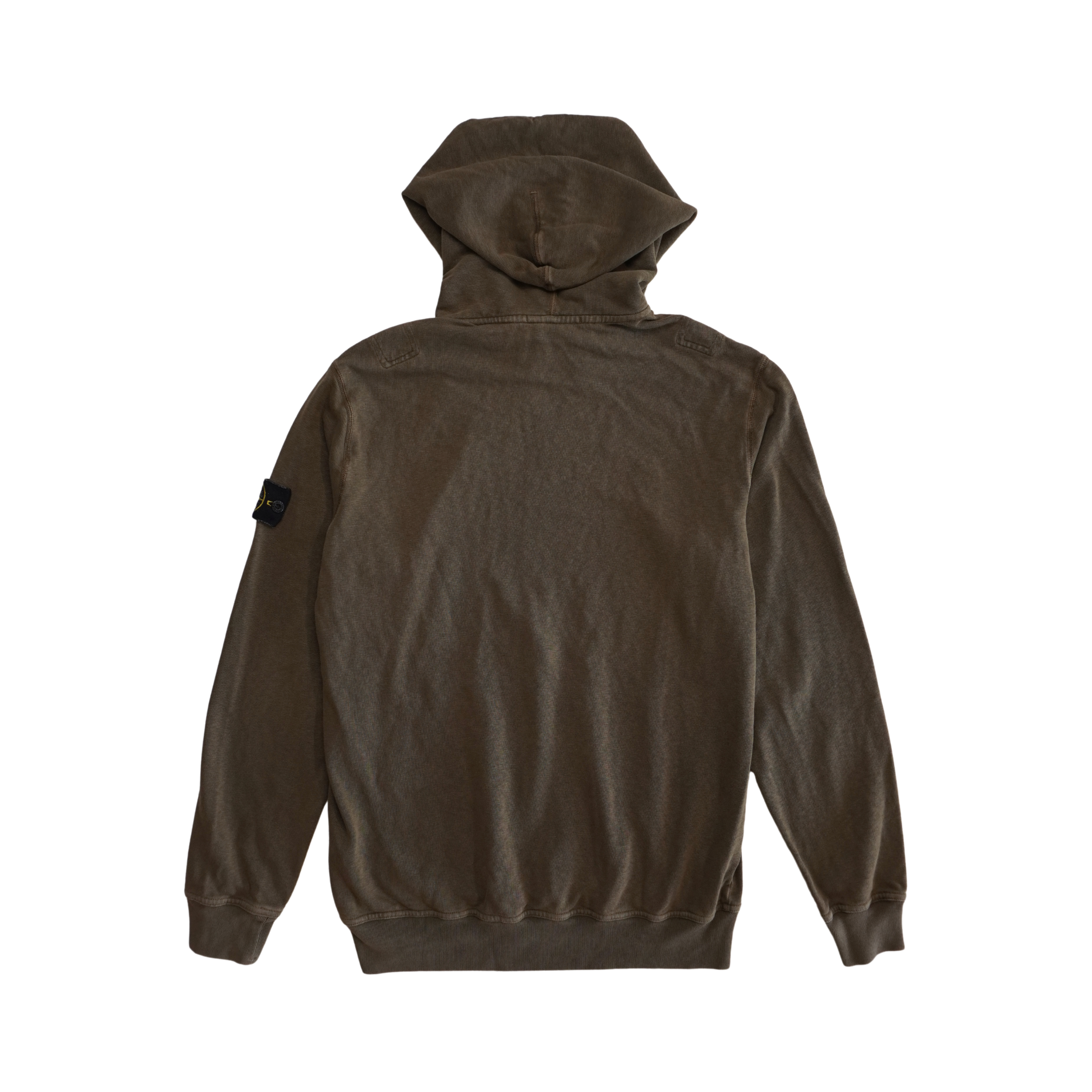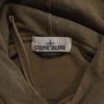 Stone Island hoodie in olive faded cotton with front kangaroo pocket with snap buttons, thick drawstrings and shoulder patch stitching. Featuring removable logo arm patch.