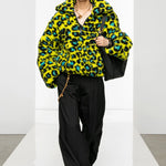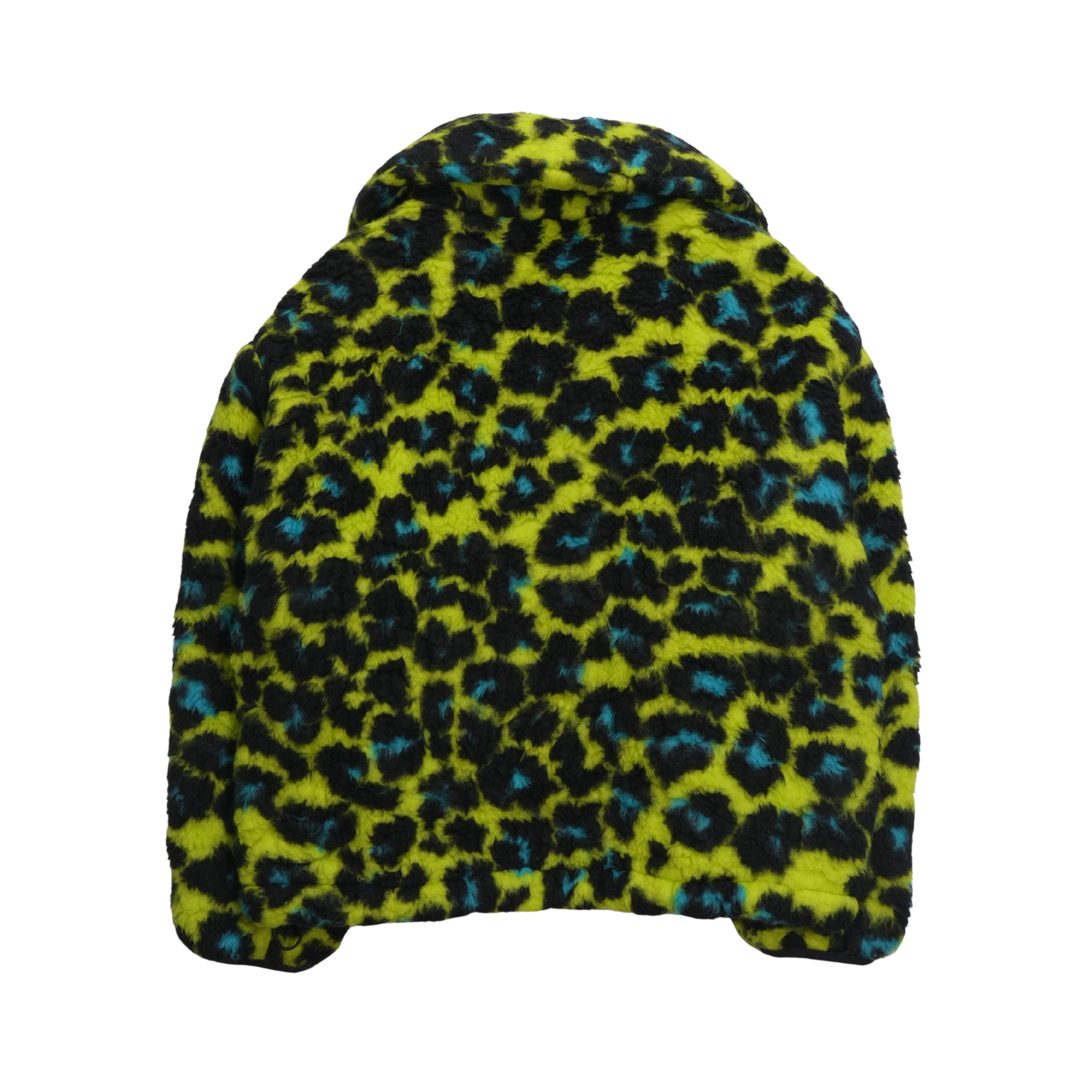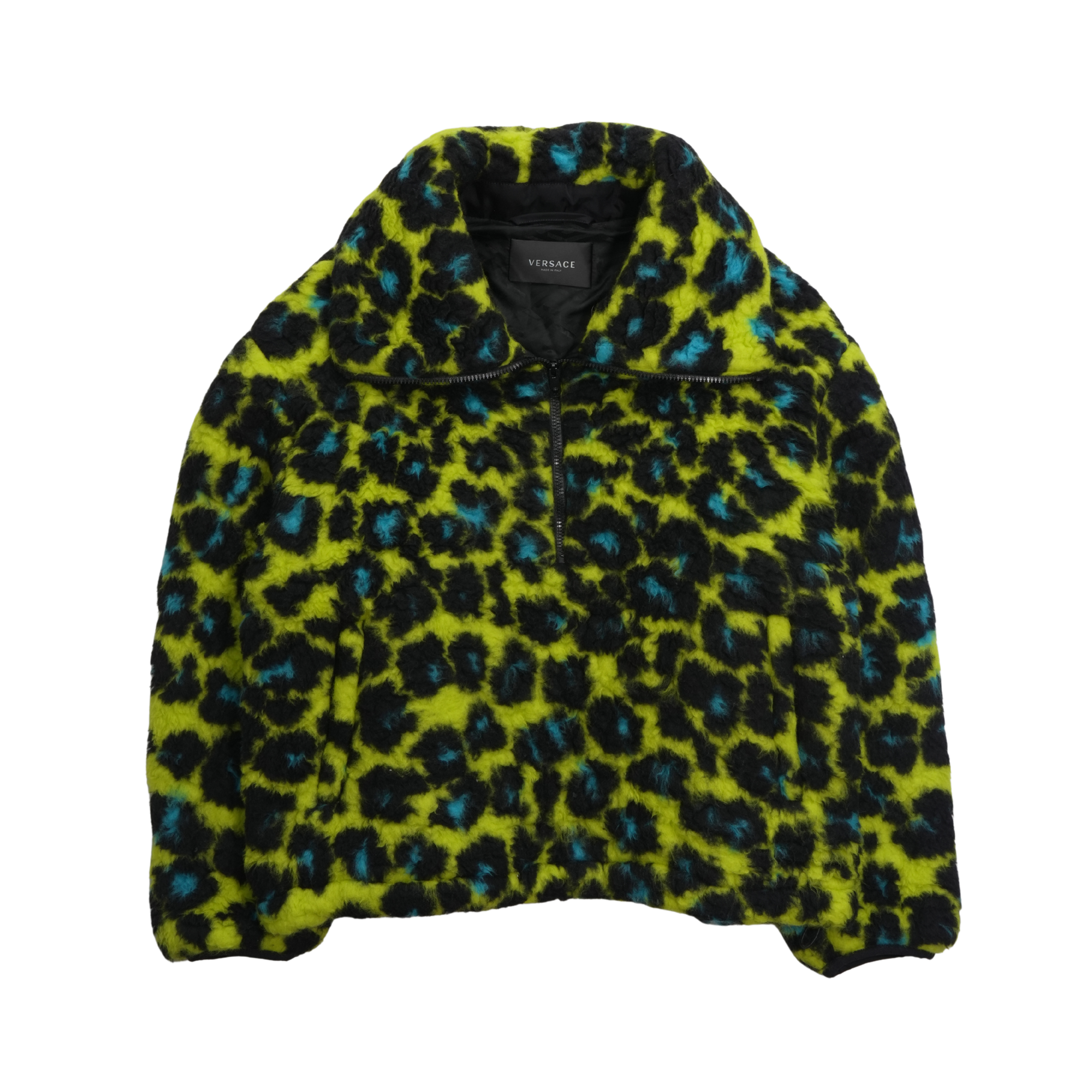 Versace half-zip jacket in fuzzy neon yellow, blue, and black animal print with a tall stand collar and drawstring hem. As seen on the fall-winter 2022 runway.