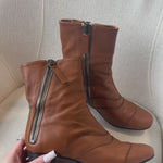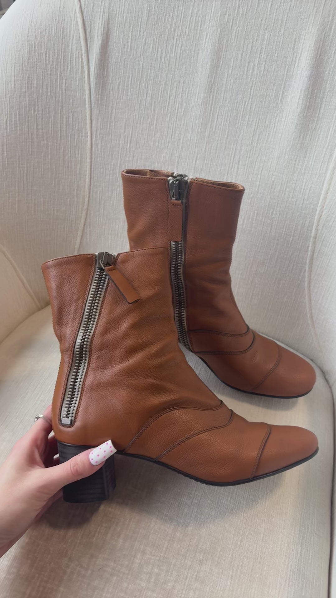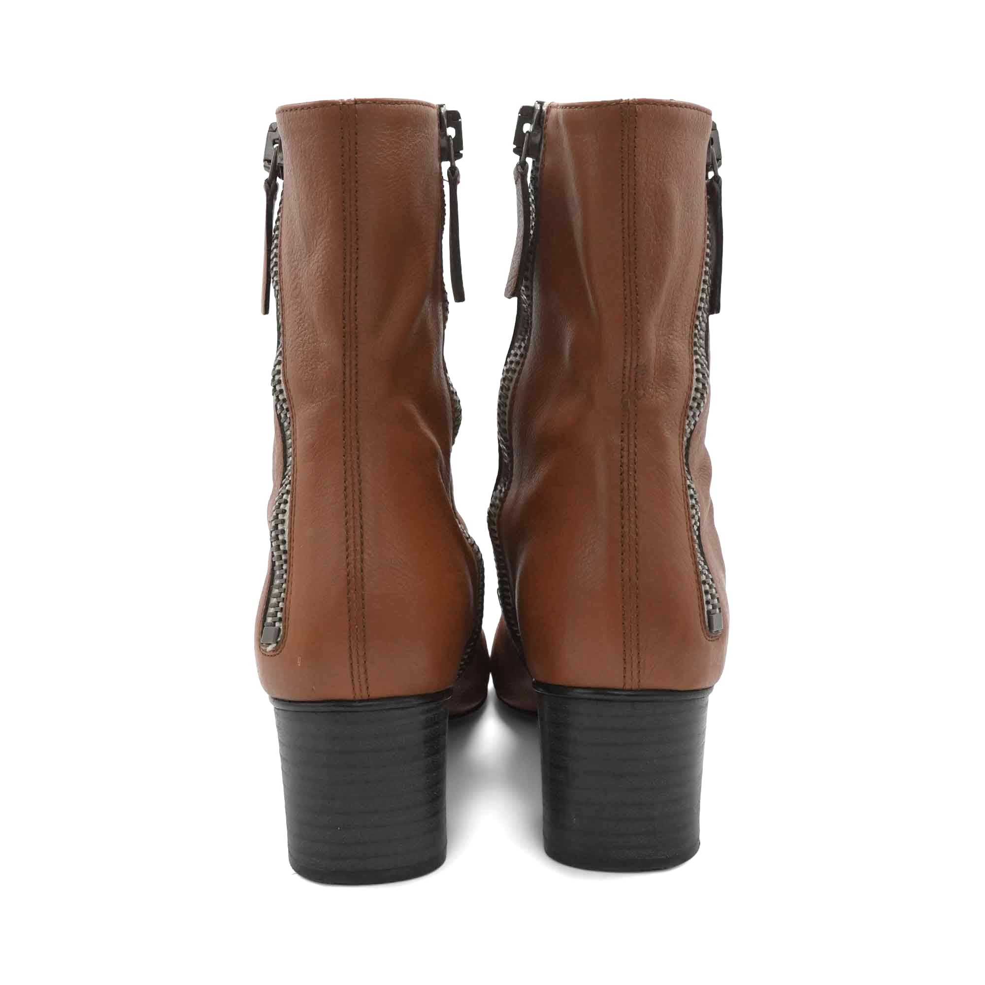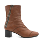 Chloe ‘Lexie’ ankle boots in caramel brown leather with curved panels, exposed side zipper on both sides of the ankle and stacked wood heel.