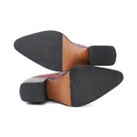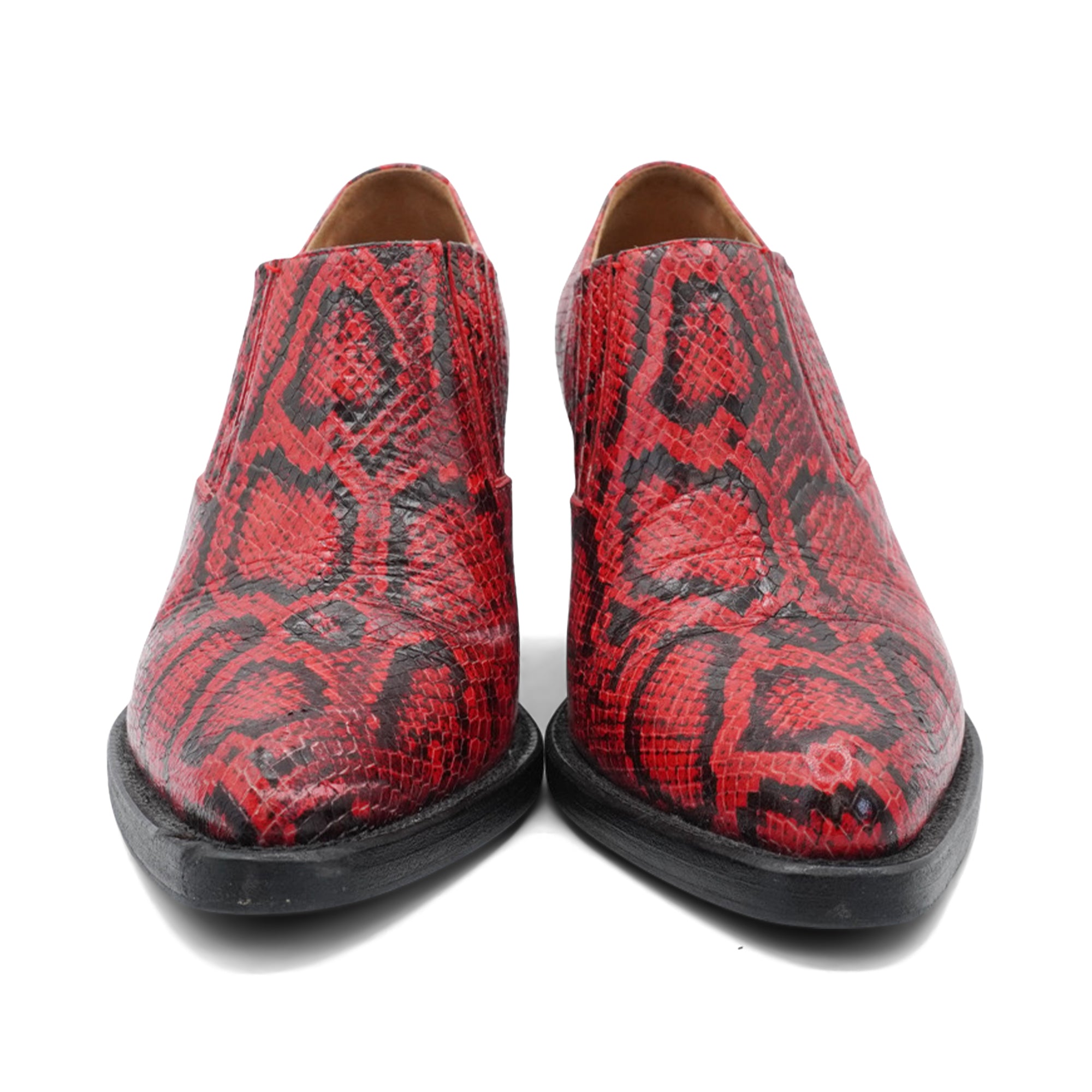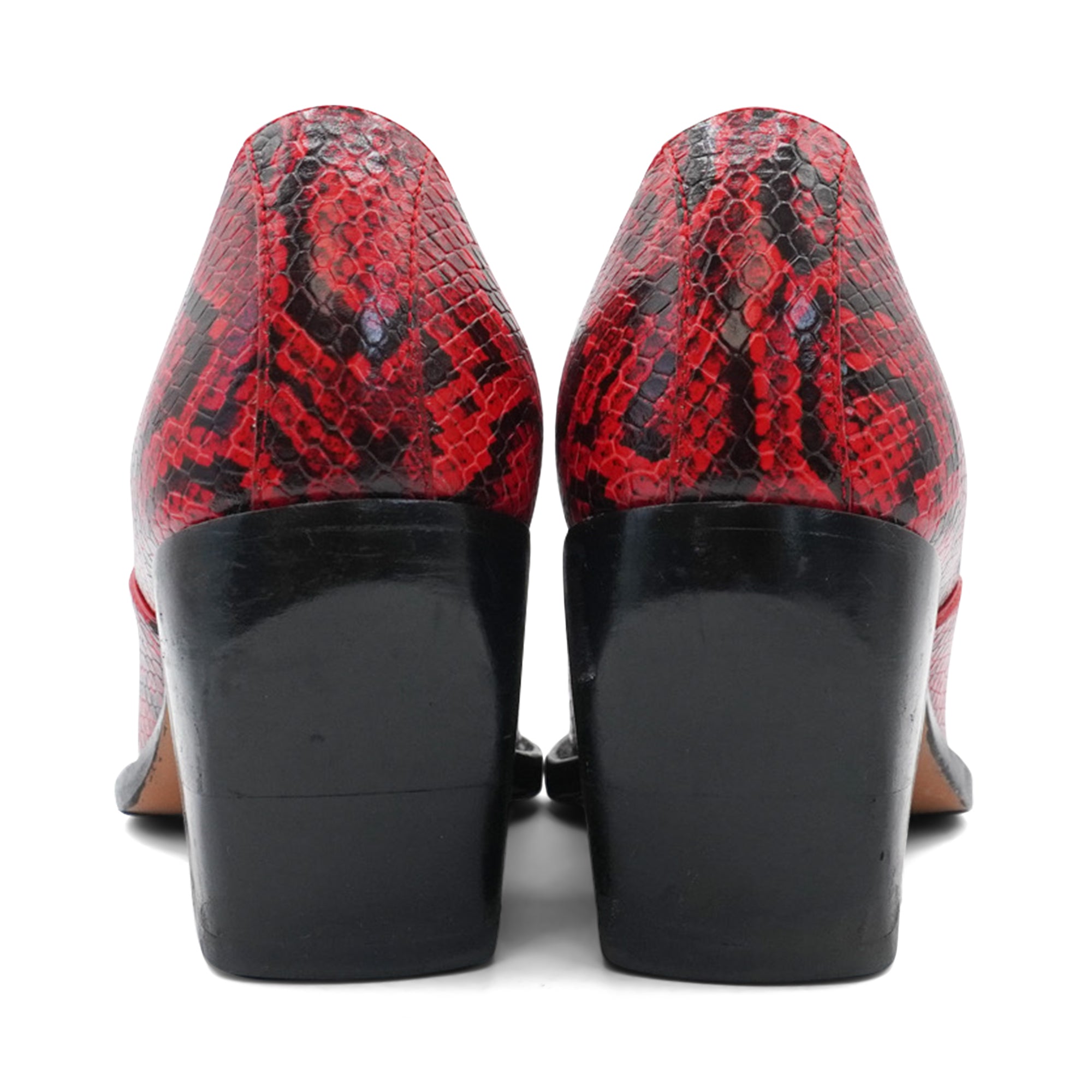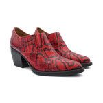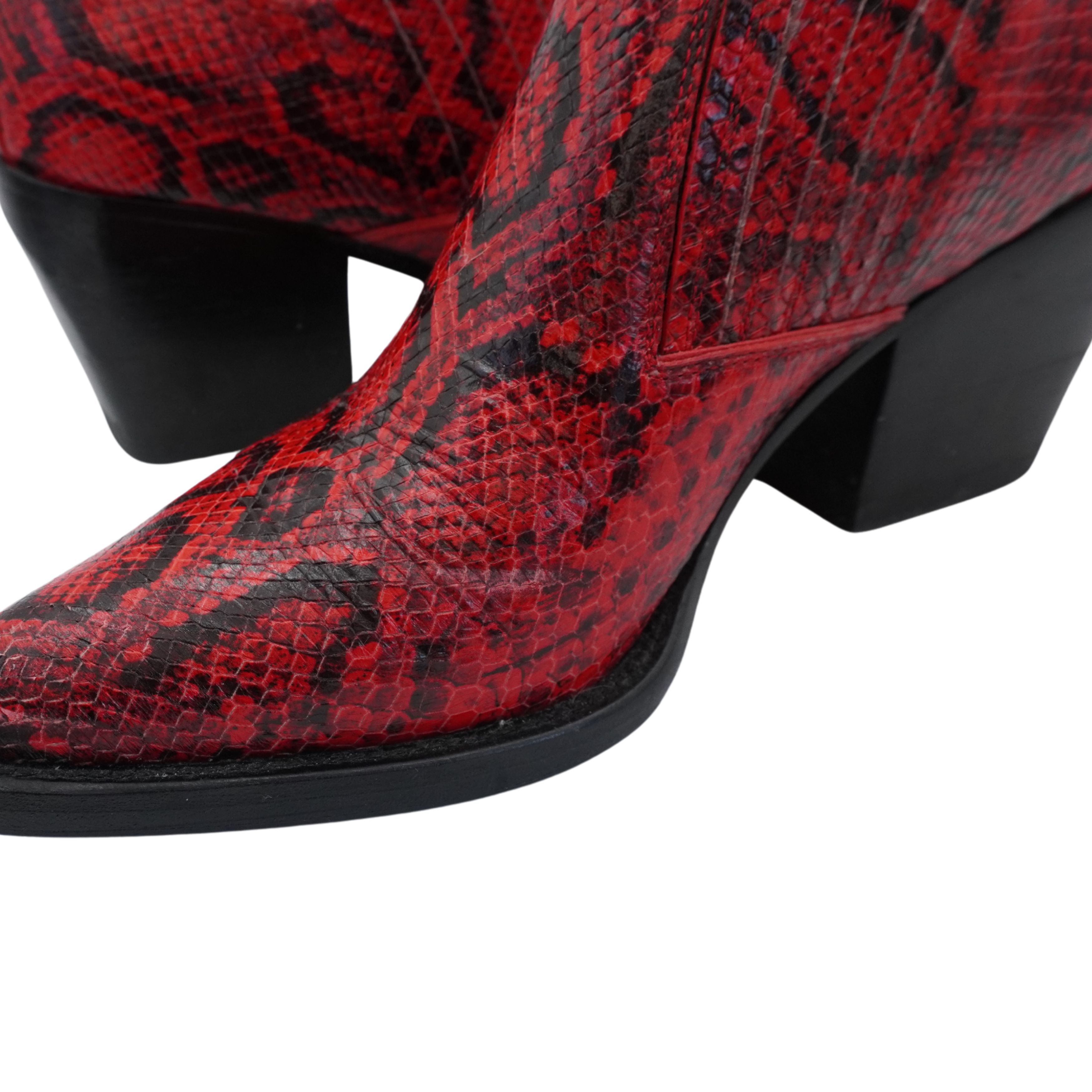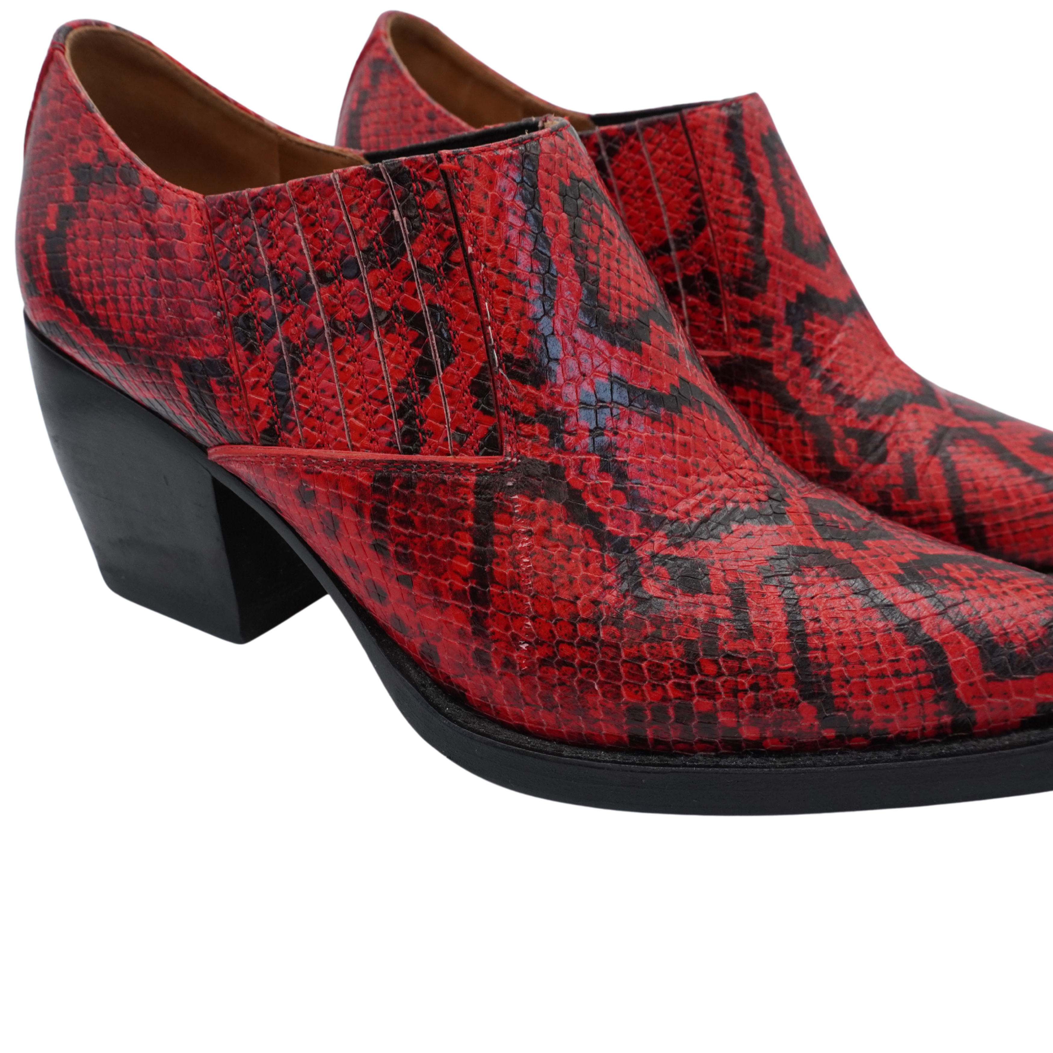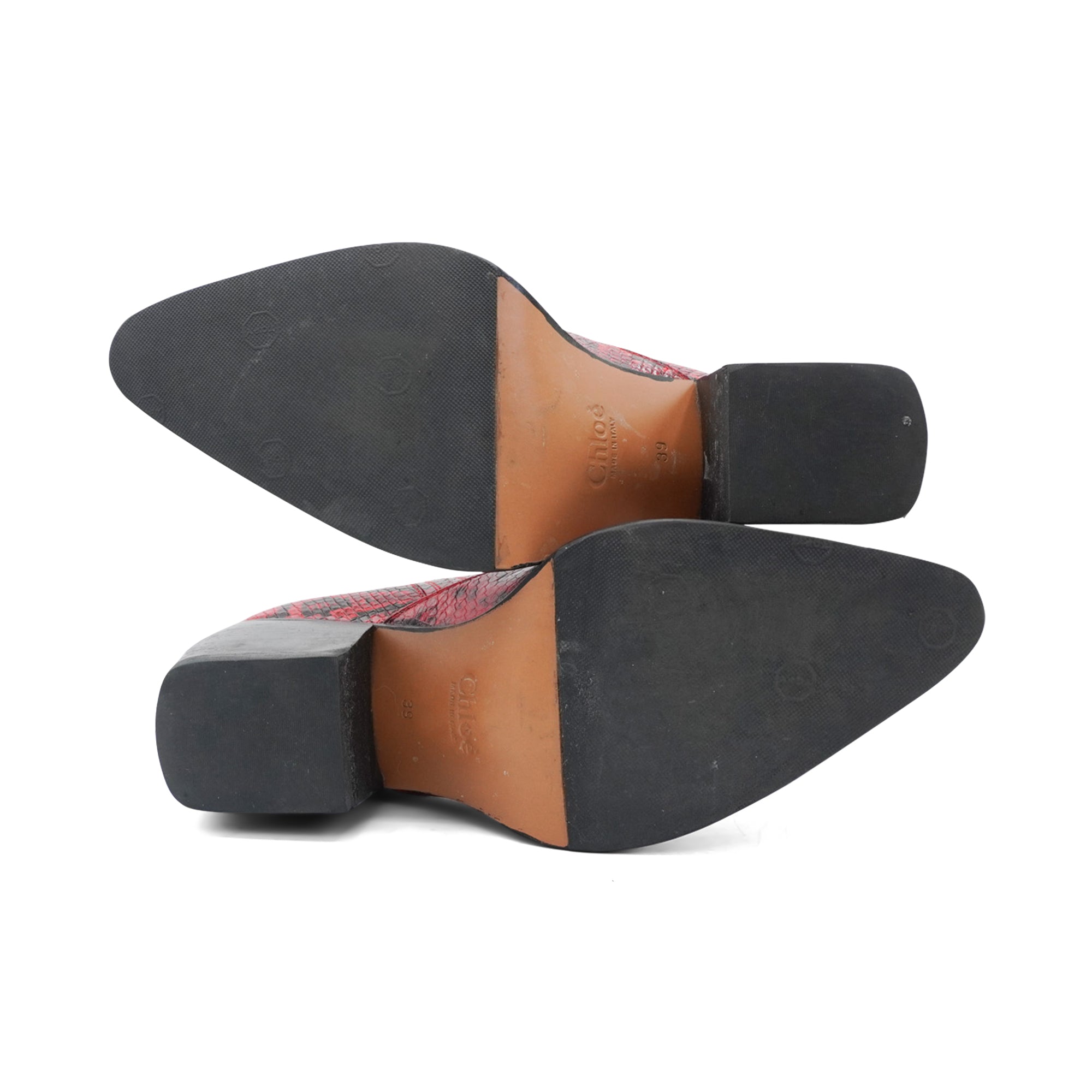 Chloe "Rylee' ankle boot with red and black python embossed print and black stacked chunky heel.