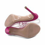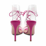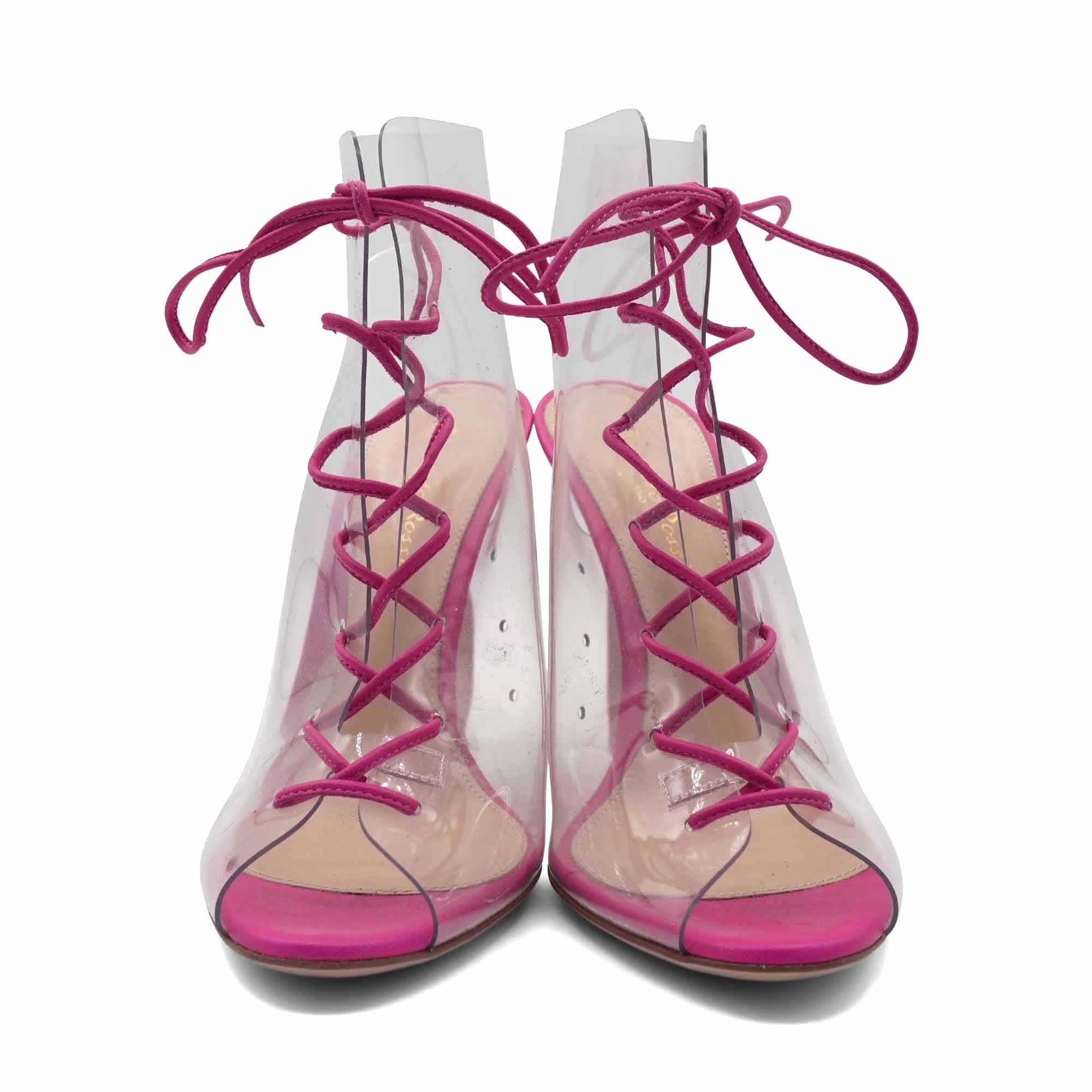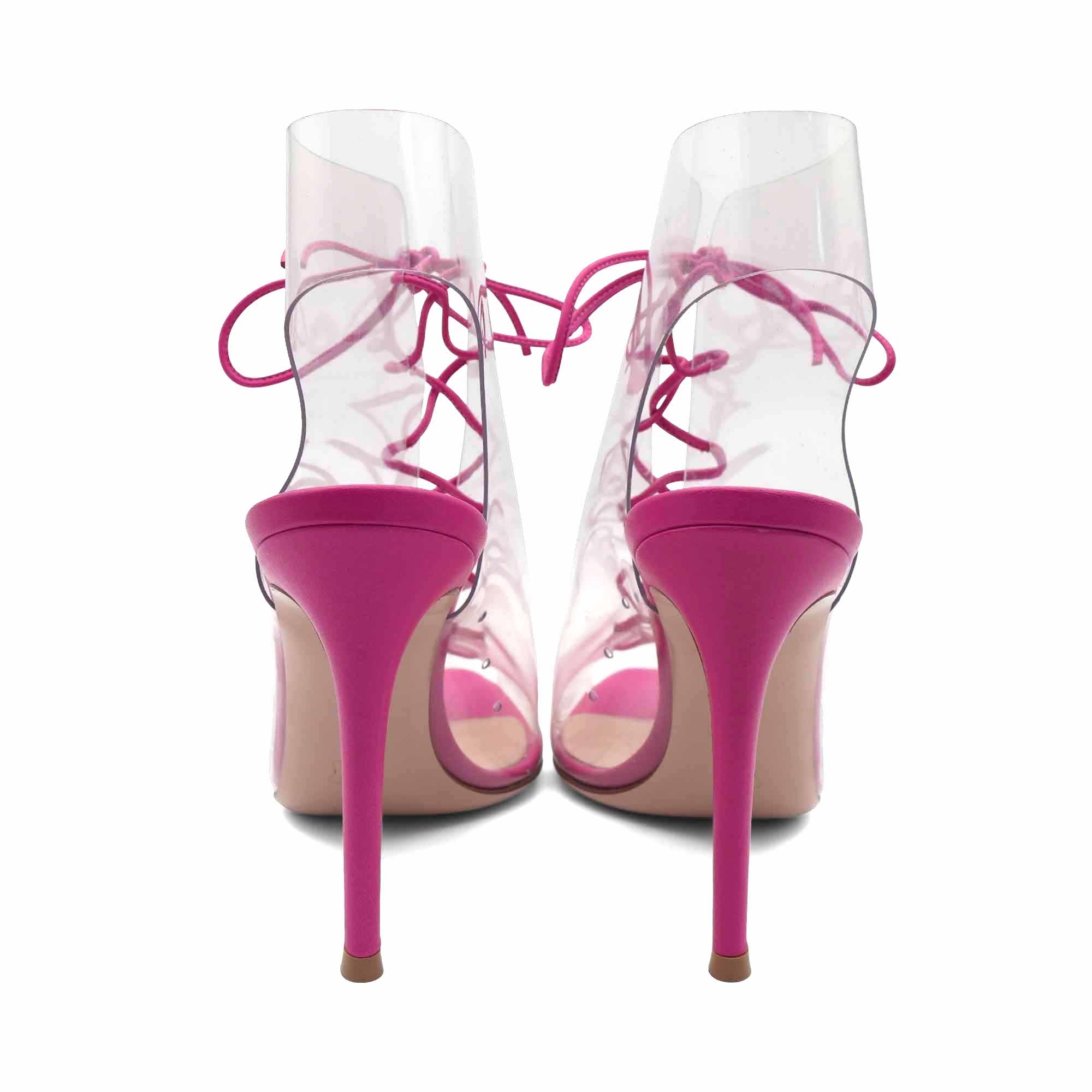Gianvito Rossi 'Helmut' peep-toe booties in clear PVC with hot pink leather laces and heels.