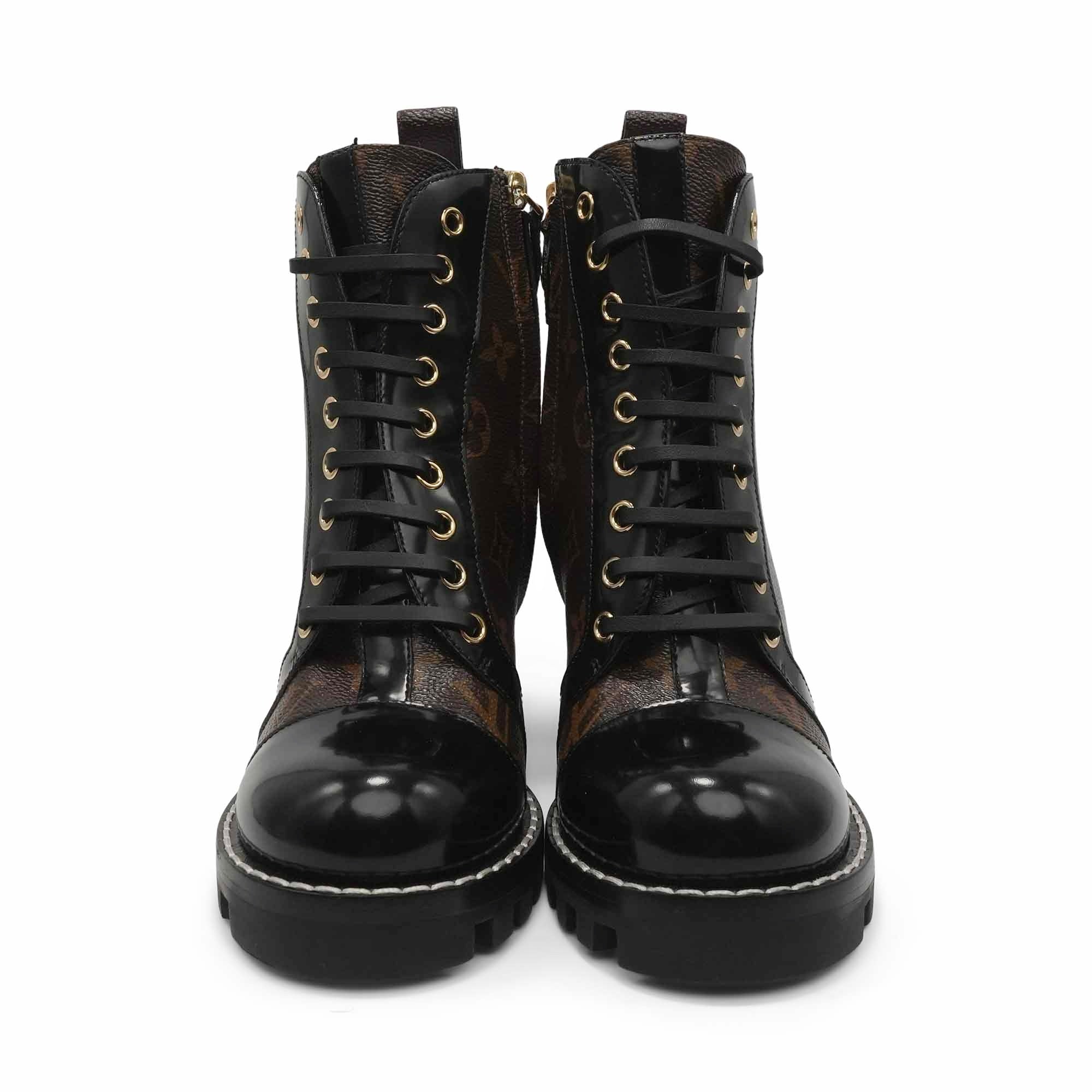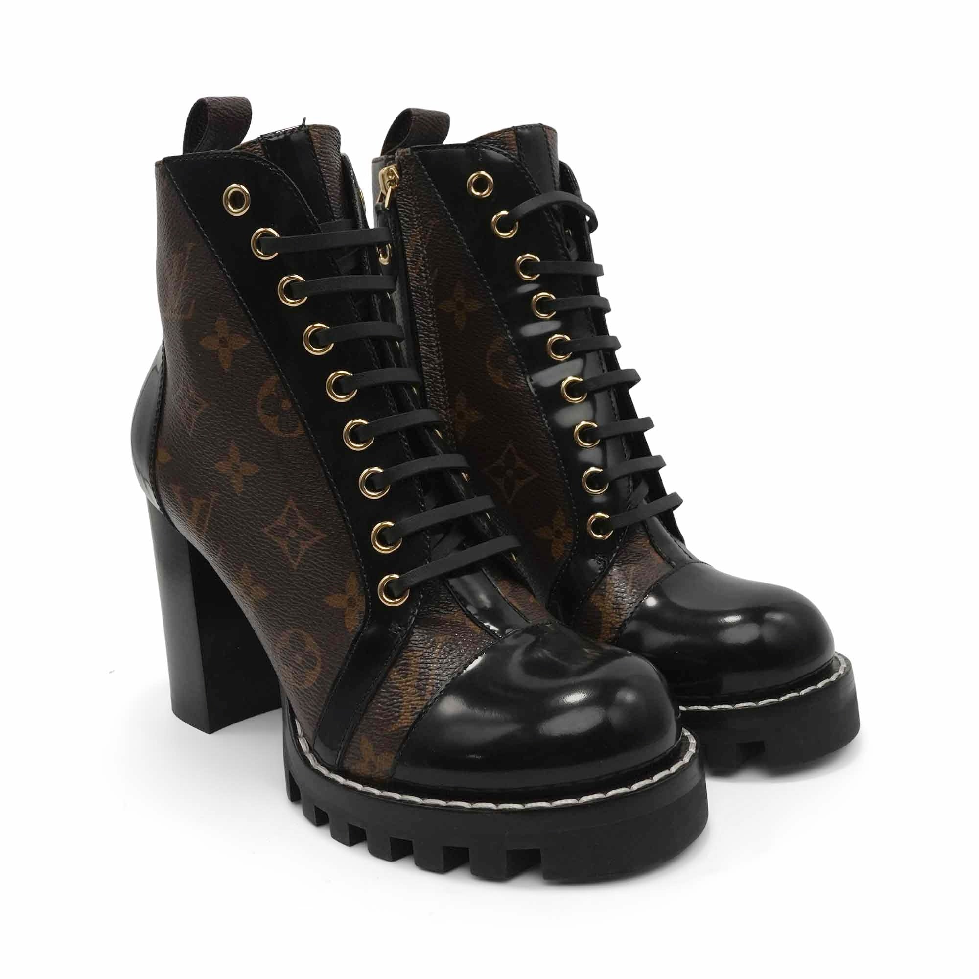 Louis Vuitton 'Star Trail' lace up ankle boots in patent monogram canvas and and black leather trim. Features a platform sole, a chunky heel and side zip closure with gold hardware.