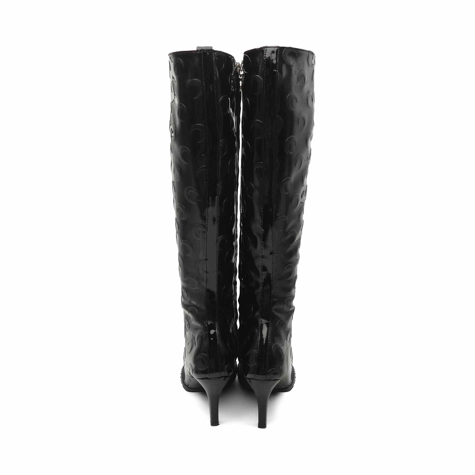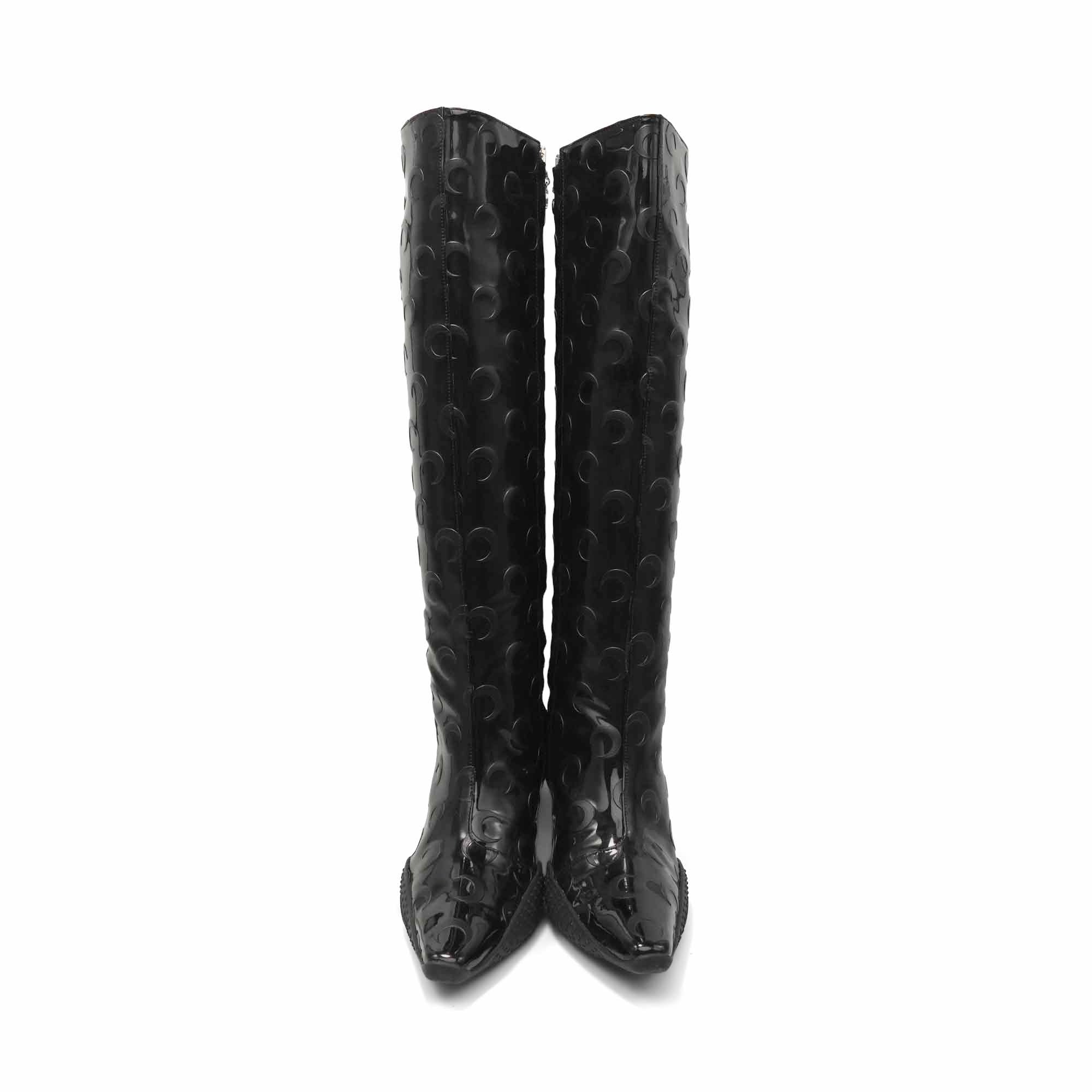 Marine Serre 'Maree Noir' SS20 knee high, crescent moon embossed, leather heeled boots which feature a pointed toe, a silver moon zipper pull on side zip fastening and a chunky rubber outsole. As seen on the Spring/Summer 2020 runway.