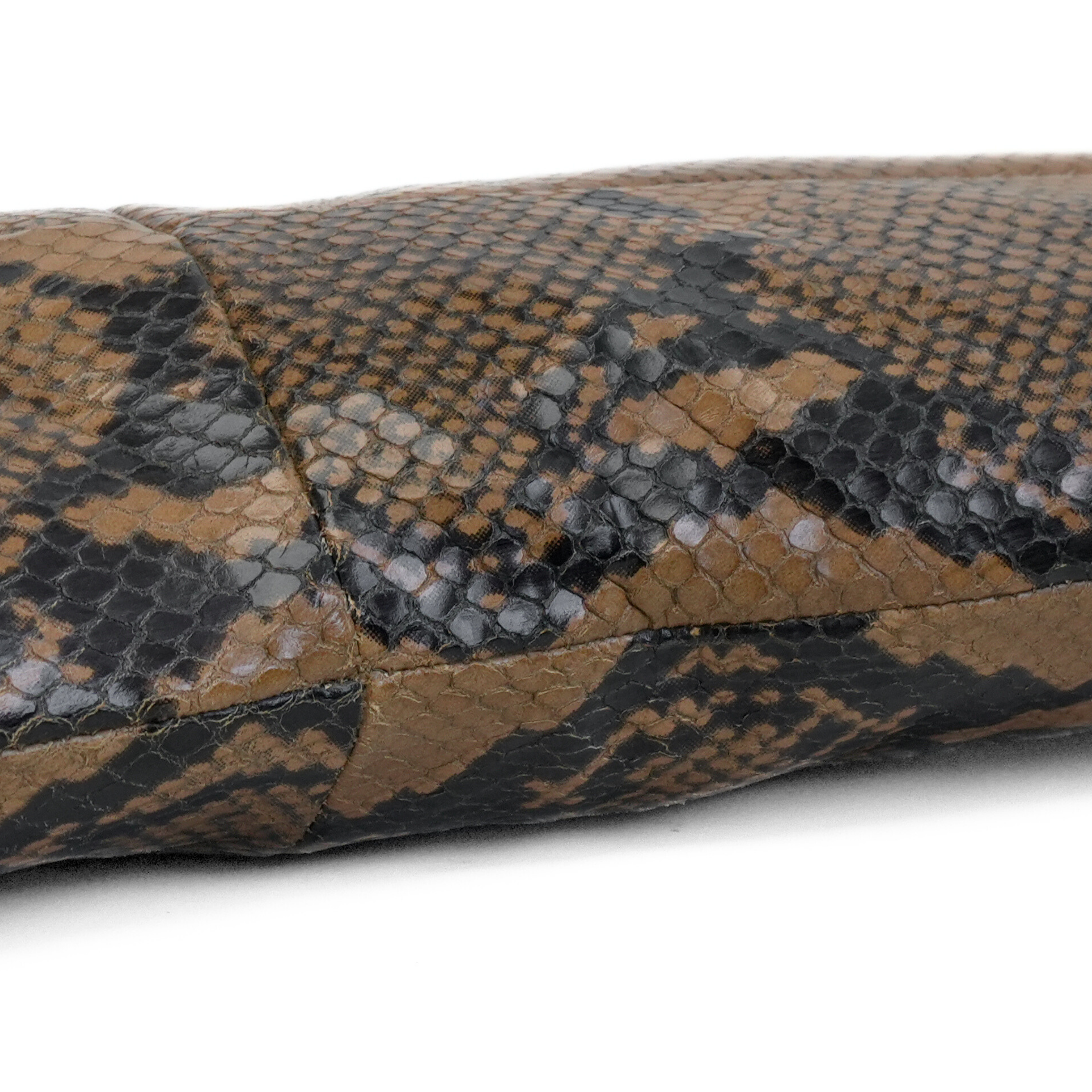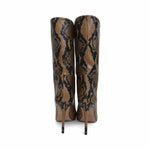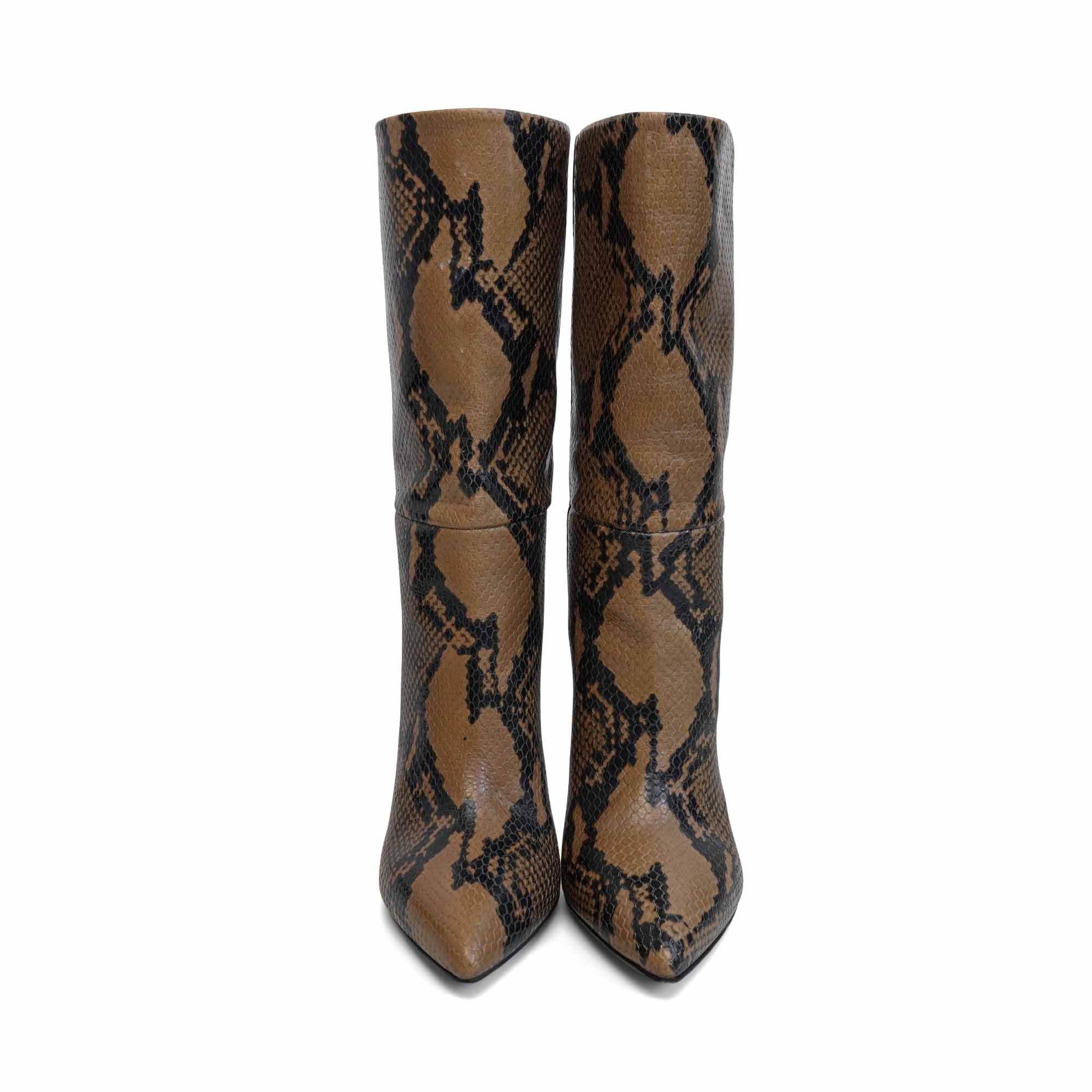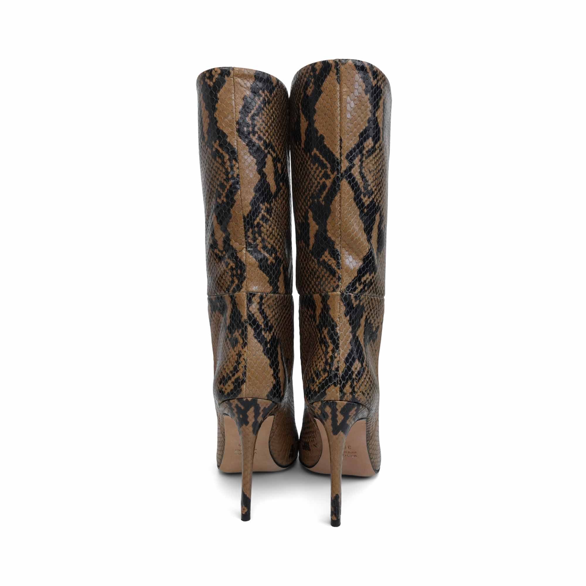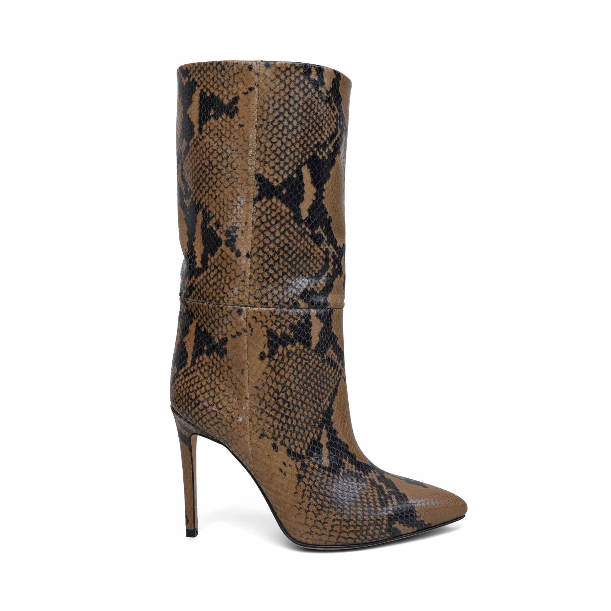 Paris Texas mid-calf boots in brown and black faux snakeskin leather with pointed toes and stiletto heels.