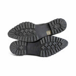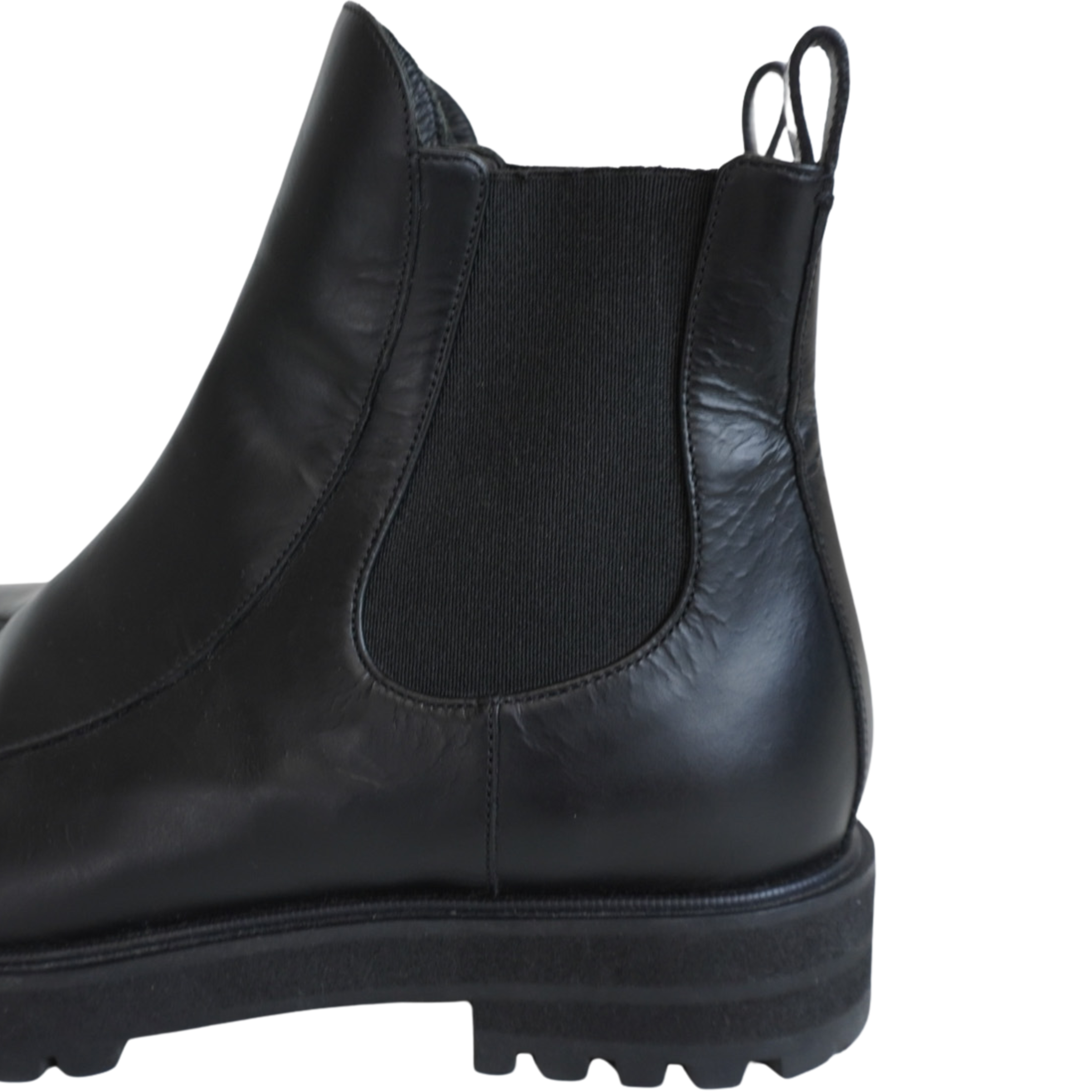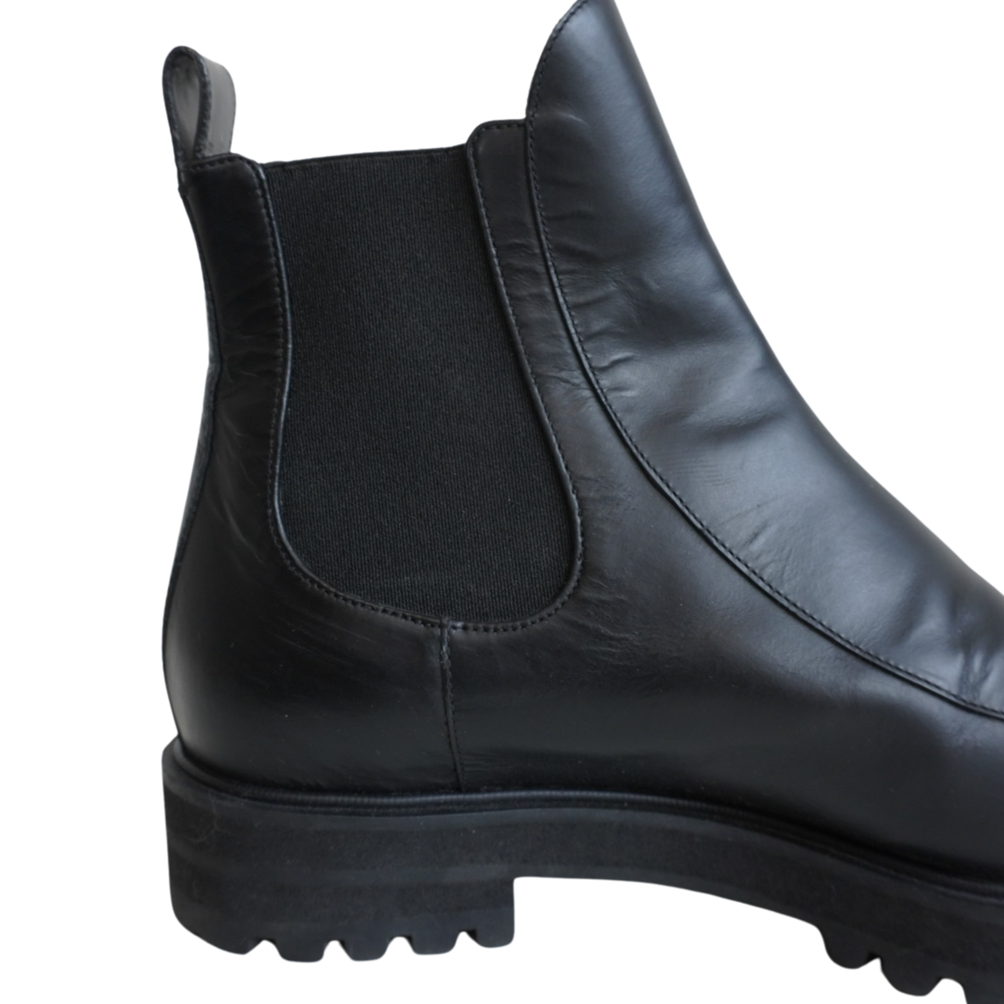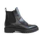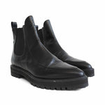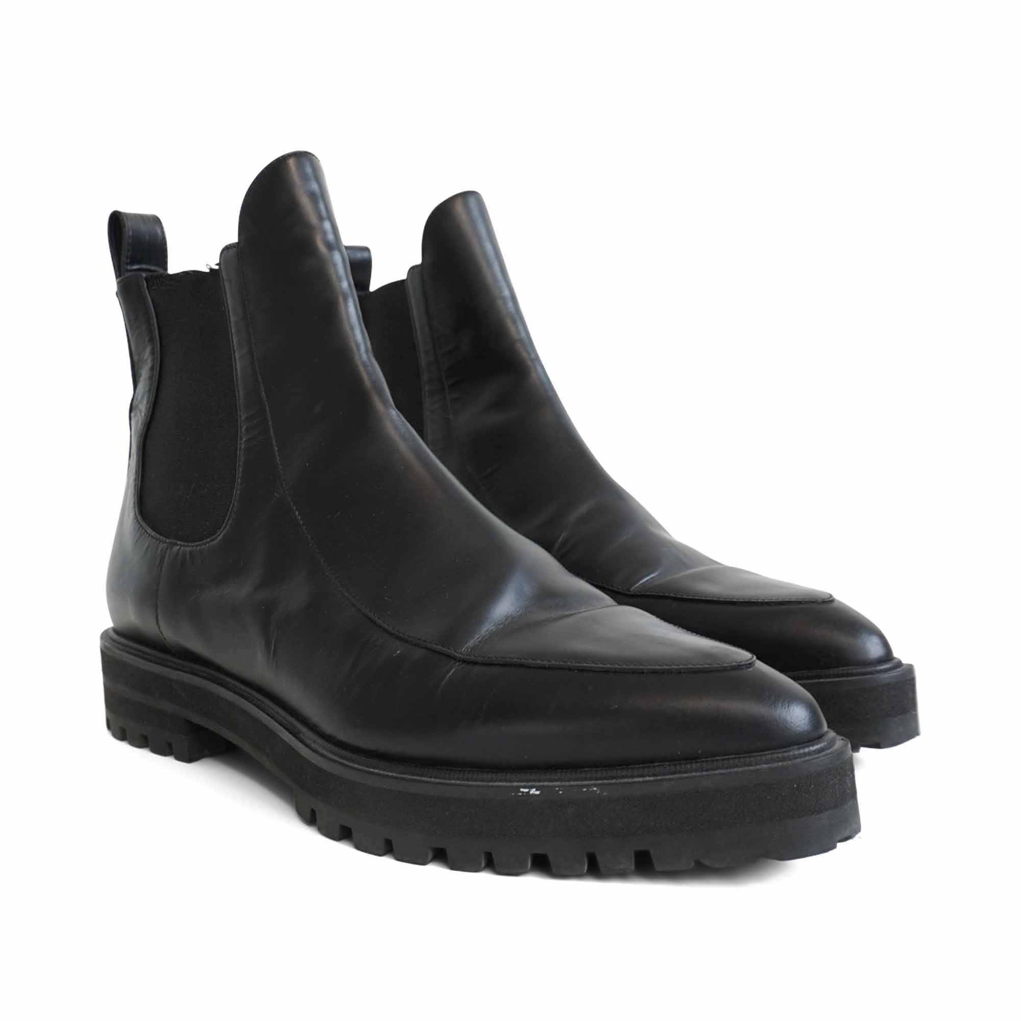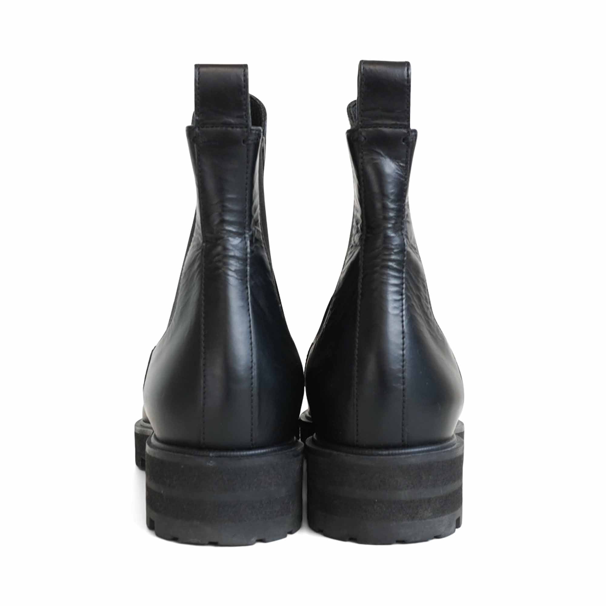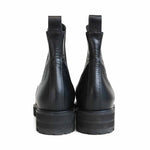 Proenza Schouler almond toe chelsea boots in black leather with elastic gussets on the sides and pull tab at the heel.