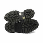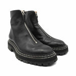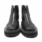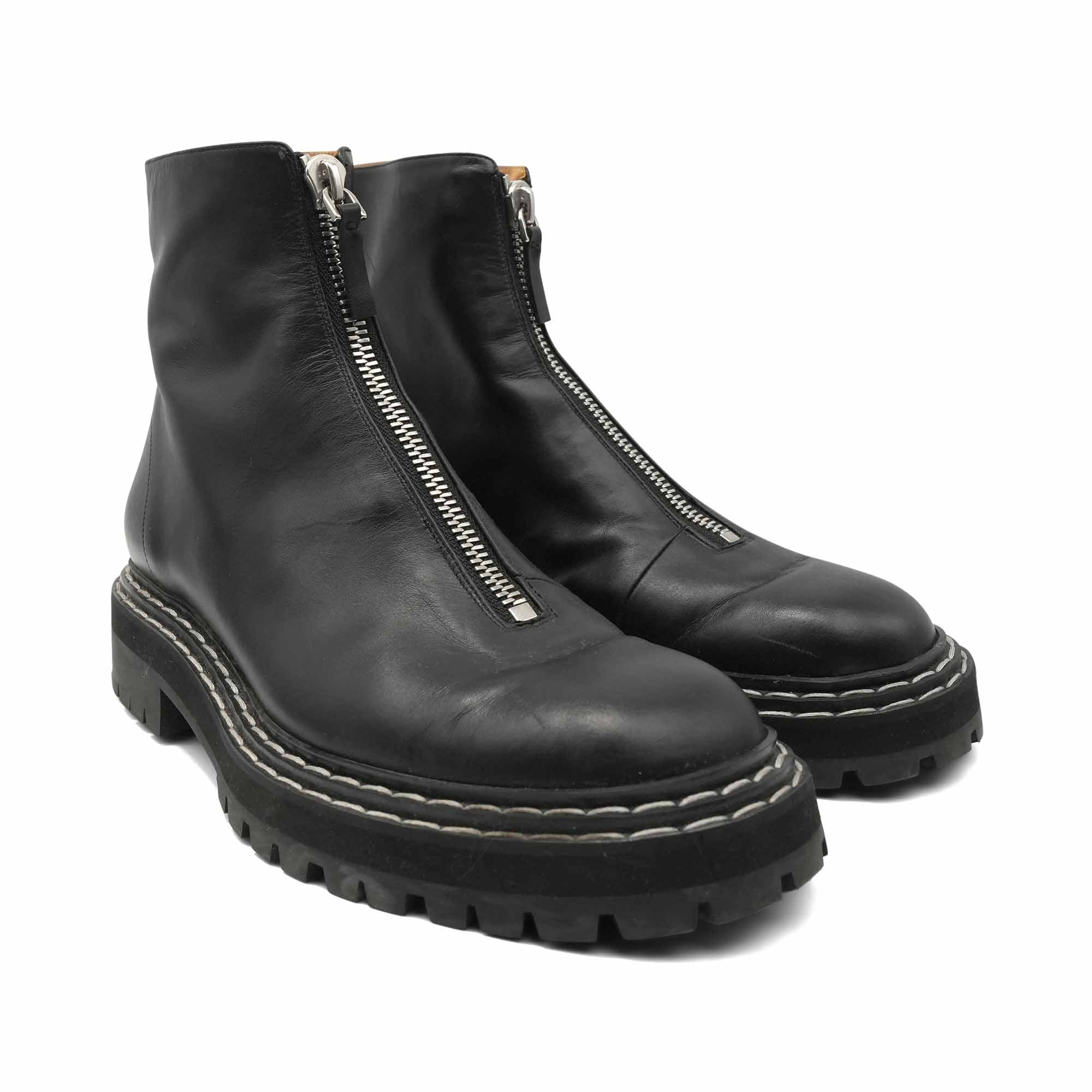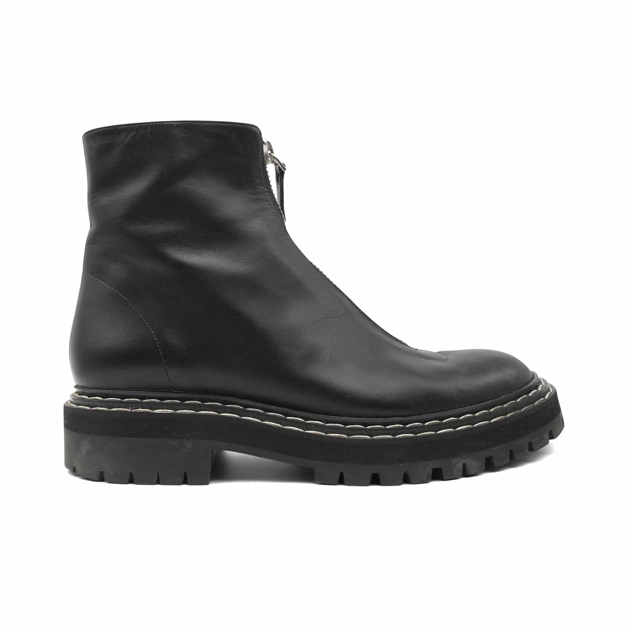 Proenza Schouler 'Pipe' zip front ankle boots in black leather. Features white contrast stitching, a round toe and a low stacked heel.