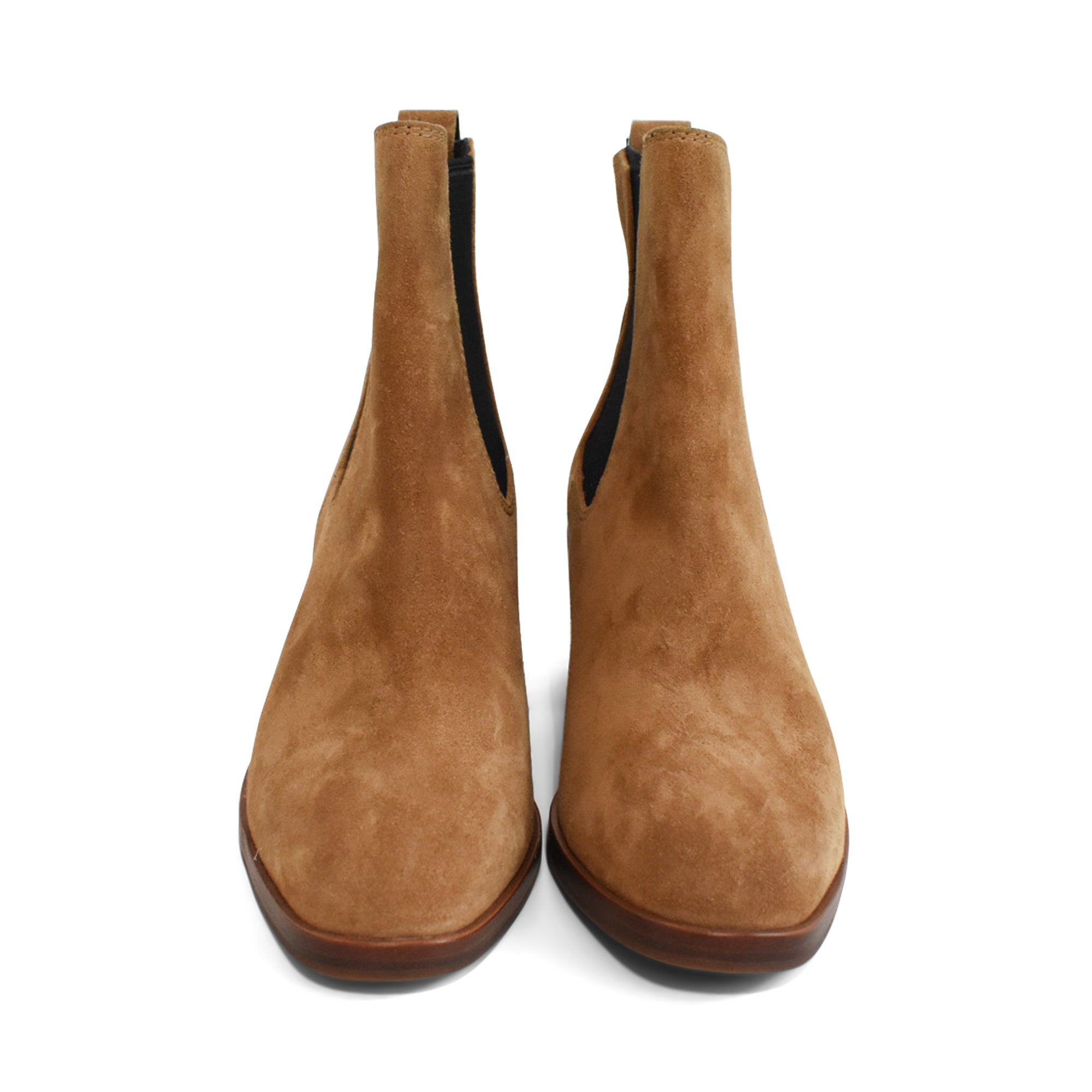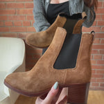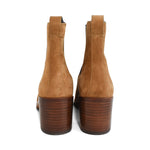 Rag & Bone 'Hazel' ankle boots in light brown suede with black elastic gusset, brown stacked heel and back pull tab.