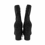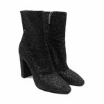 Saint Laurent 'Lou Glitter' ankle boots in black glitter with a side zip opening in silver hardware, a block heel, and an almond toe.