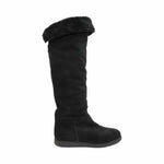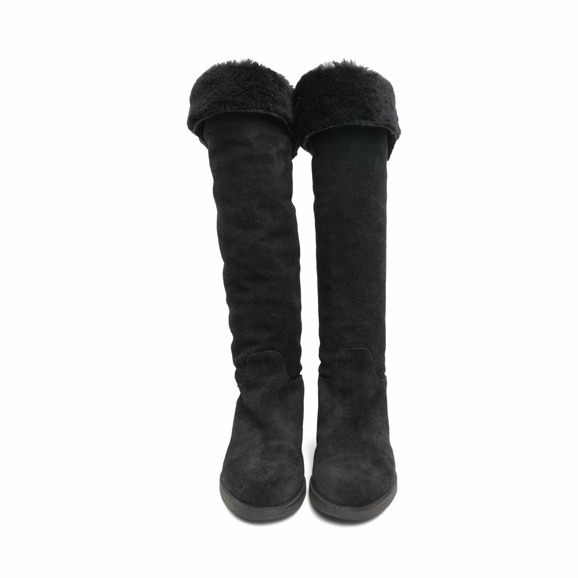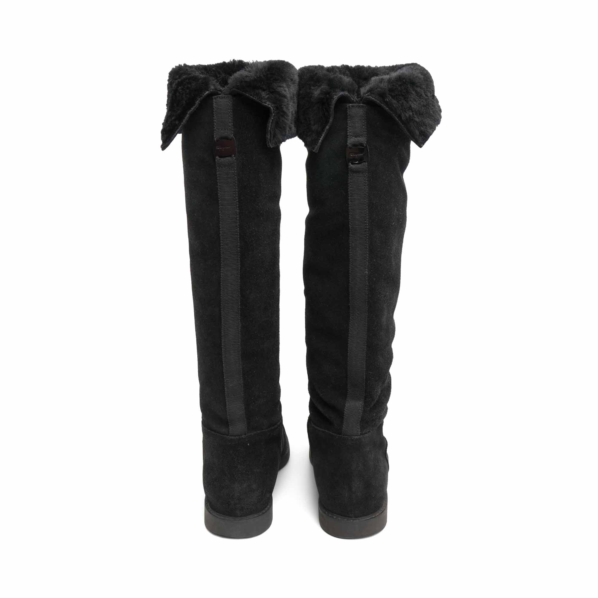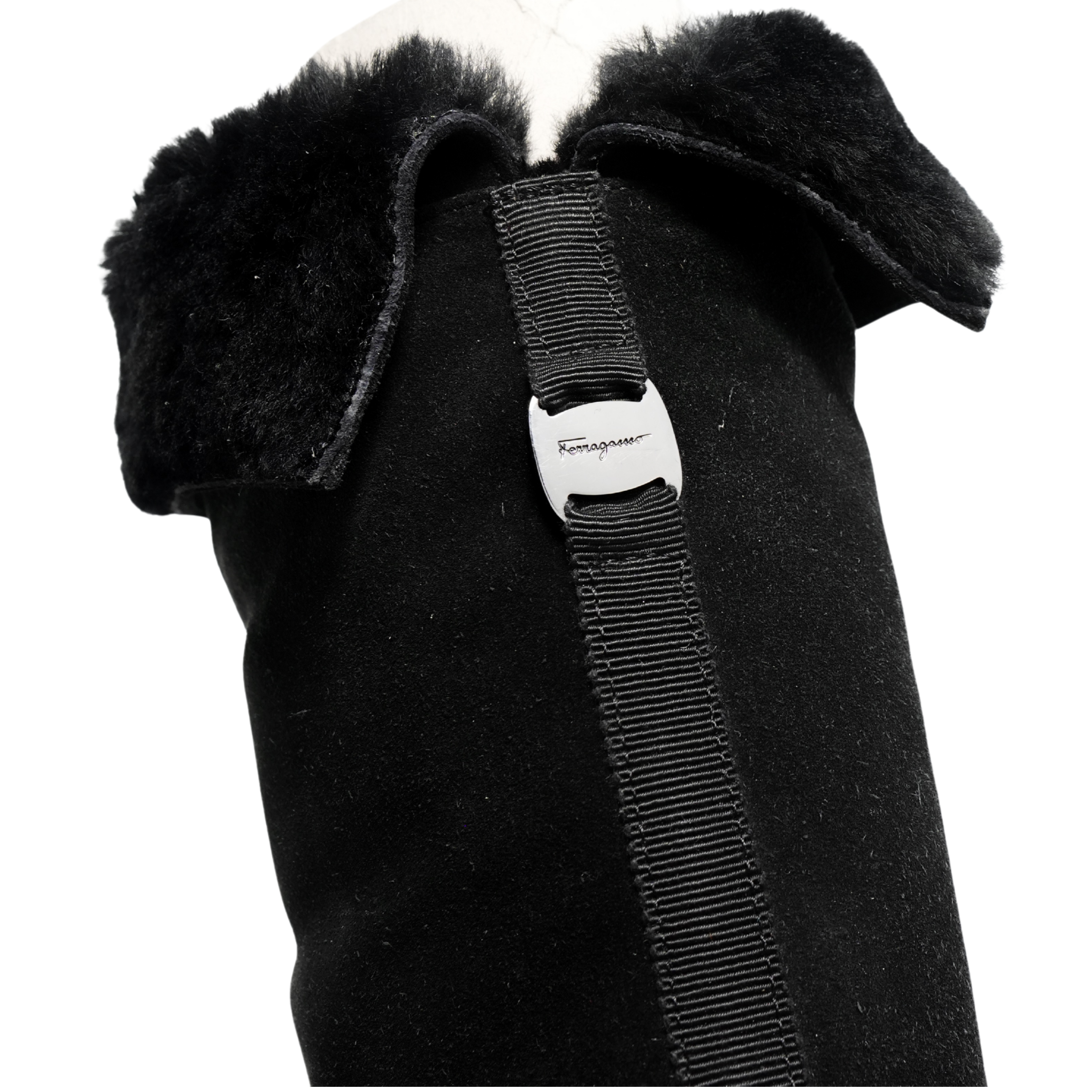 Salvatore Ferragamo calf-high boots in black suede with a fur trim and a small black metal logo plaque on the back.
