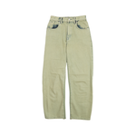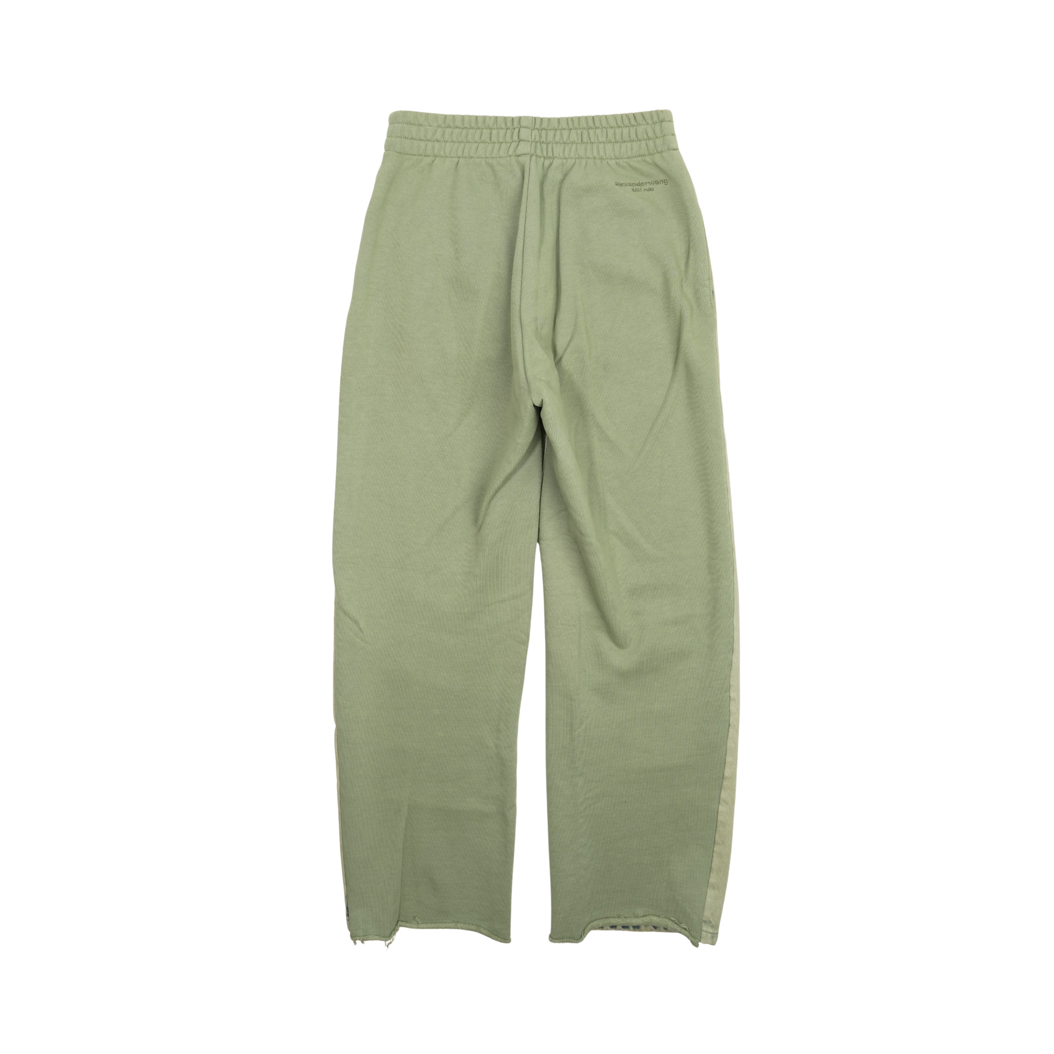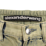 Alexander Wang straight leg hybrid sweatpant-jeans in a green washed cotton. Front half of pants are jeans with zip fly closure and hand pockets, back half is sweatpants with elastic waistband and an embroidered logo on back.