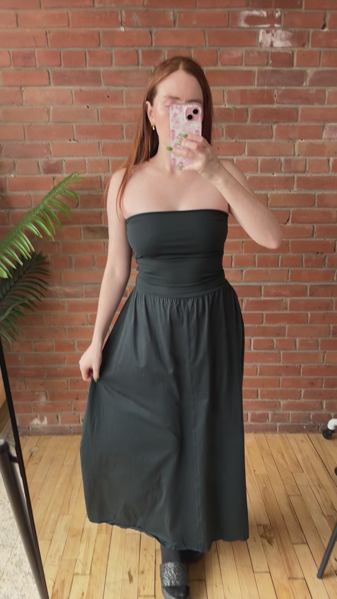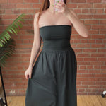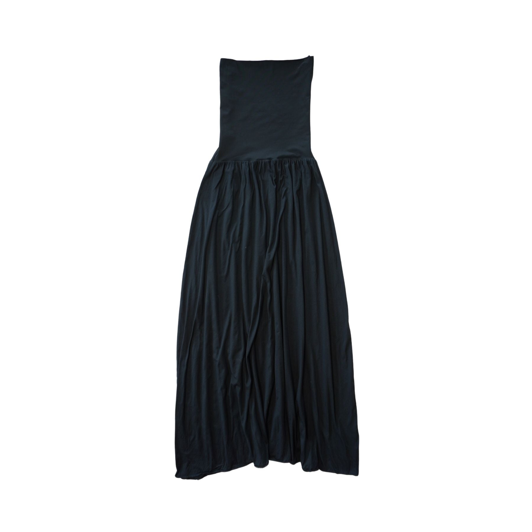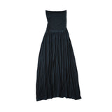 Eres strapless midi dress in charcoal black with a long pleated cotton skirt. The top part of the dress can be folded over to be worn as a maxi skirt.