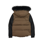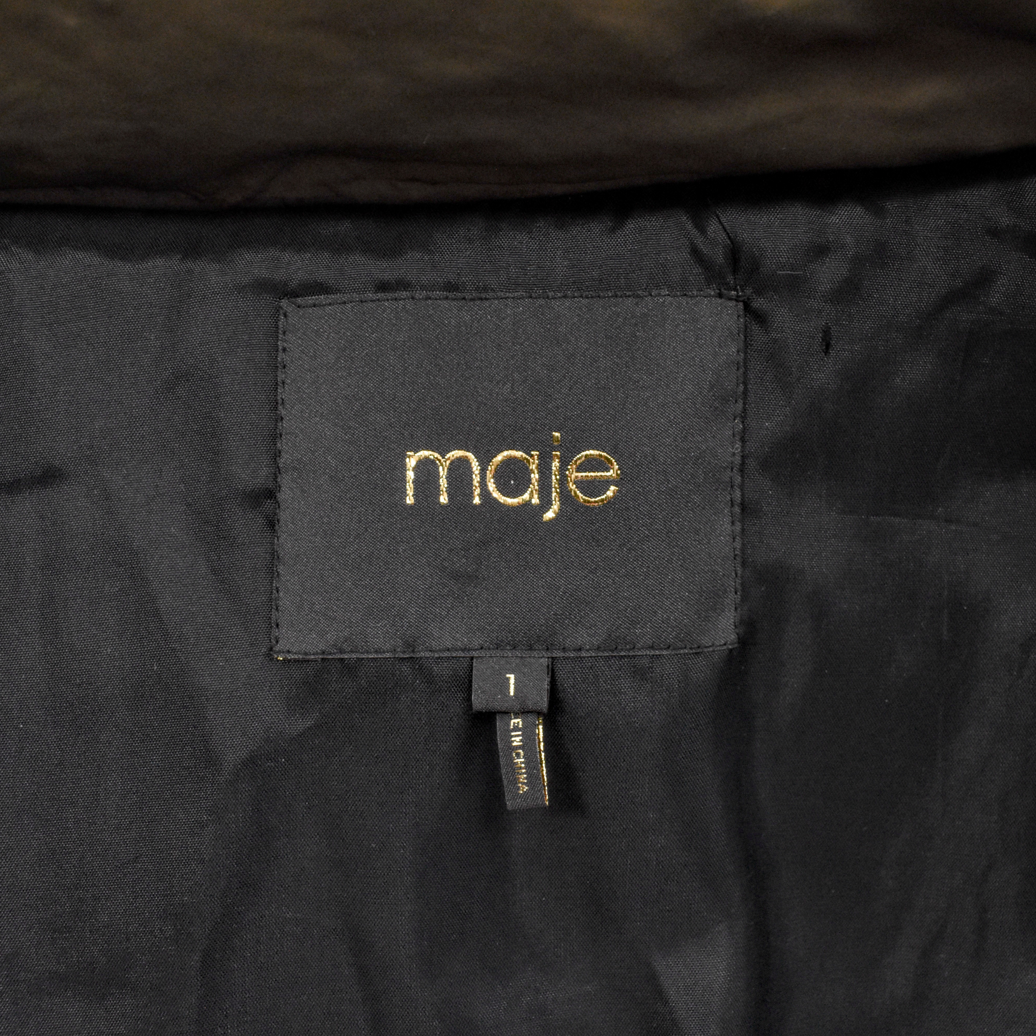 Maje convertible puffer jacket in army green nylon with removable black blistered suede sleeves. The jacket features an asymmetrical front zip opening in silver hardware, side slip pockets, and a large hood with black racoon fur trim.