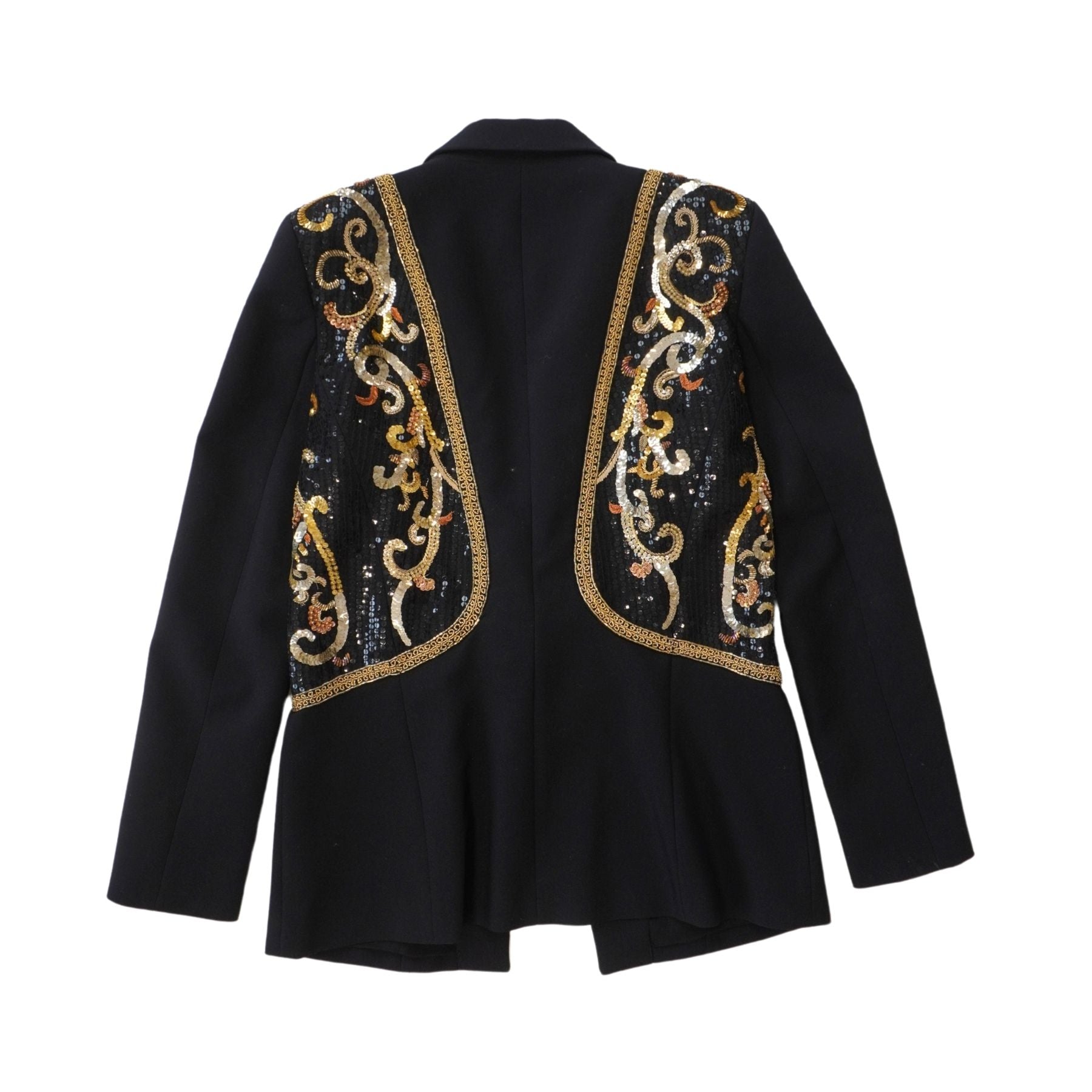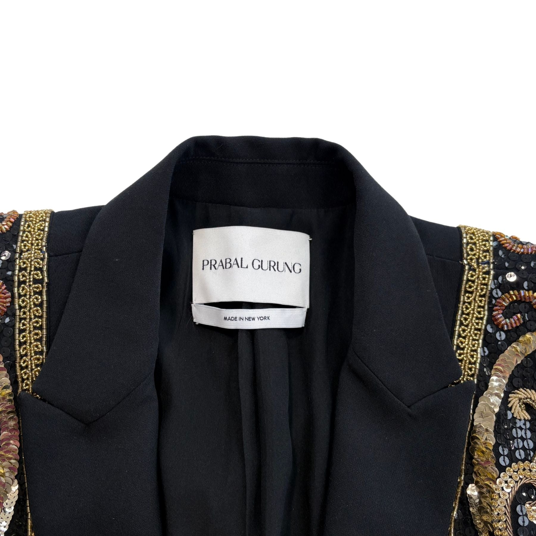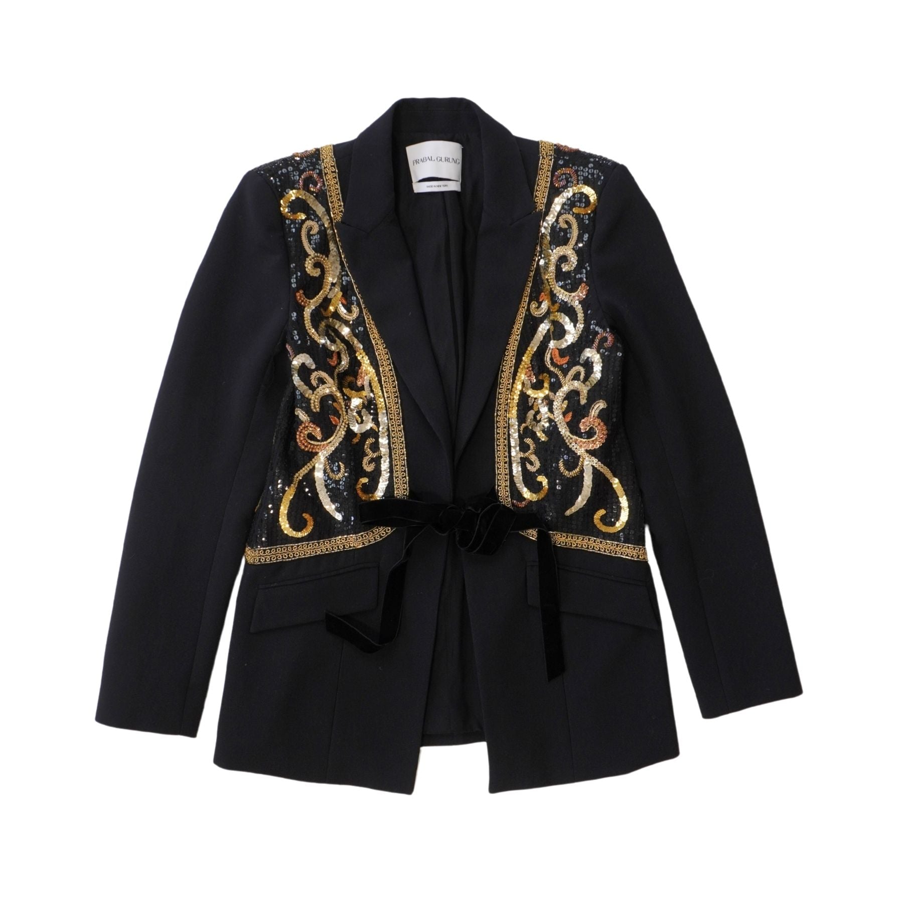 Prabal Gurung blazer jacket in black with a gold and black sequin beaded vest appliqué, a peak lapel collar, front flap pockets, and a black velvet tie at the waist.