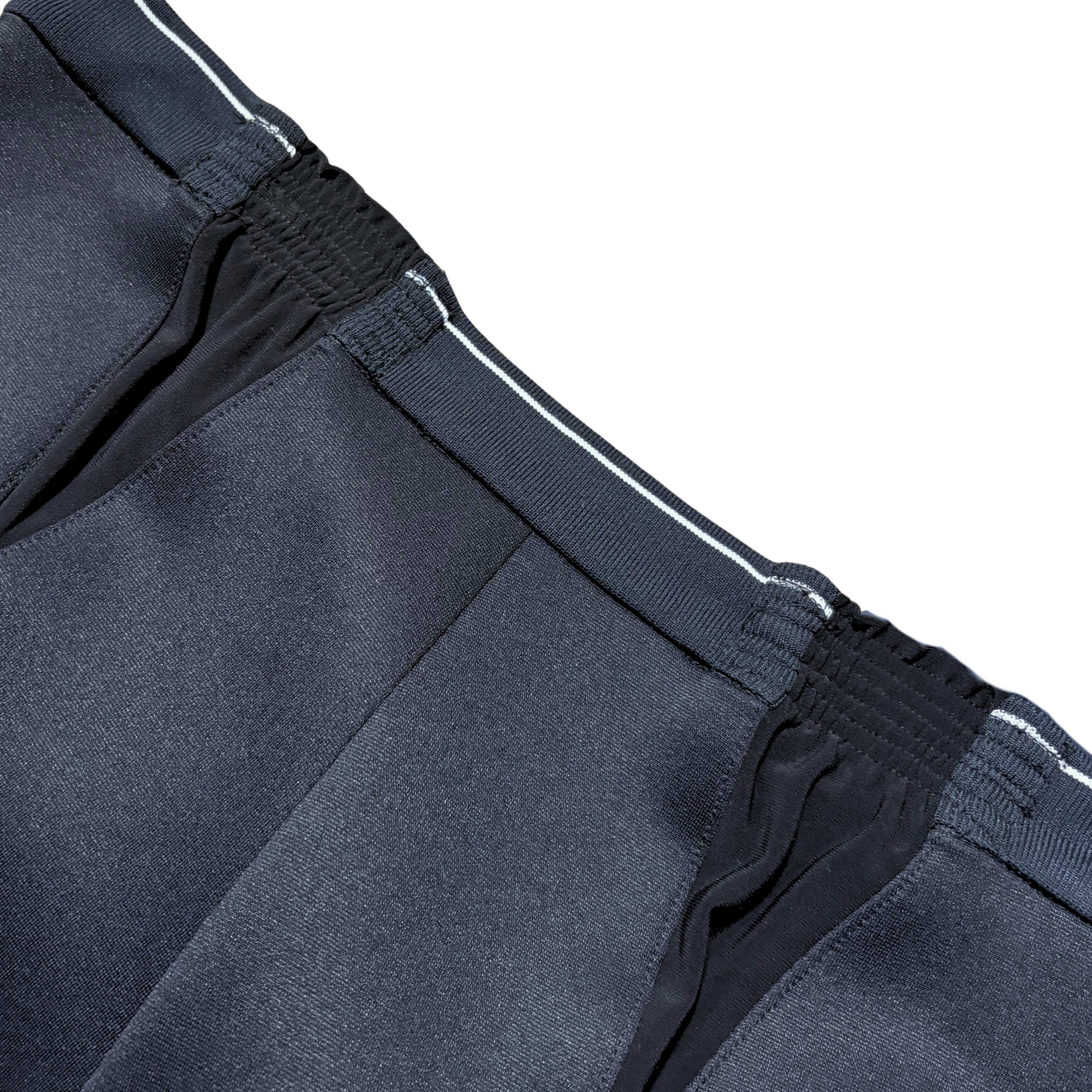 Prada skinny leggings in black stretch with black and white elastic waistband and beige Prada logo. Features silver zipper at ankles and invisible side zipper.