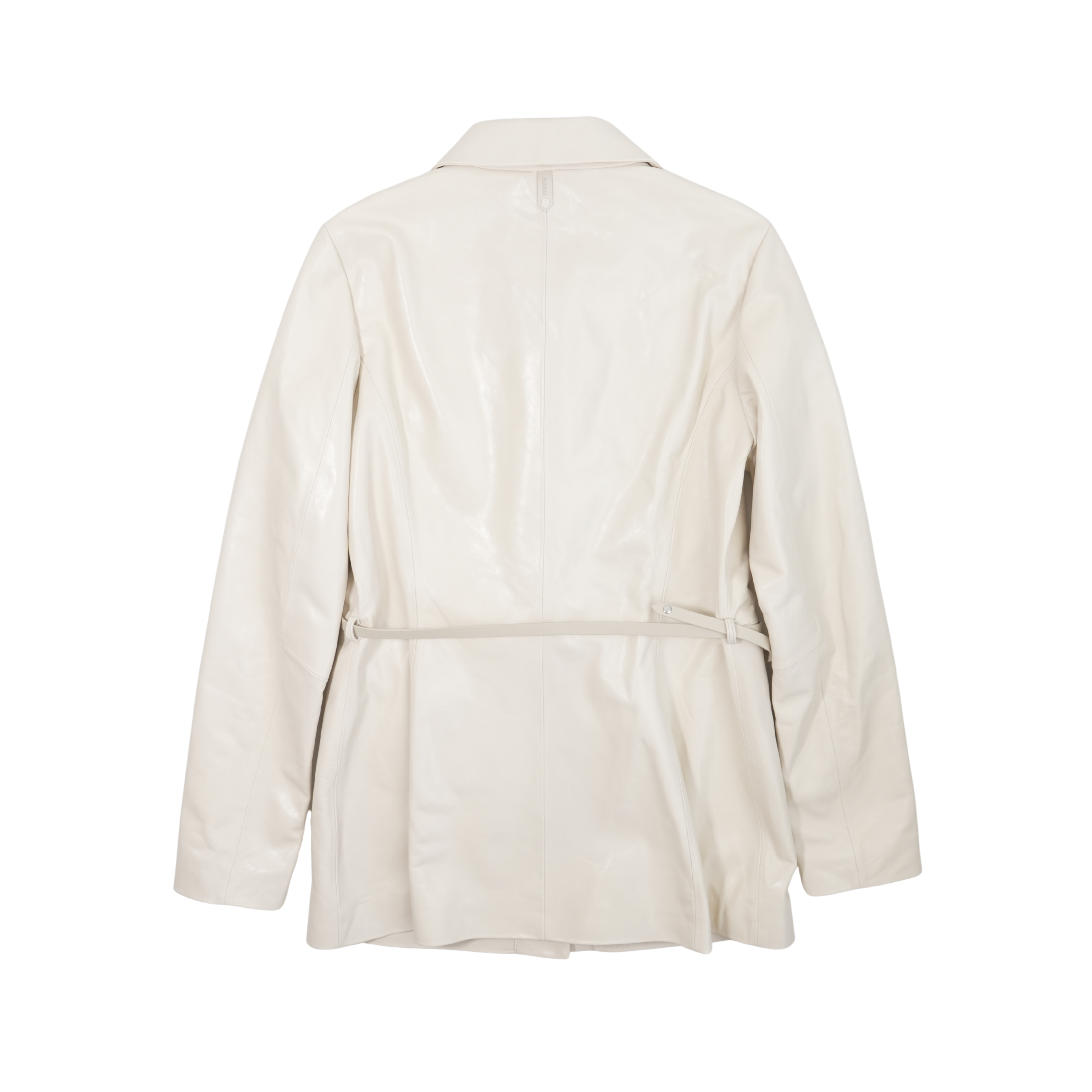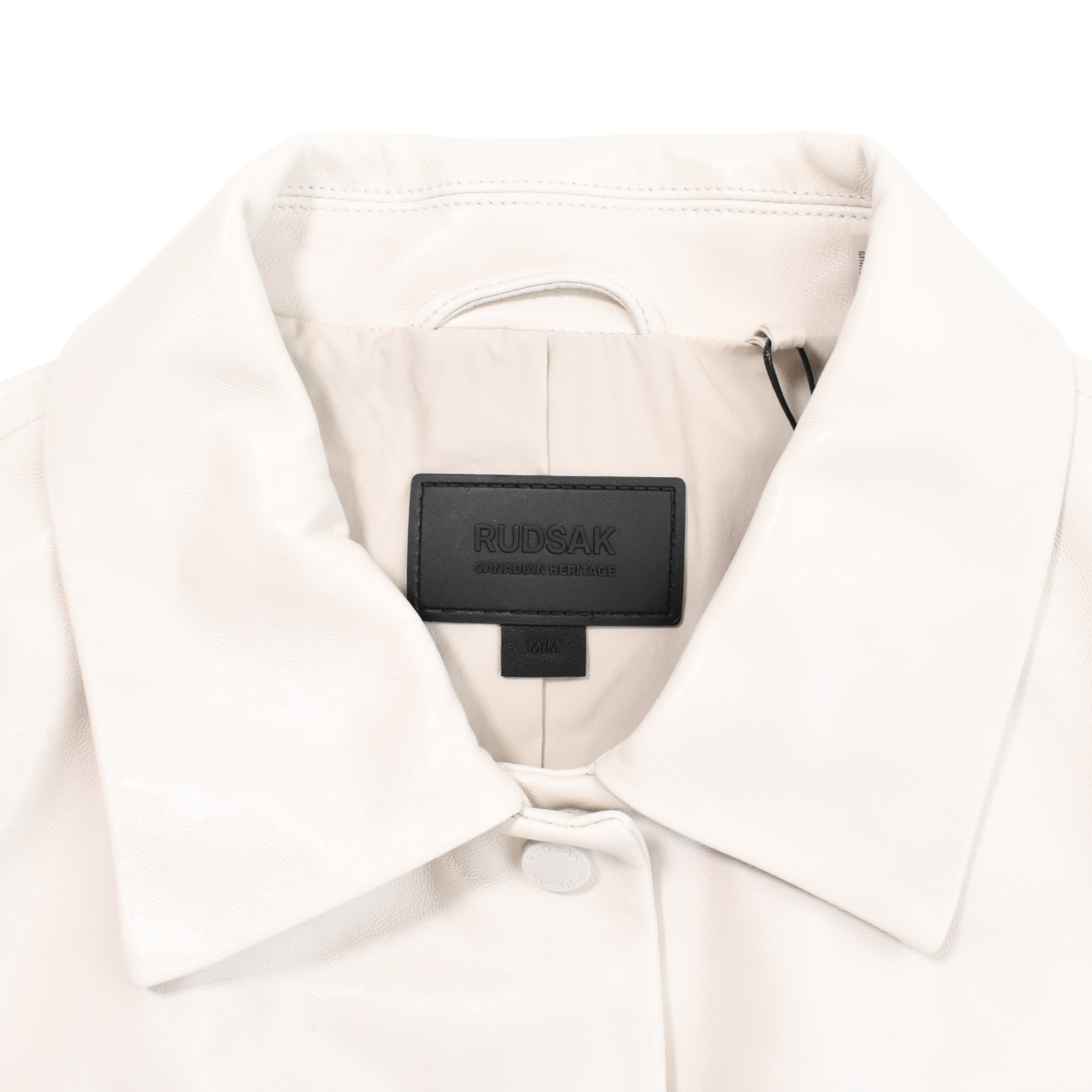 Rudsak 'Danica' mid-length jacket in cream leather with pointed collar, four front flap pockets and snap button closure. Features beige thin waist belt.
