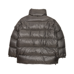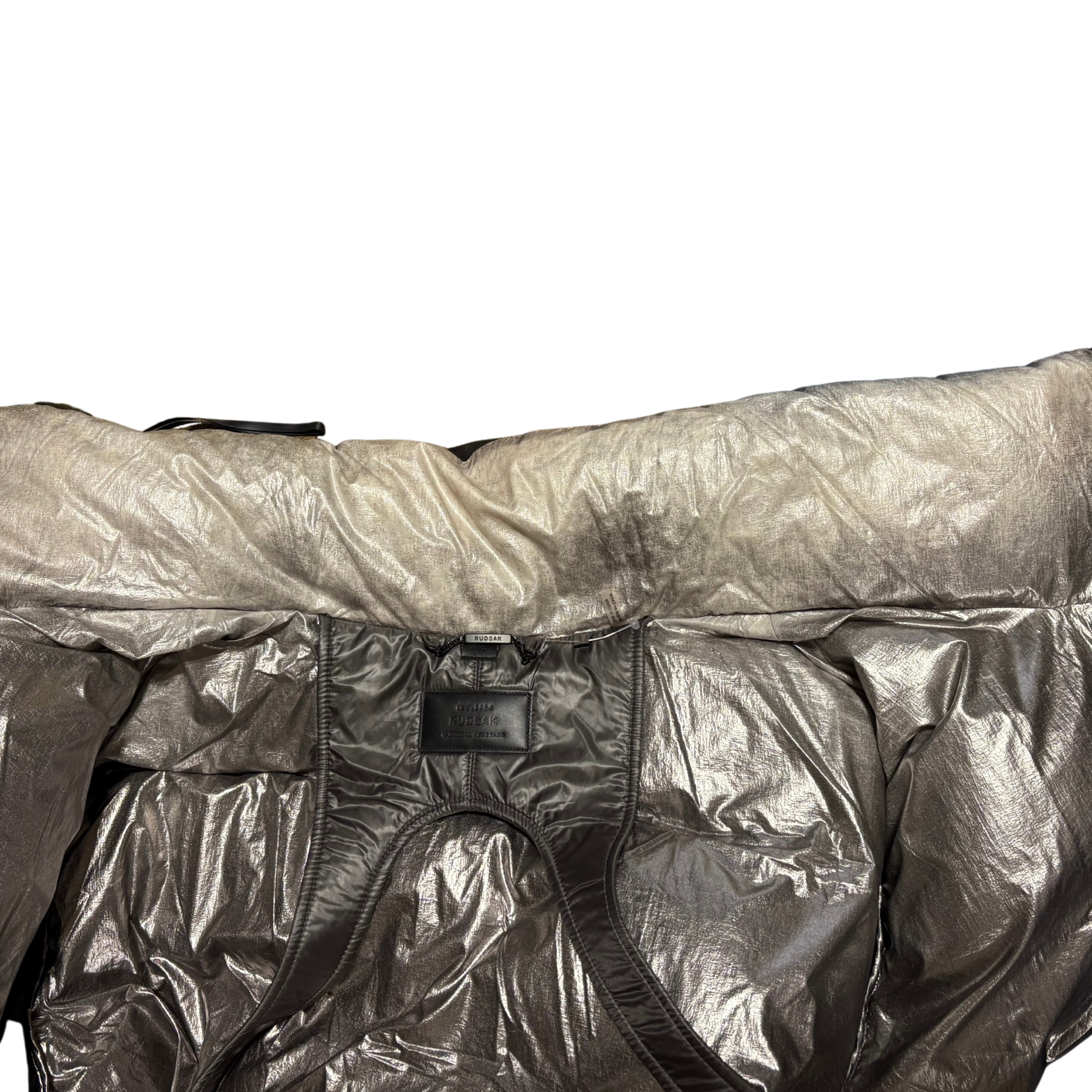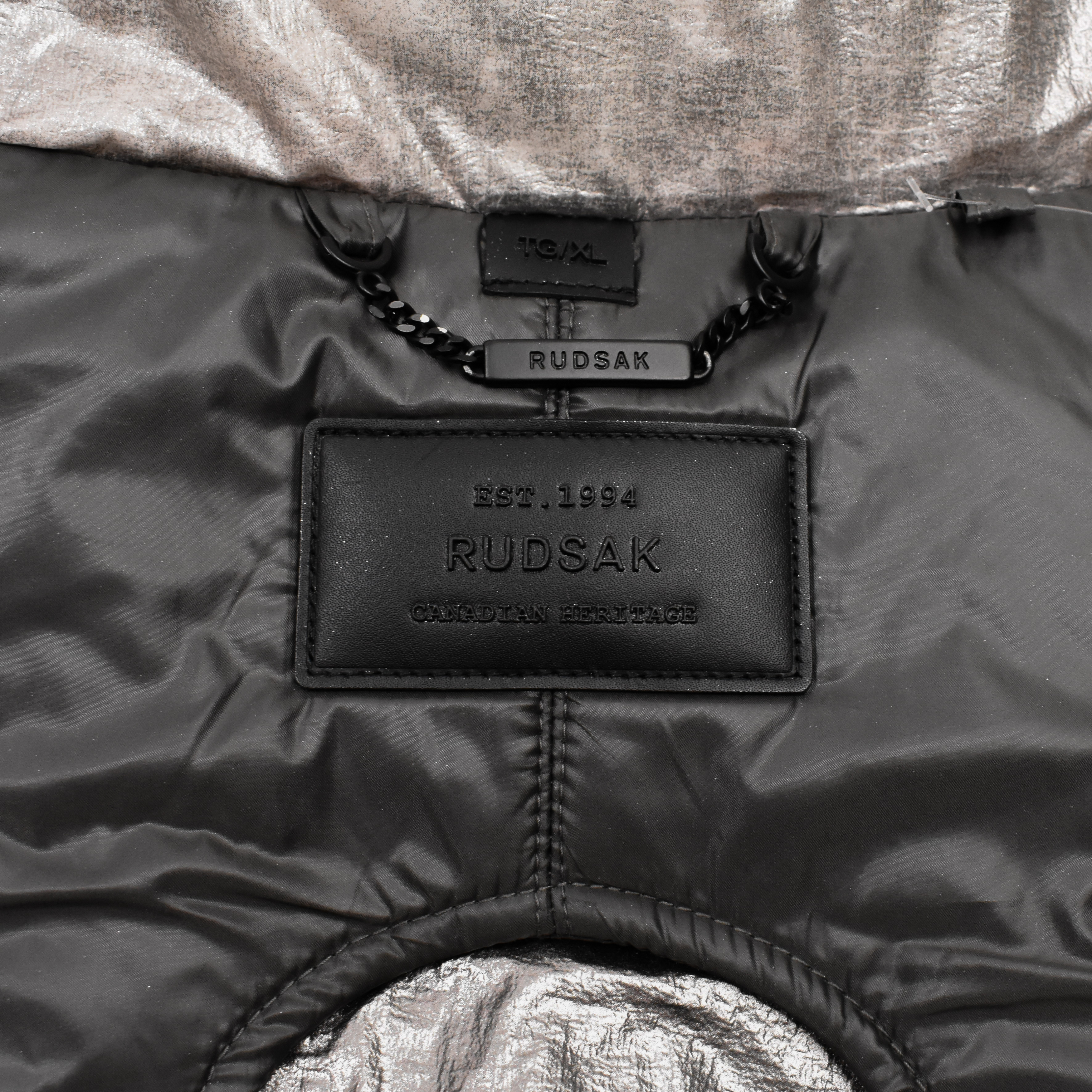 Rudsak 'Mikhai' puffer jacket in a metallic dark grey nylon with two front zipper pockets, zip and snap button closure, cinch hem and zippers on the sleeves. Features an interior harness for carrying the jacket.