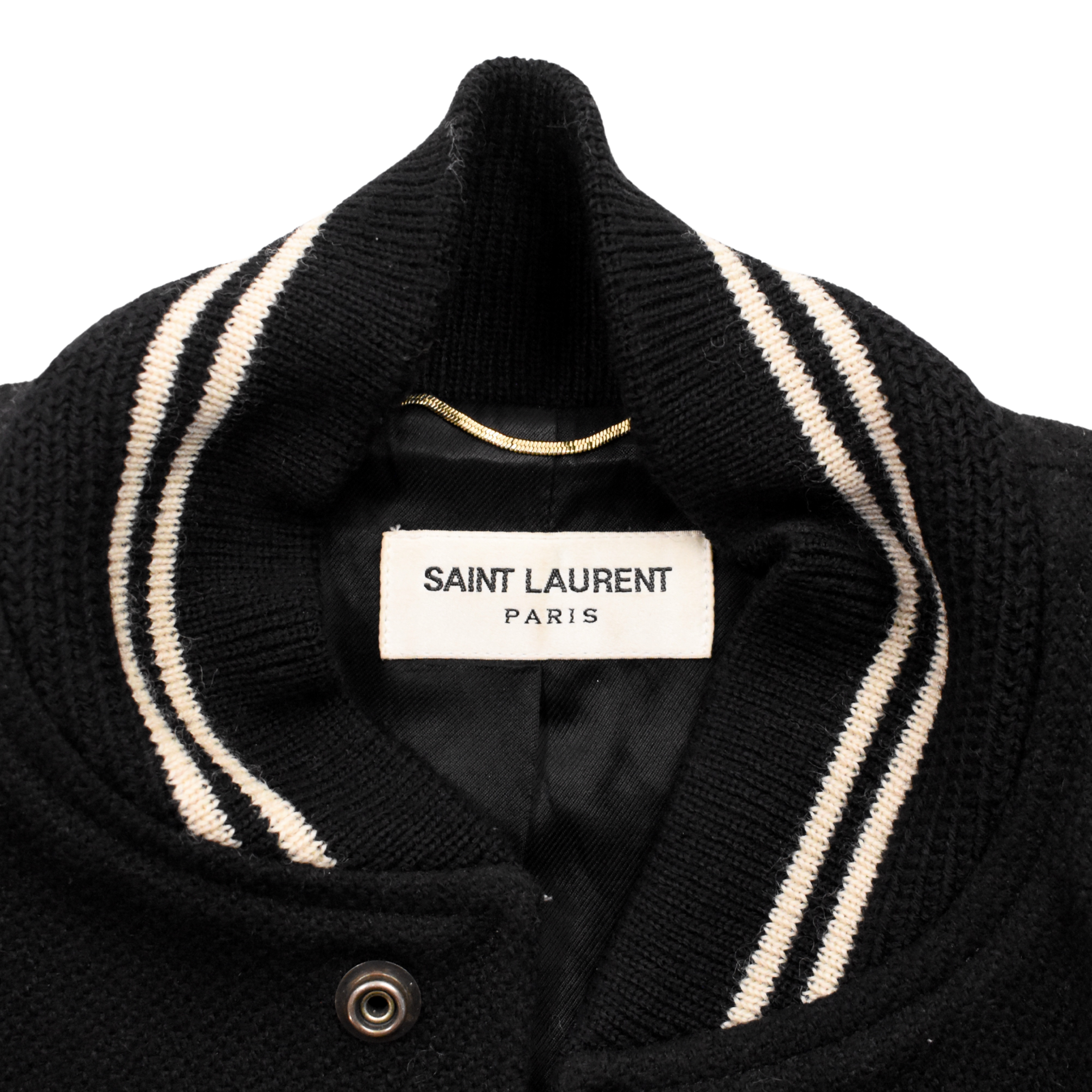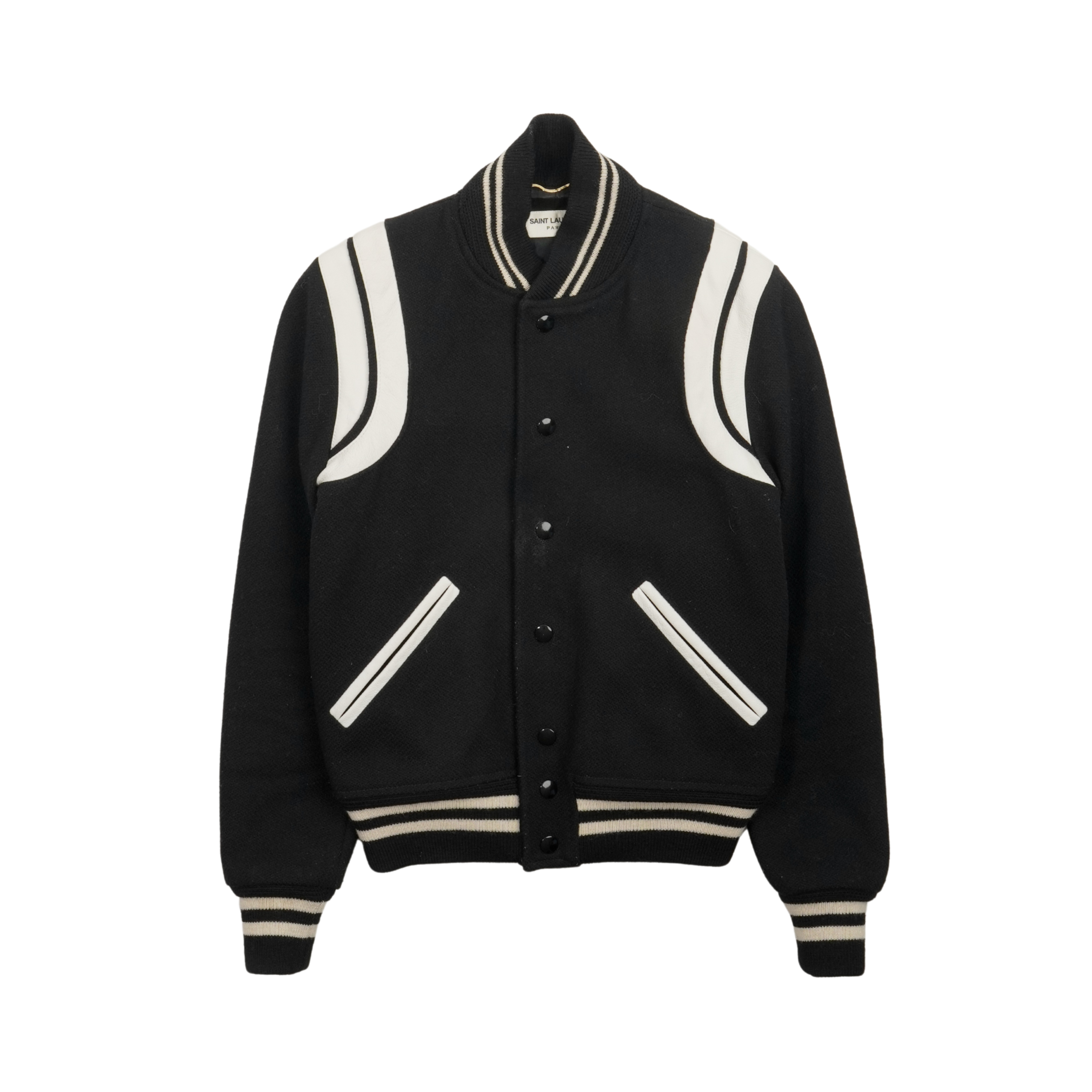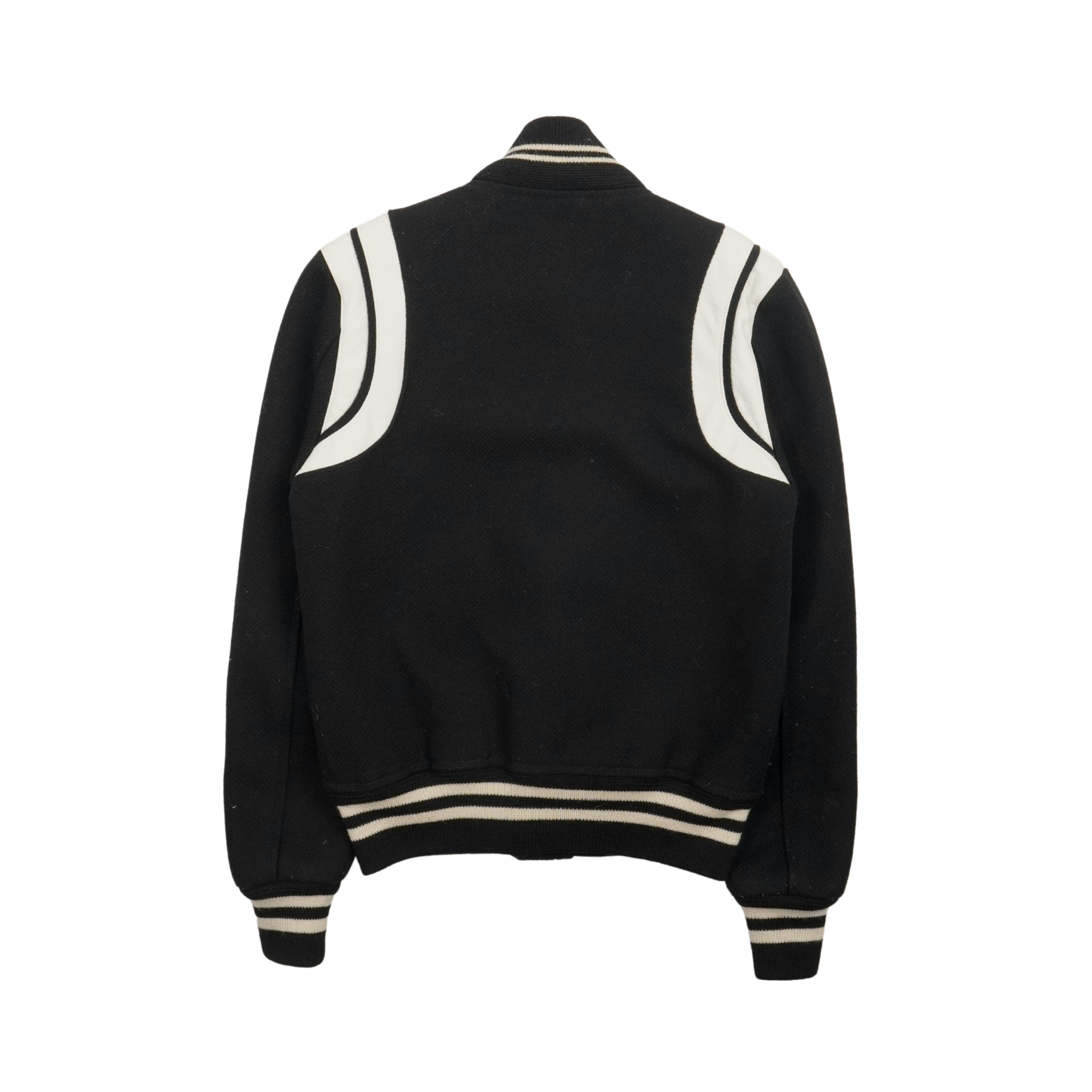 Saint Laurent 'Teddy' varsity jacket in black wool with front snap button closures, ribbed cuffs, and white leather panelling at the shoulders.