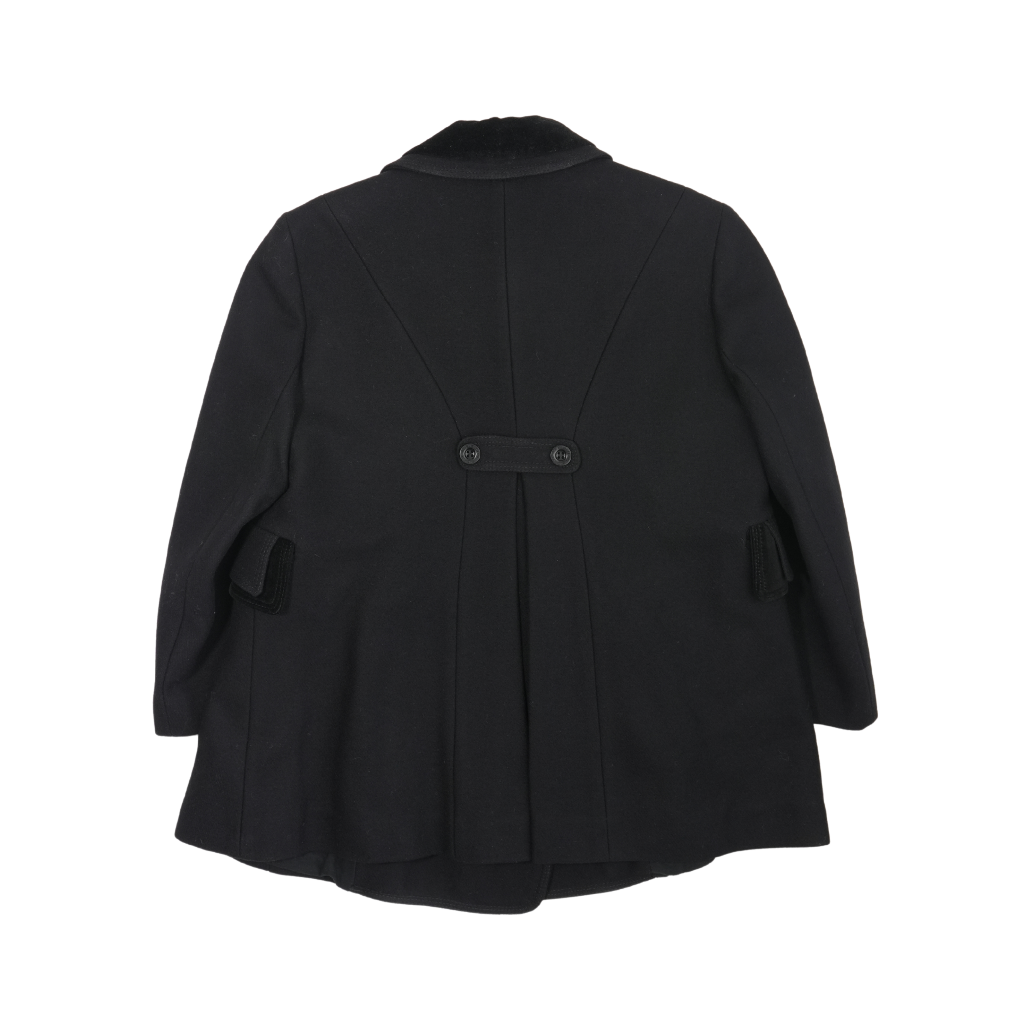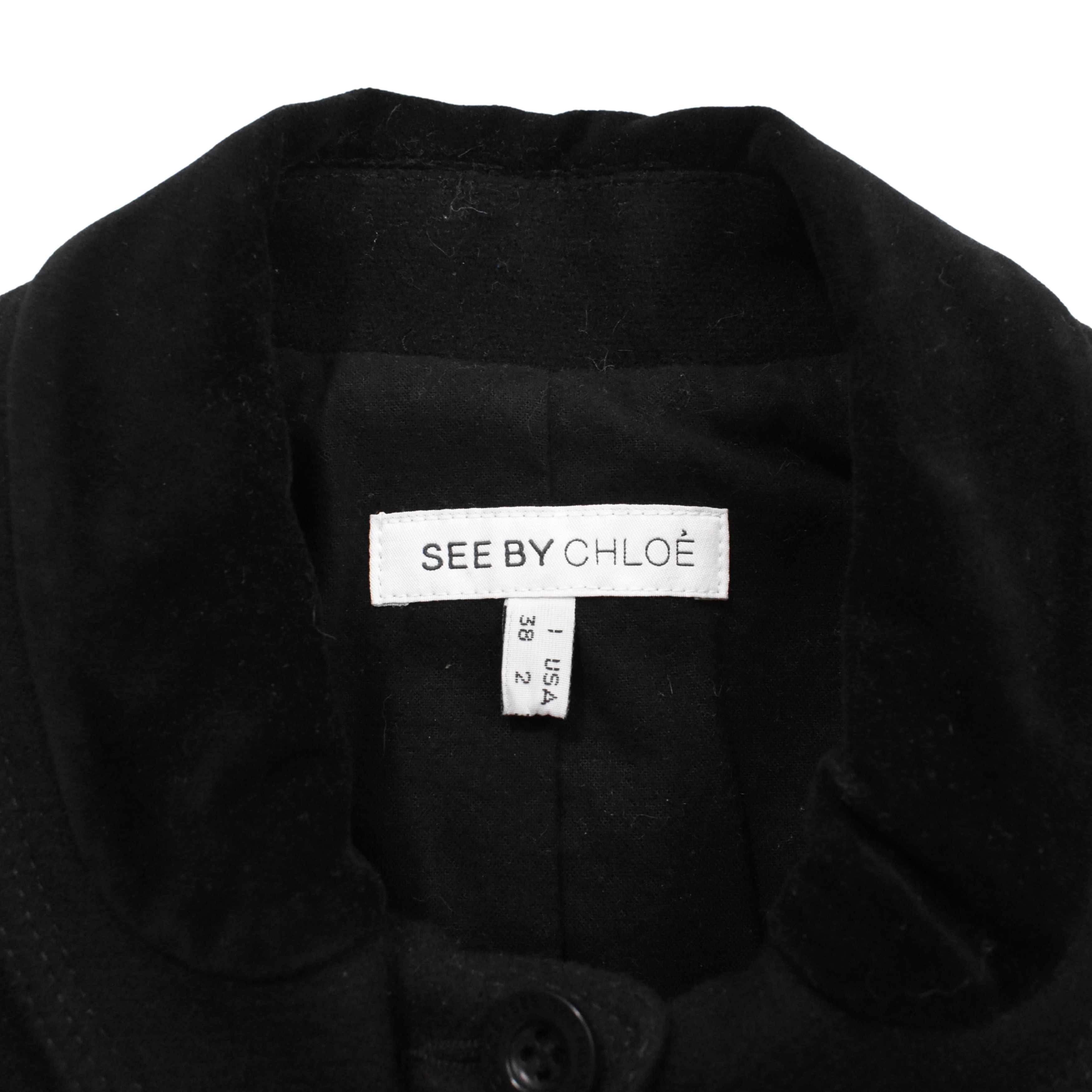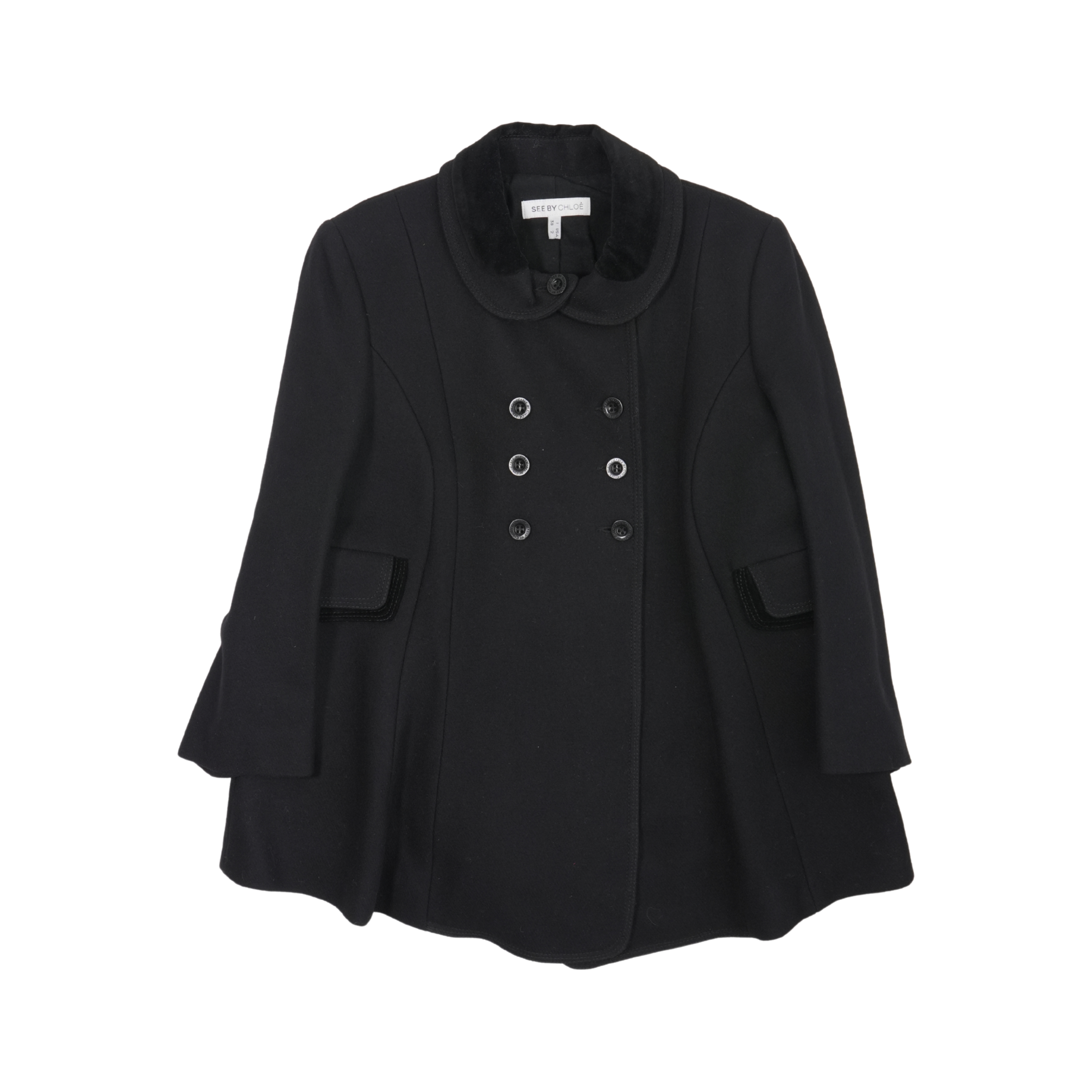 See By Chloe babydoll peacoat in black wool with velvet trim Peter Pan collar, double-breasted closure and two faux flap pockets. Features 3/4 sleeves, dual button detail and box bleat on the back.