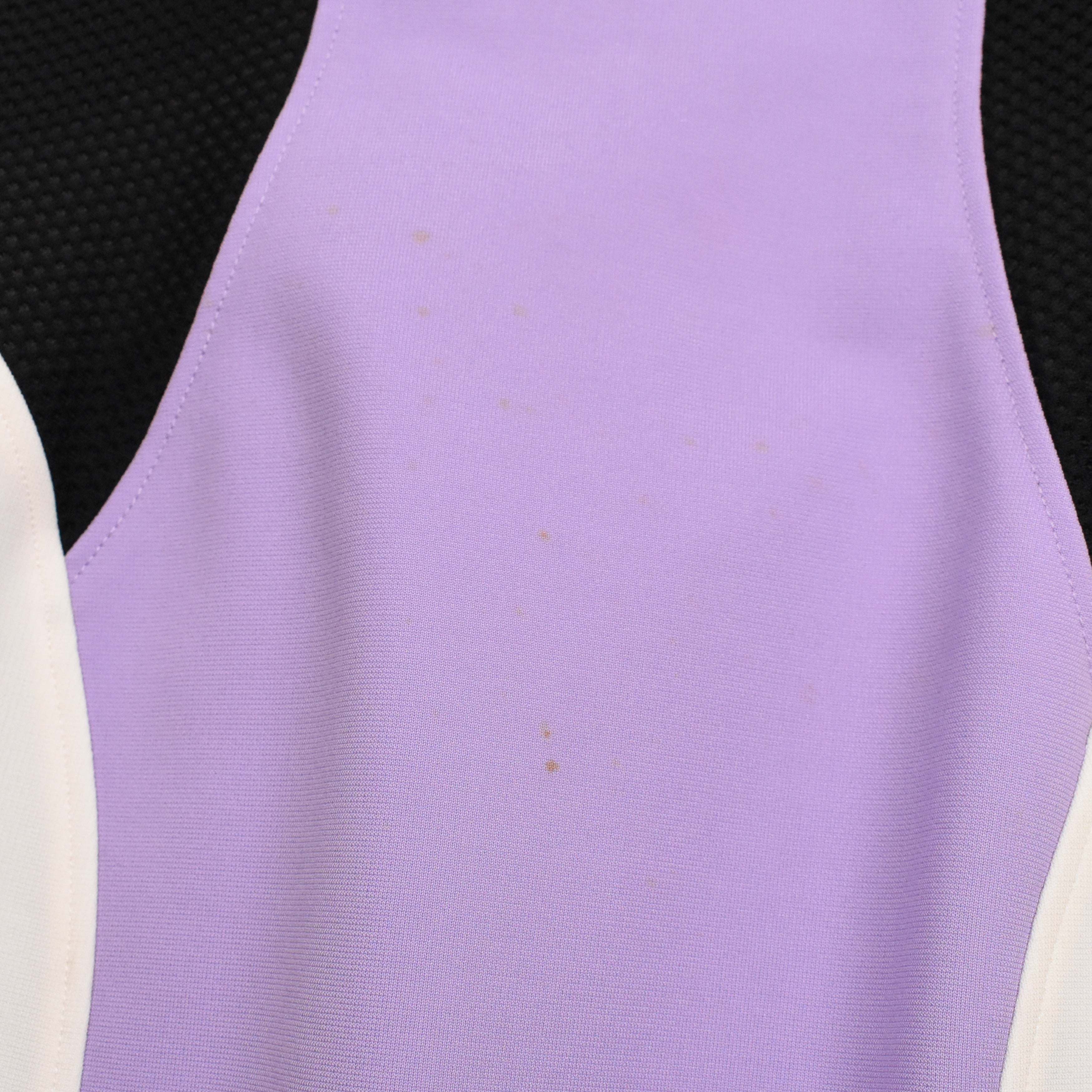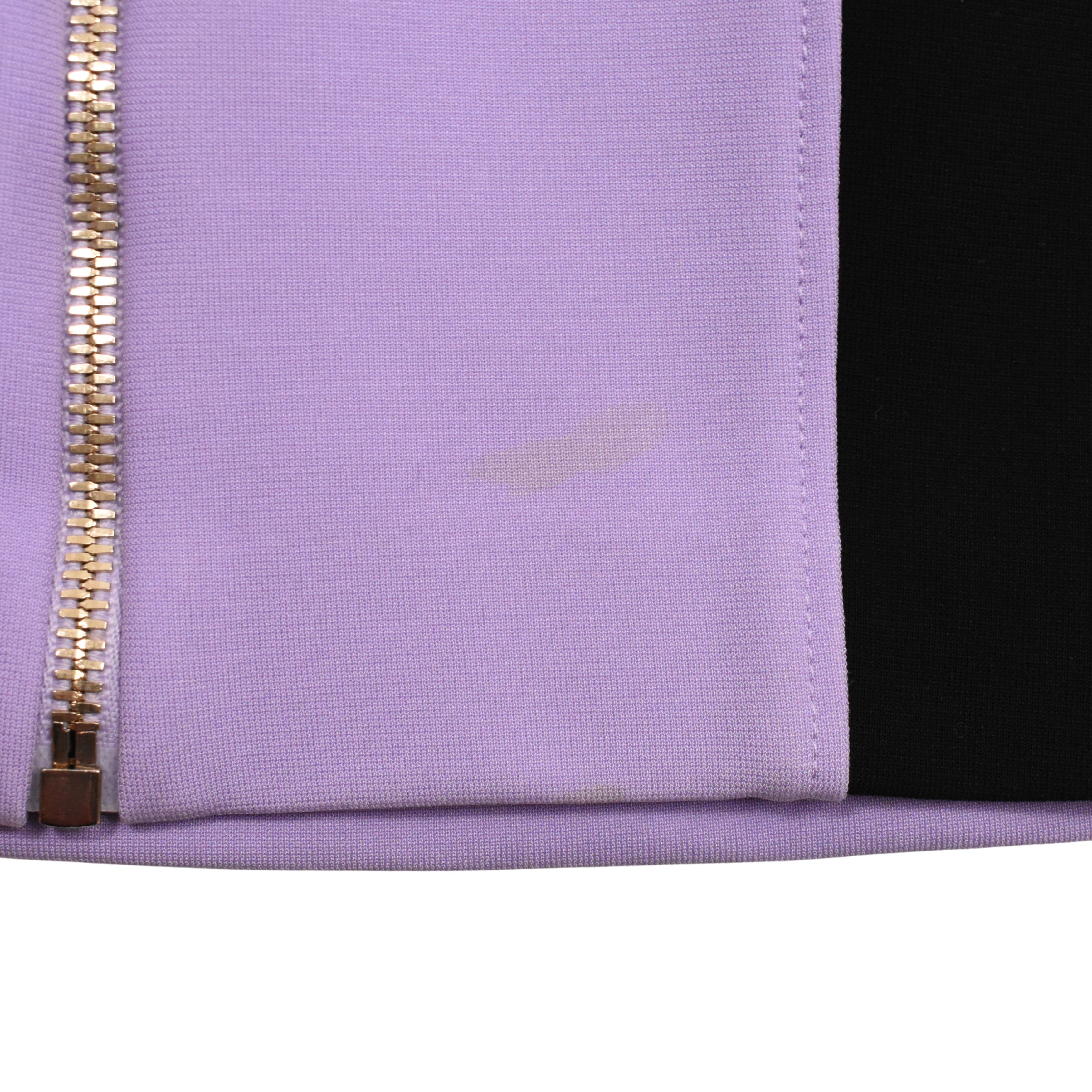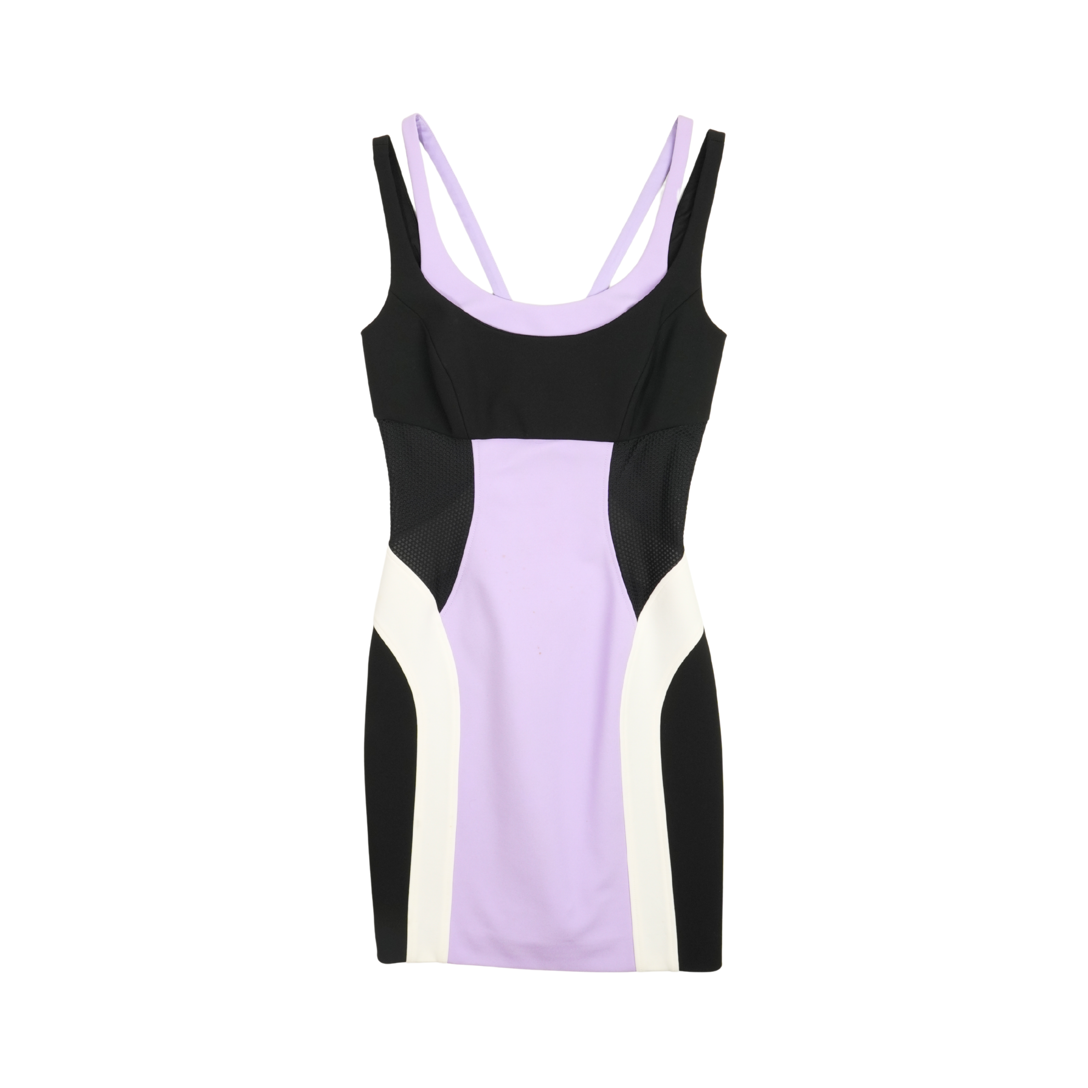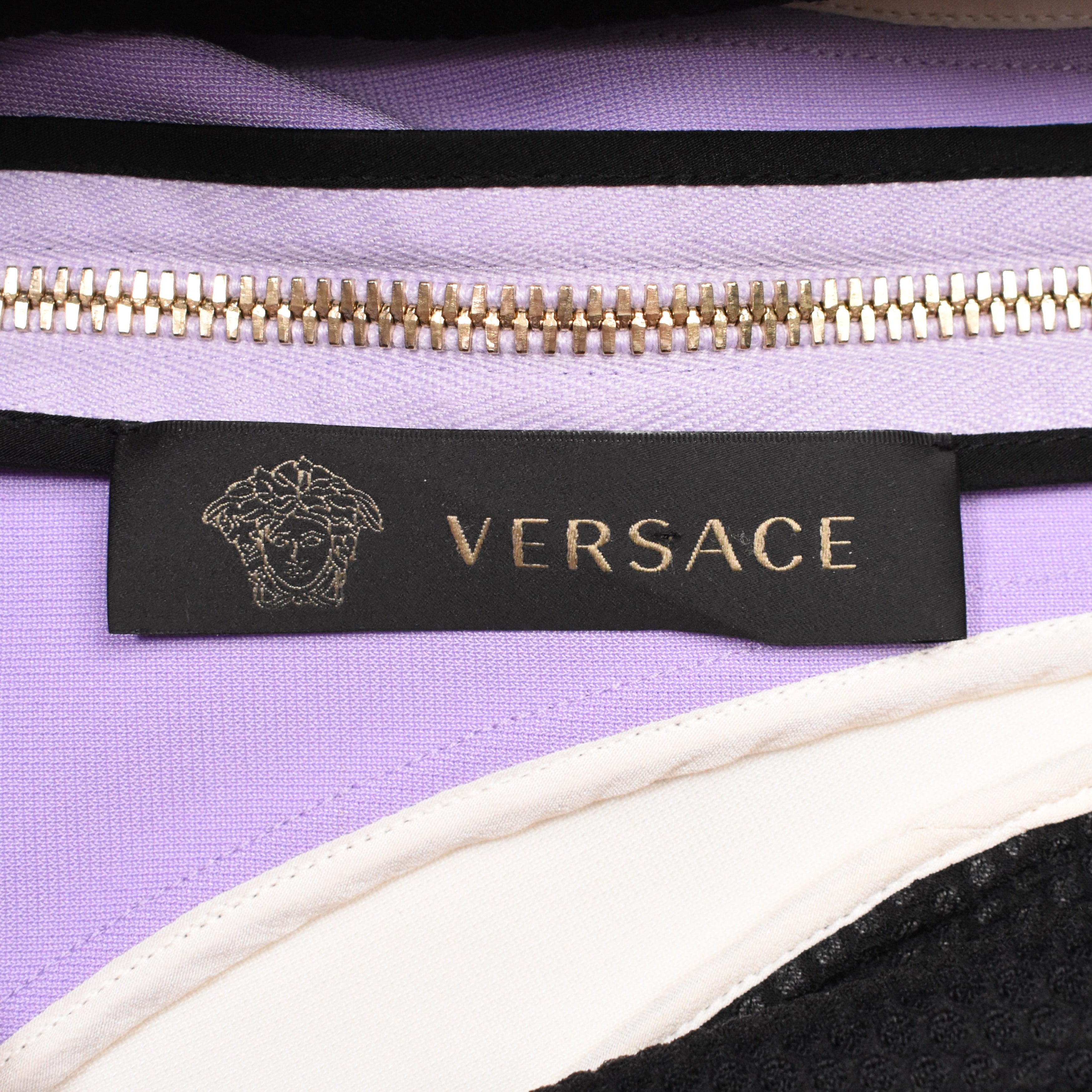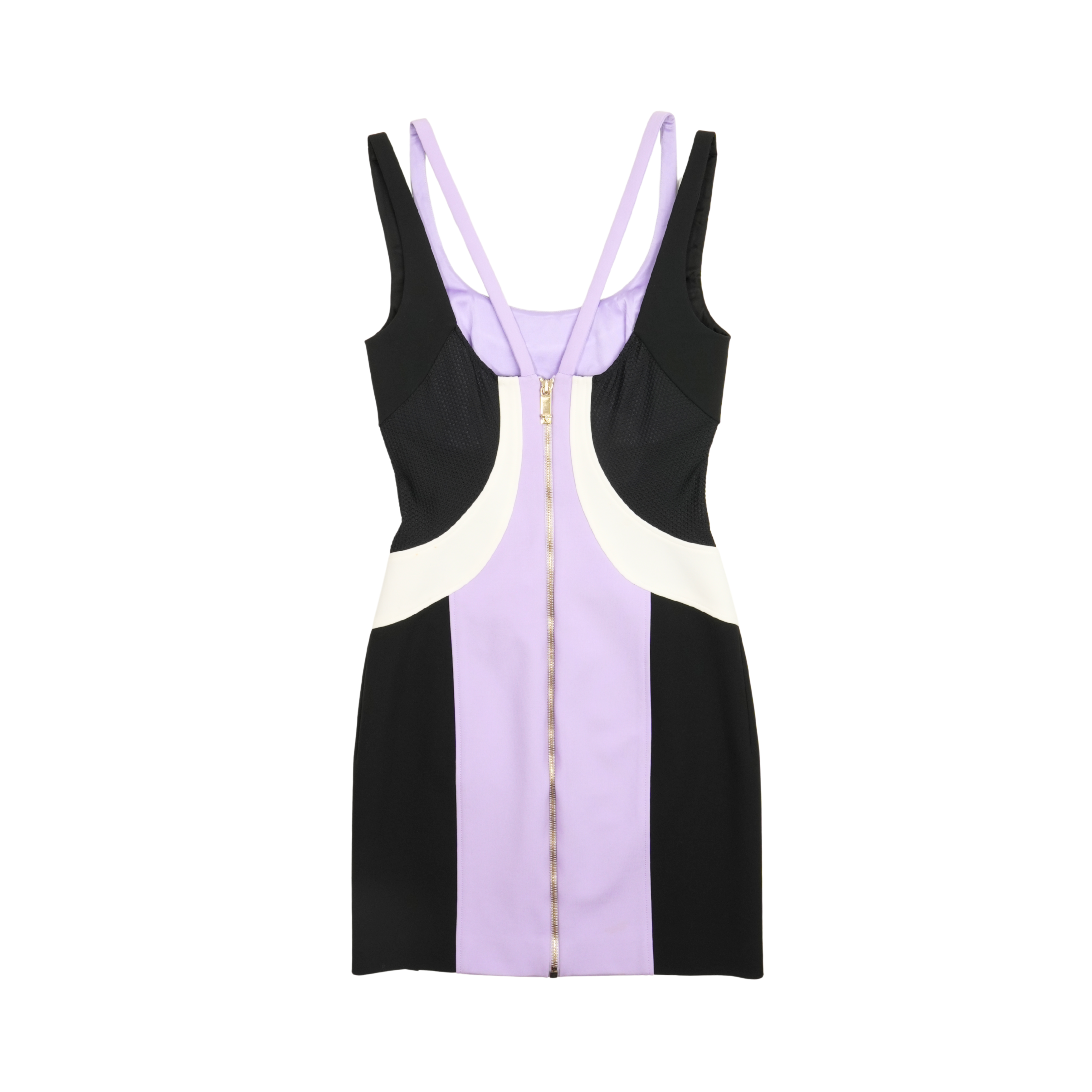 Versace sheath tank dress in purple and black colour blocking with white details. Features mesh panels on sides, double straps and a zip closure all the way down the back with gold Medusa head zipper pull.