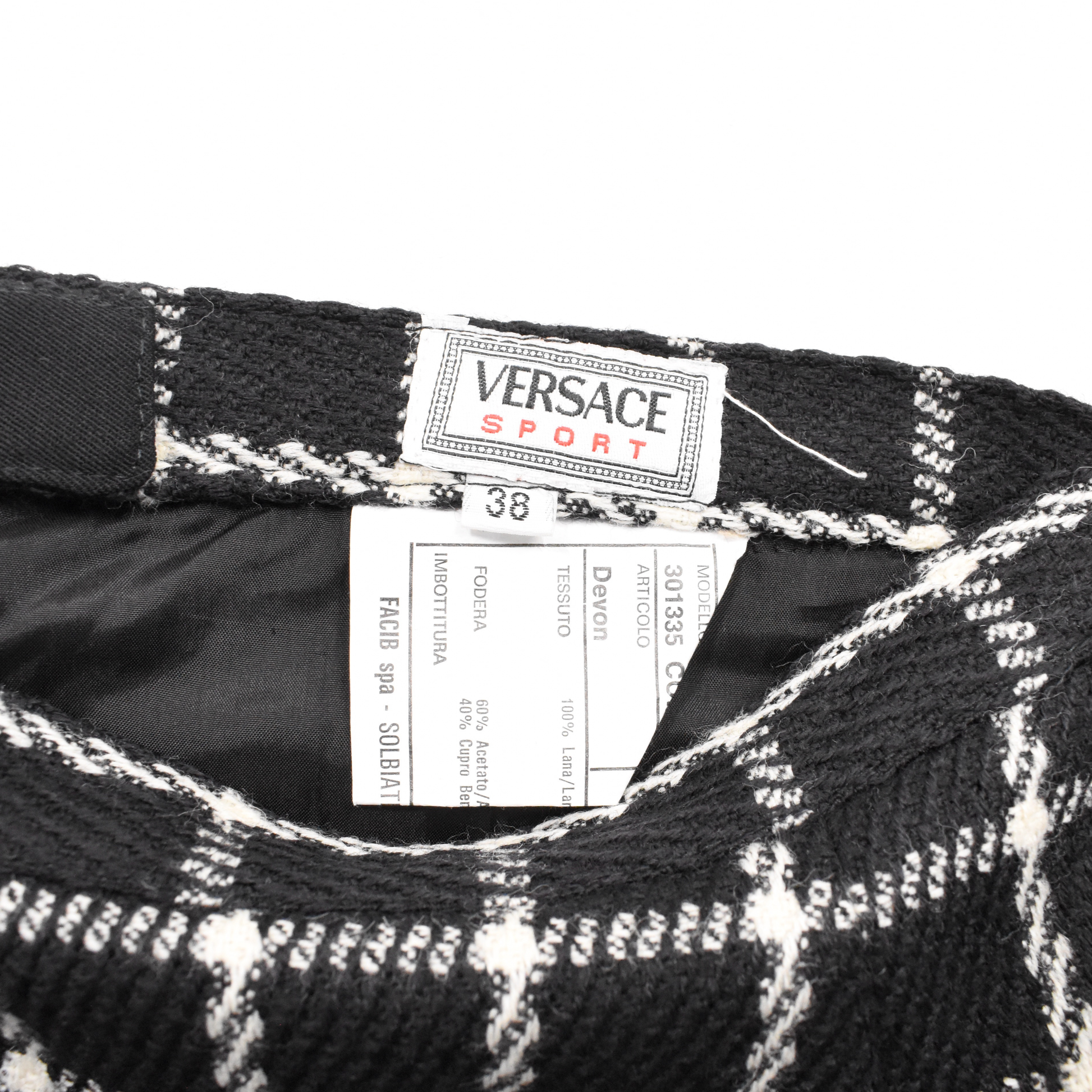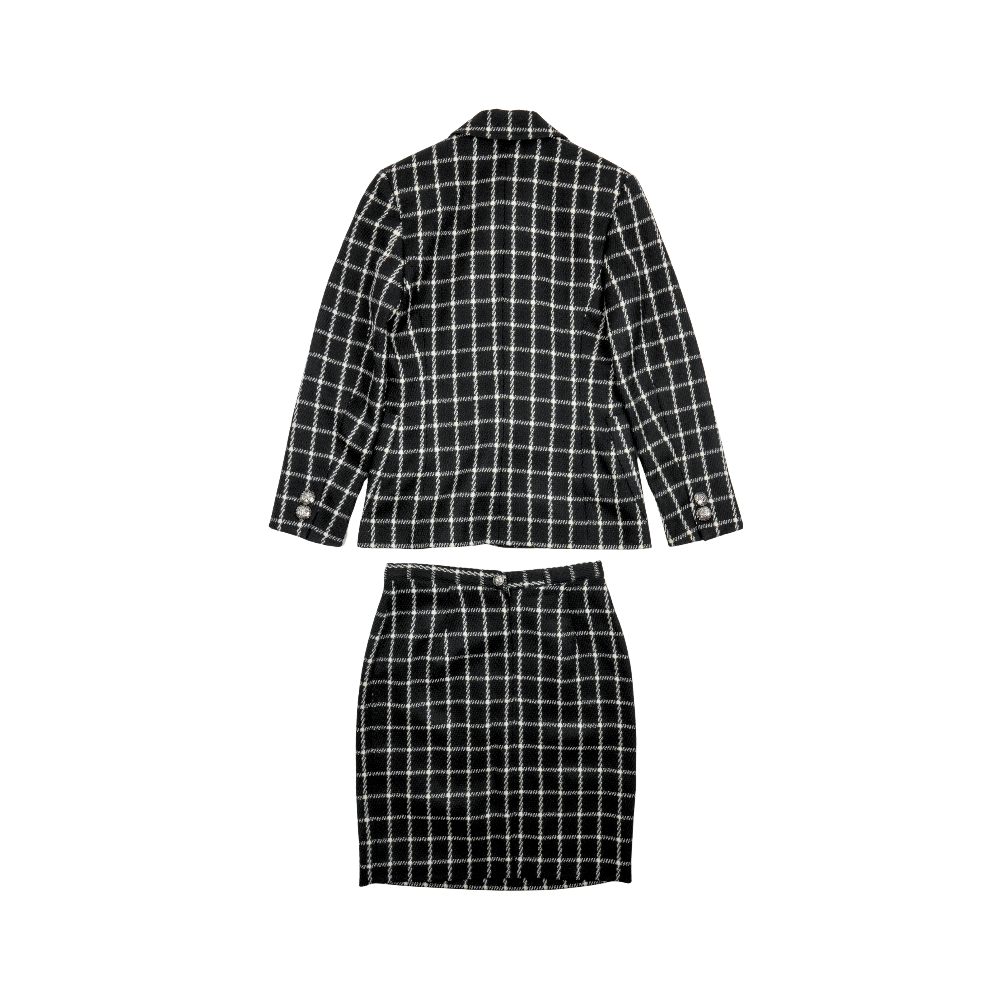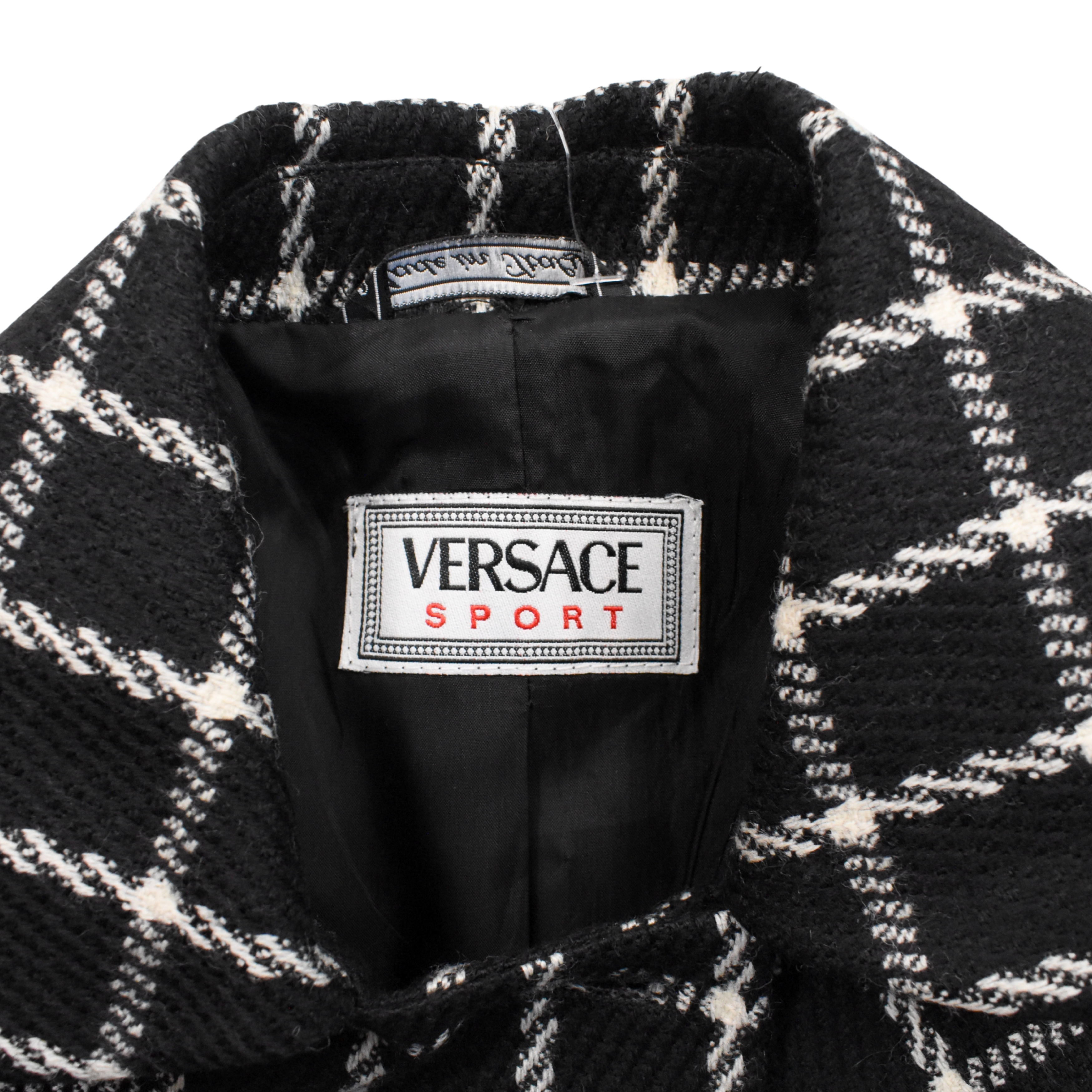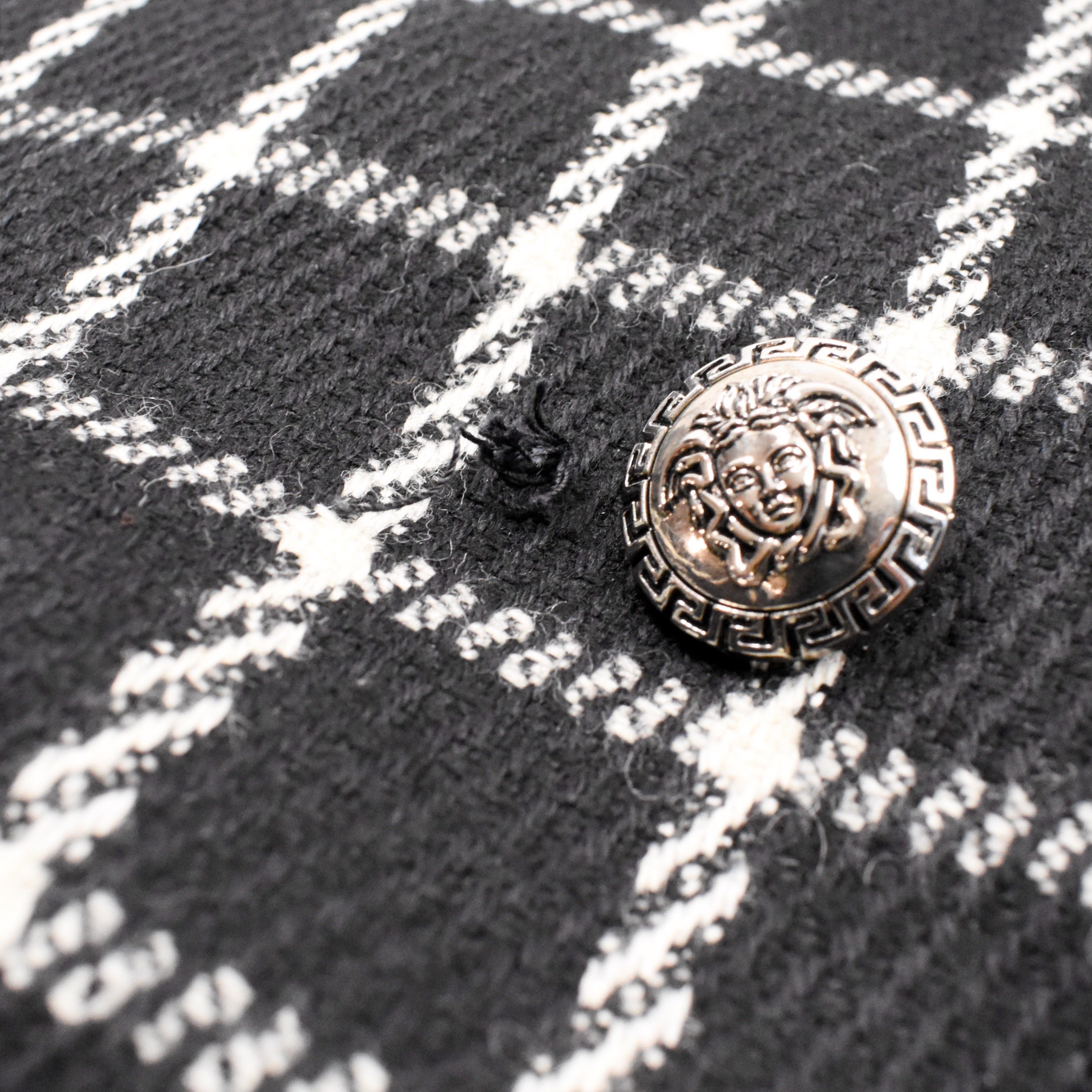 Versace Sport matching jacket and skirt two-piece set in black and white grid plaid all-over printed wool. Top is a double breasted blazer with gunmetal medusa head buttons, a notch collar and two front patch pockets. Bottom is a high waisted midi pencil skirt with medusa head button and zip closure, and a small slit in back centre seam.