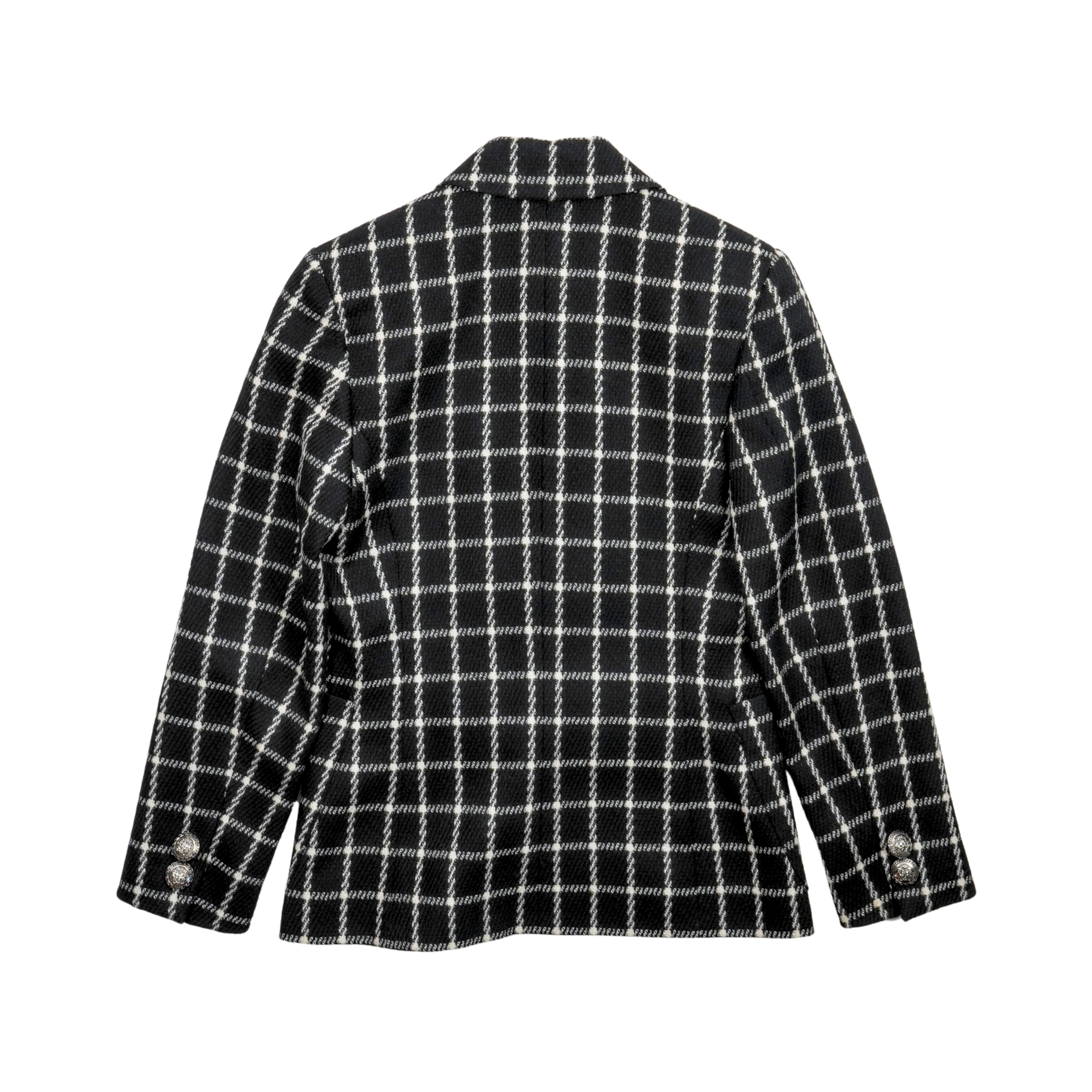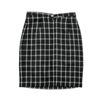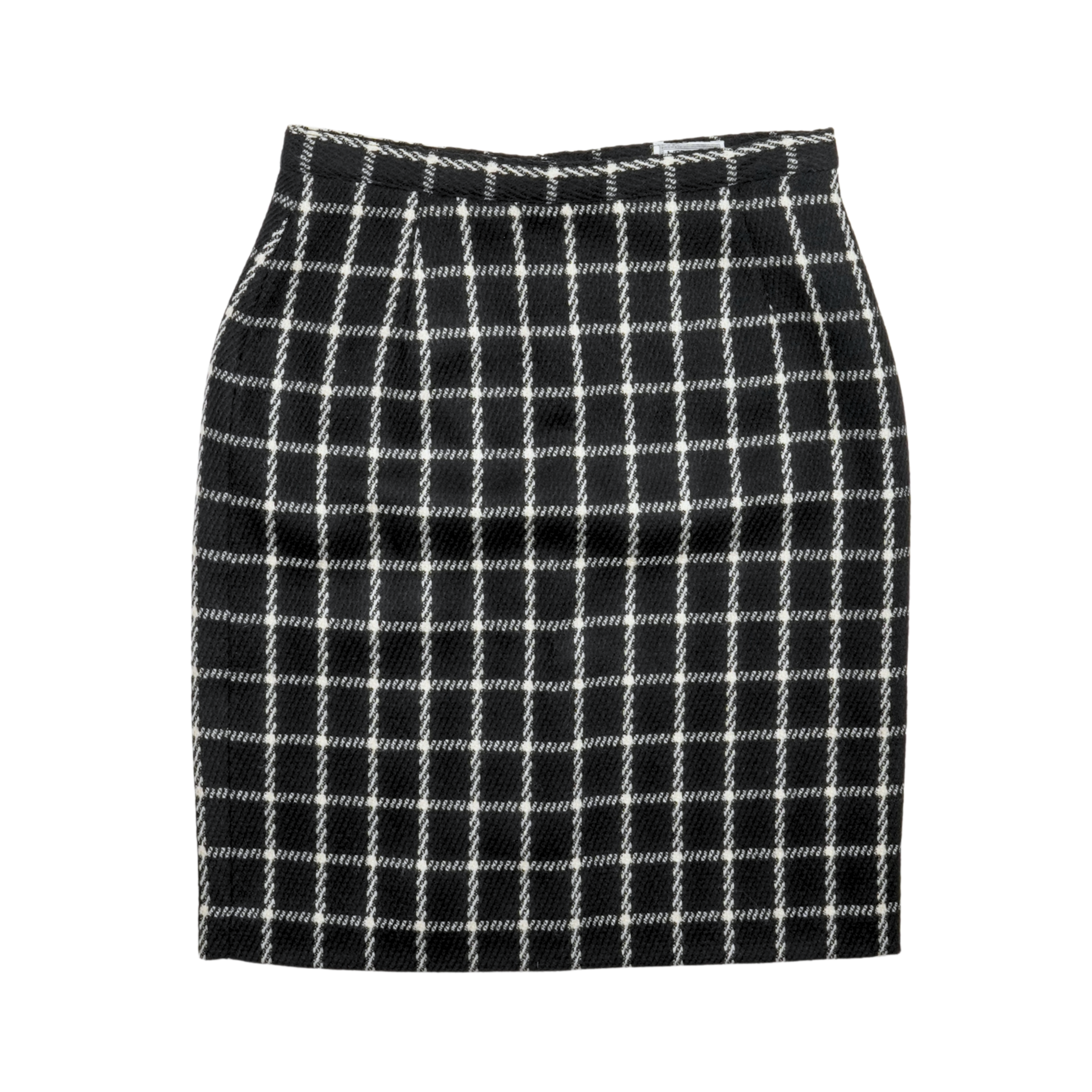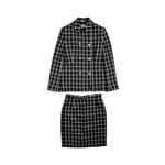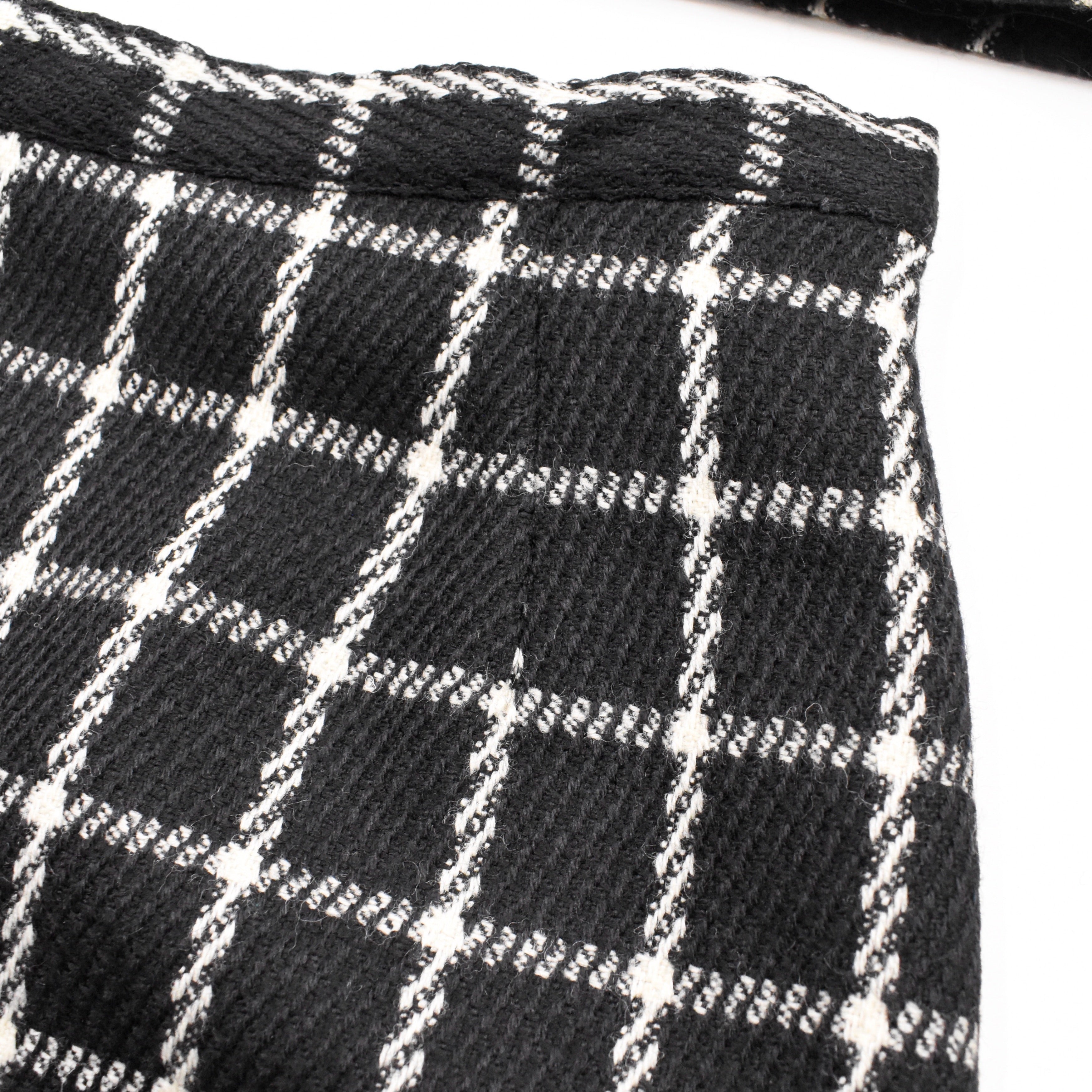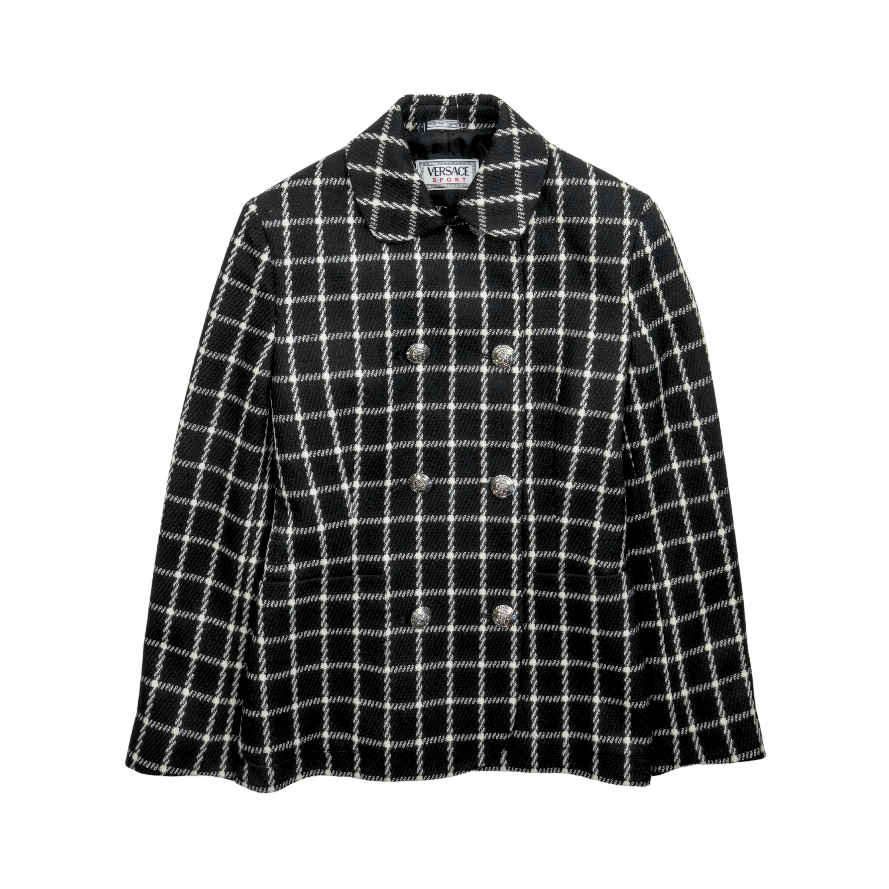 Versace Sport matching jacket and skirt two-piece set in black and white grid plaid all-over printed wool. Top is a double breasted blazer with gunmetal medusa head buttons, a notch collar and two front patch pockets. Bottom is a high waisted midi pencil skirt with medusa head button and zip closure, and a small slit in back centre seam.