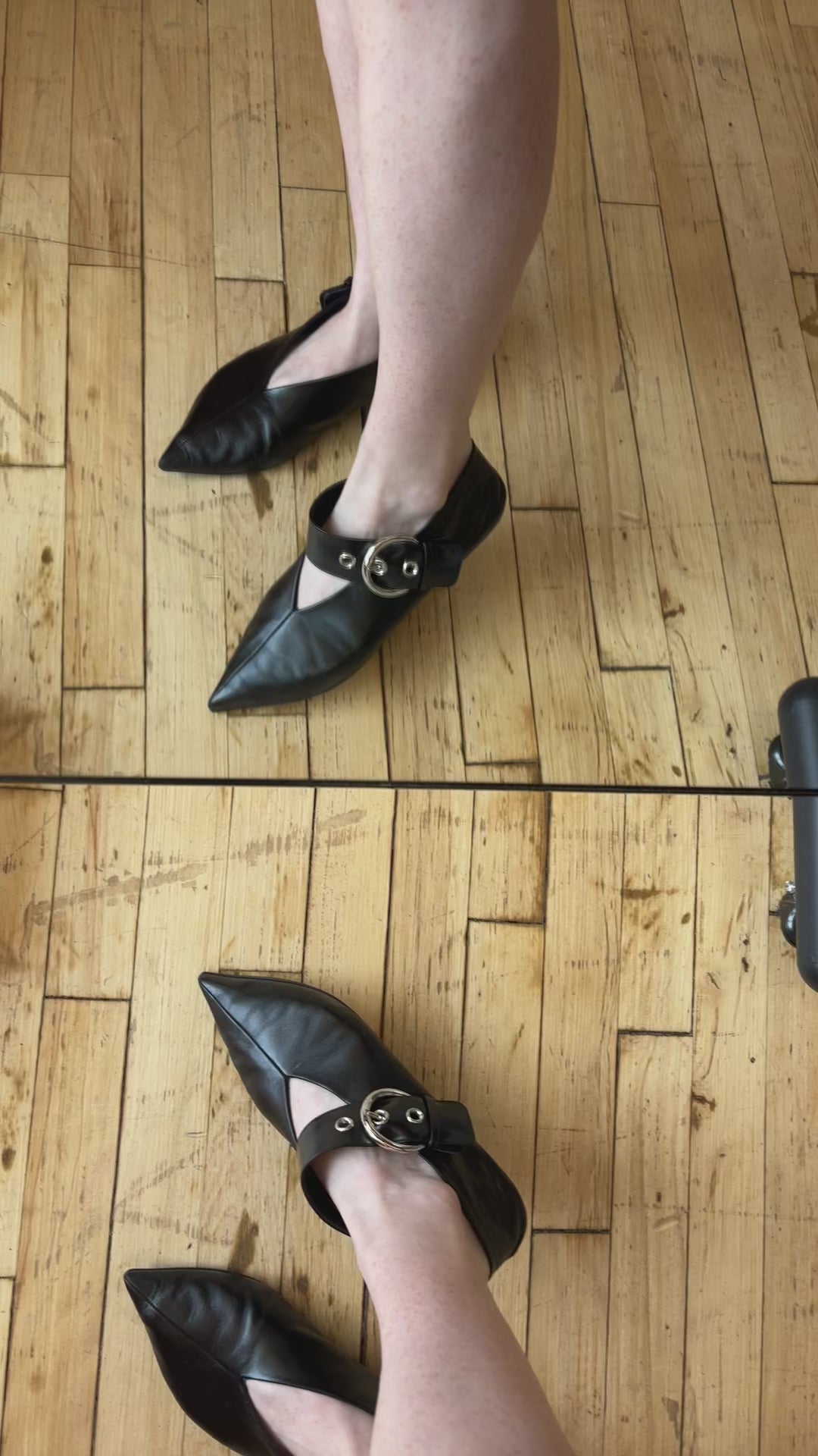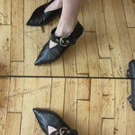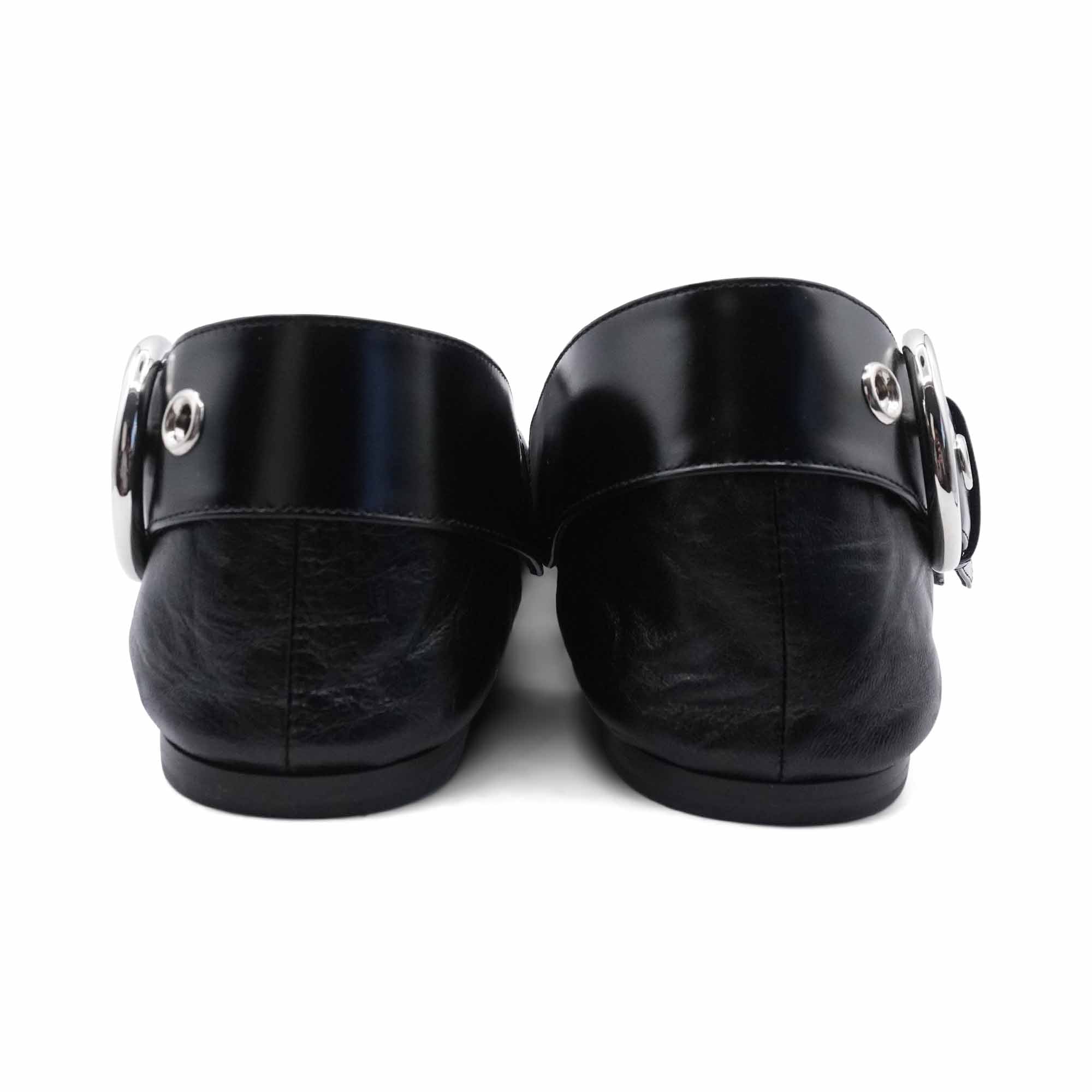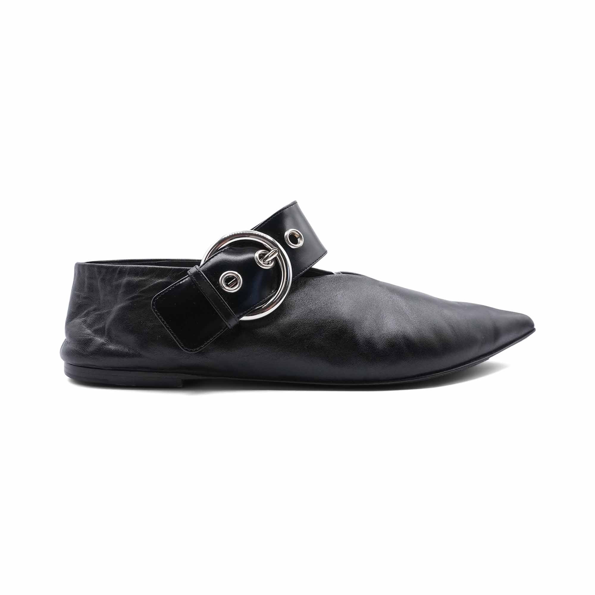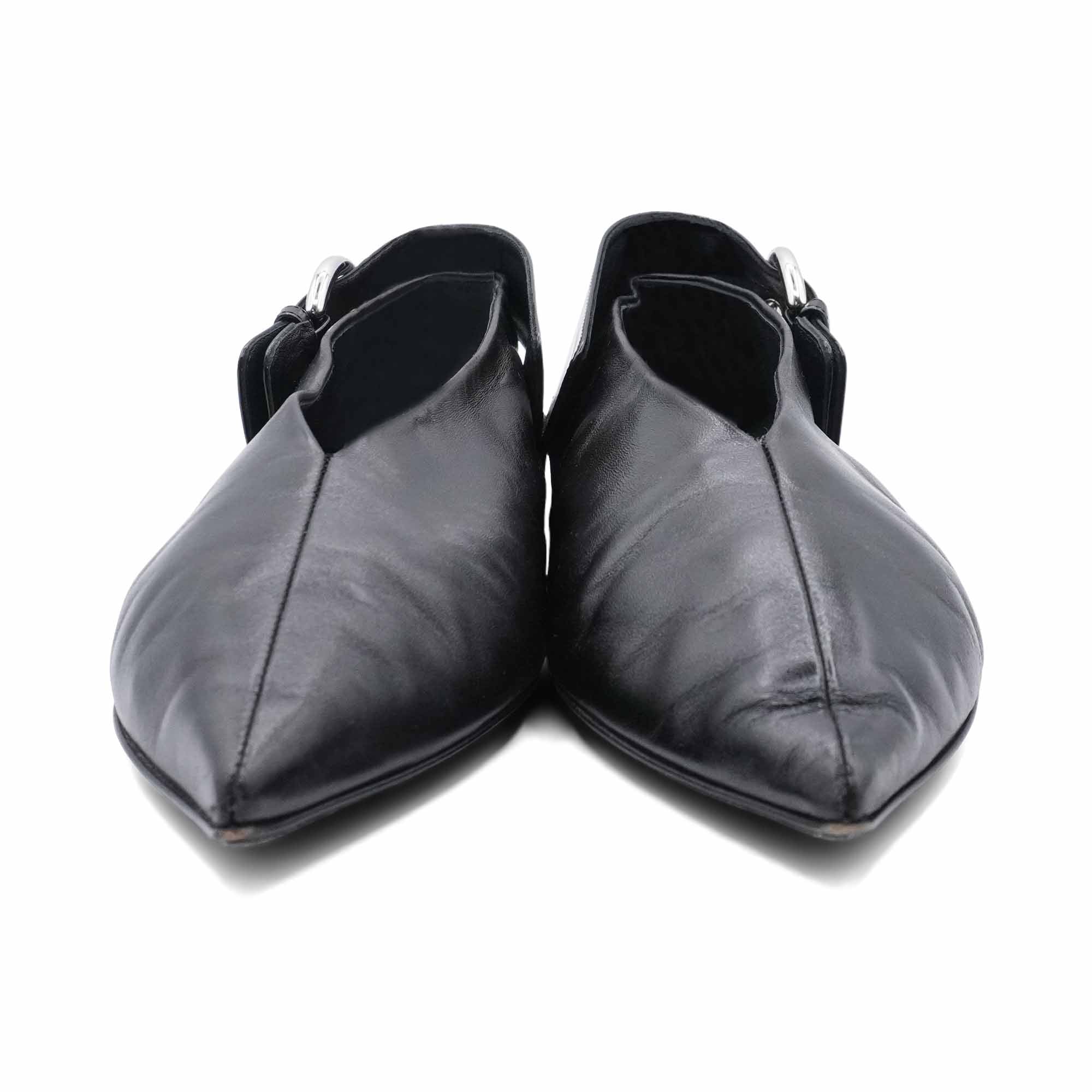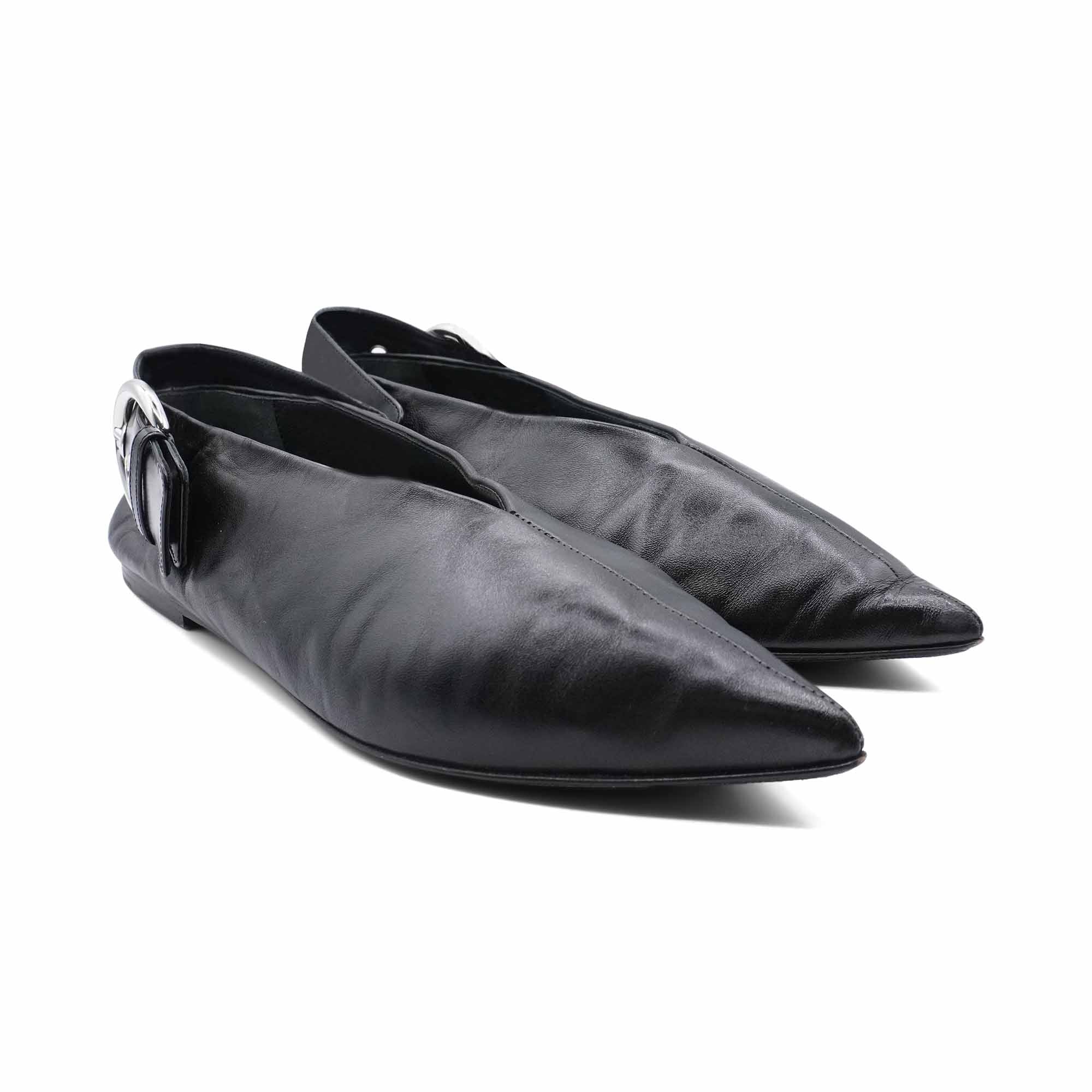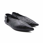 Celine pointed toe flats in black leather with a wide strap featuring large silver buckle that can be worn in front or behind the ankle.