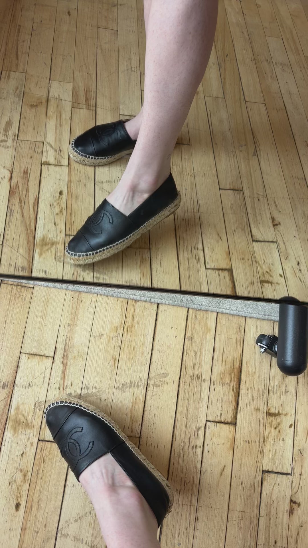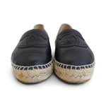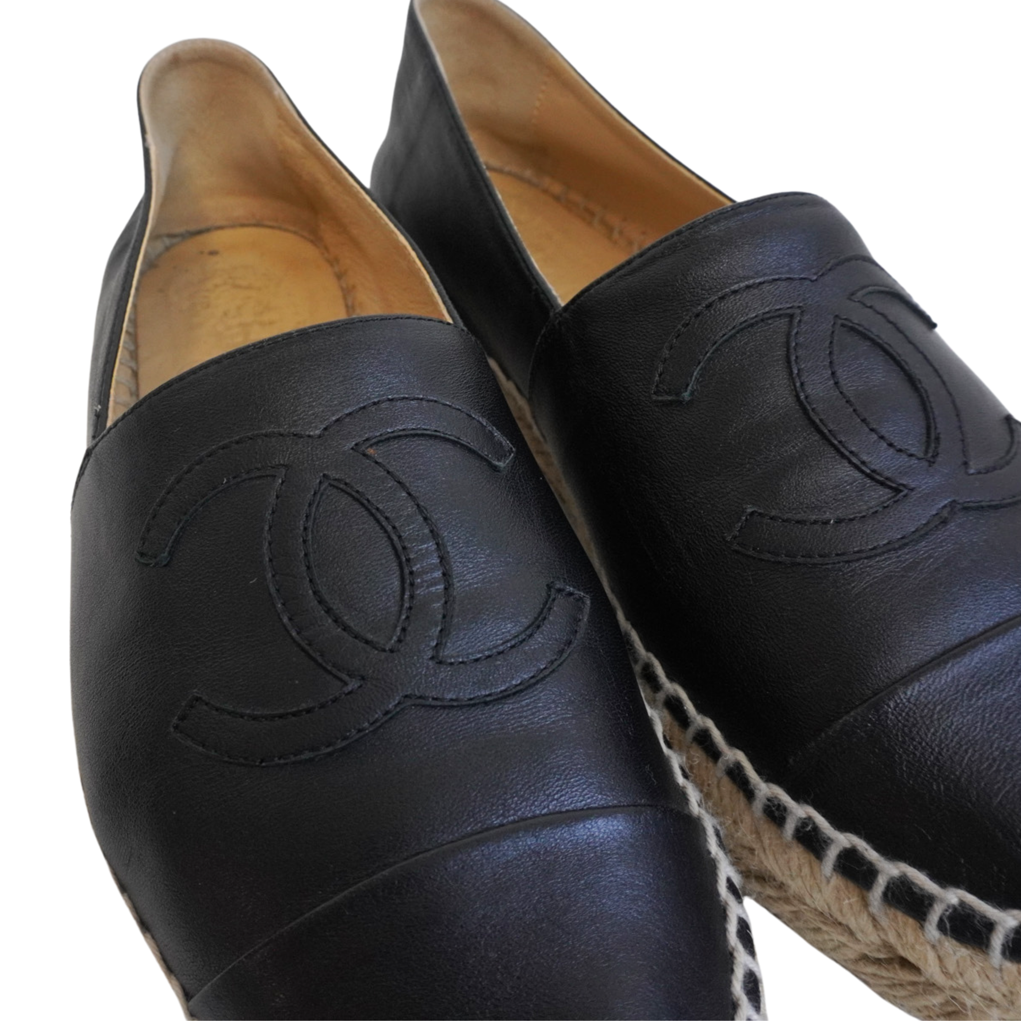 Chanel epadrilles in black lamb skin leather with CC logo patch and braided sole.