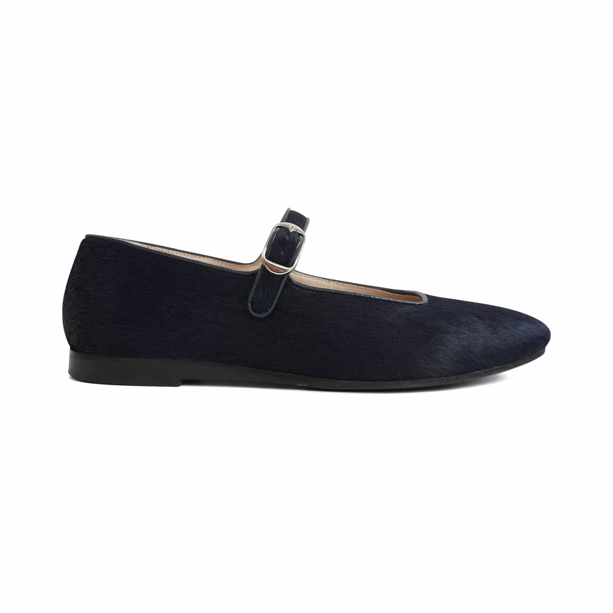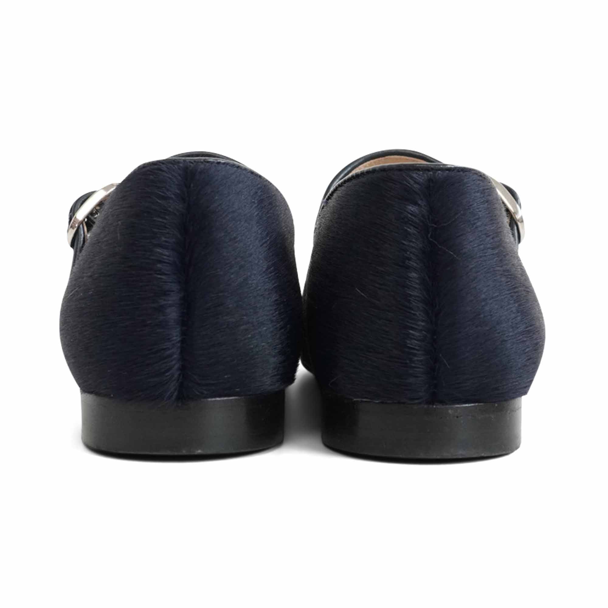 Le Monde Beryl mary jane style flats in navy blue pony hair with black leather trim and a strap with silver buckle hardware.