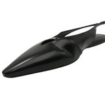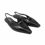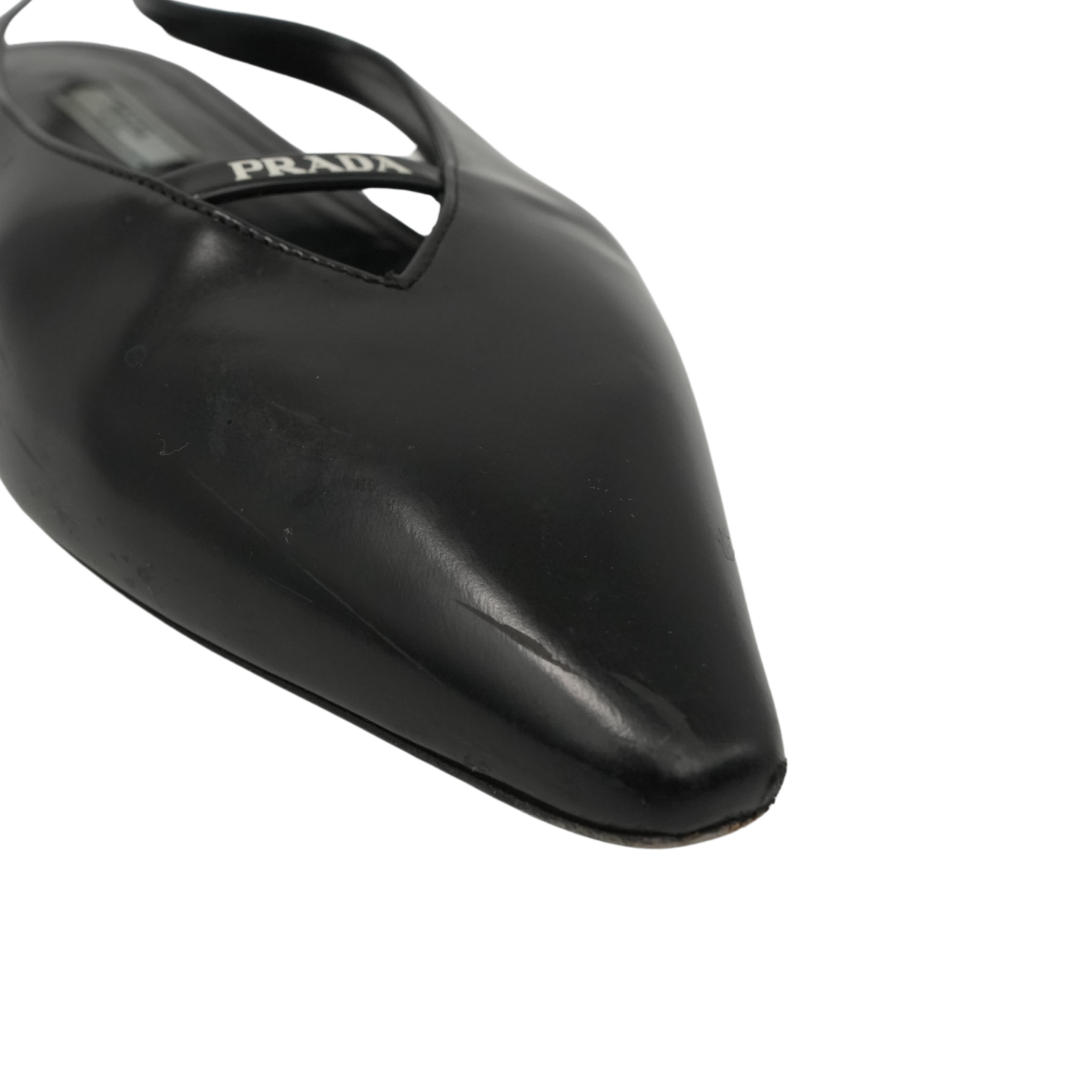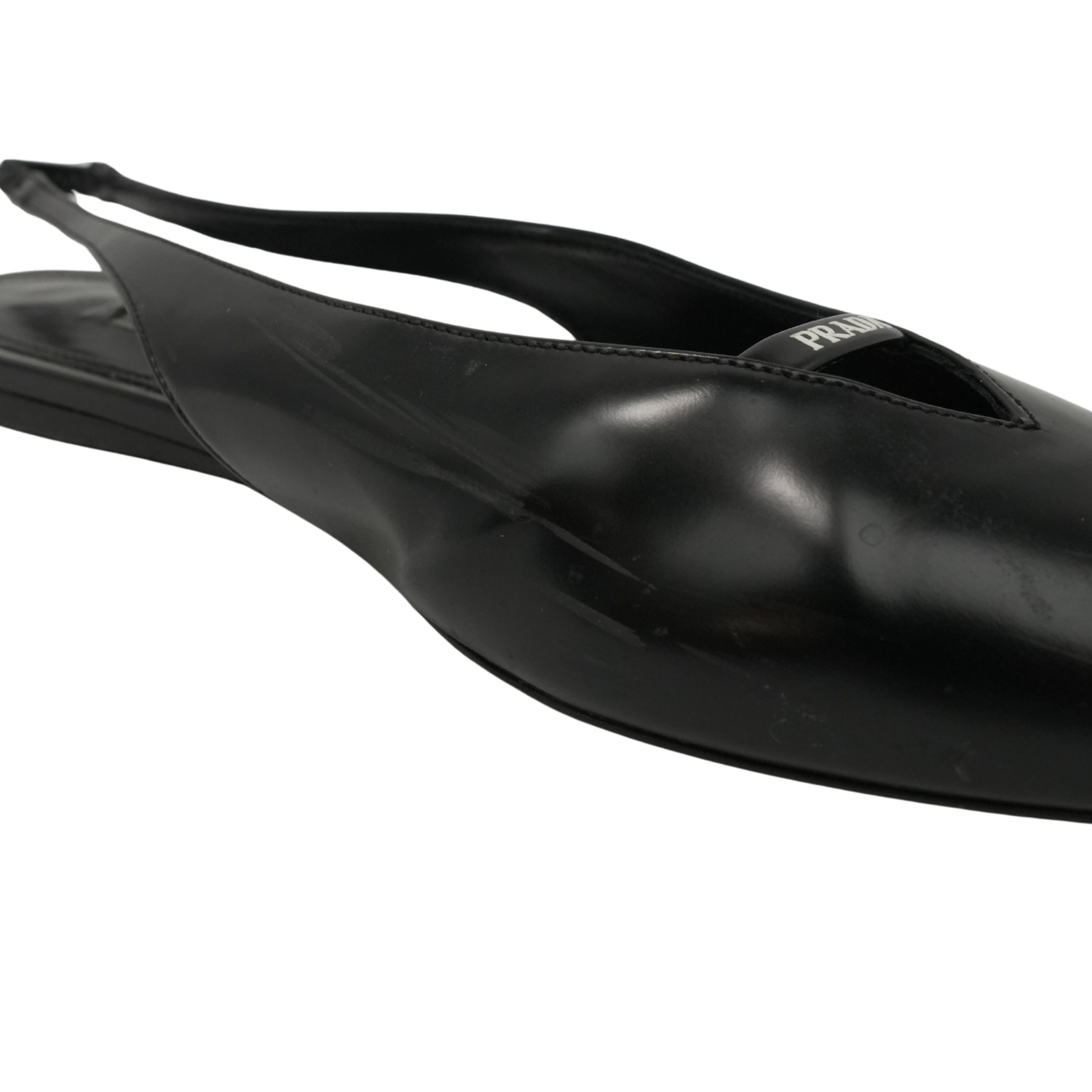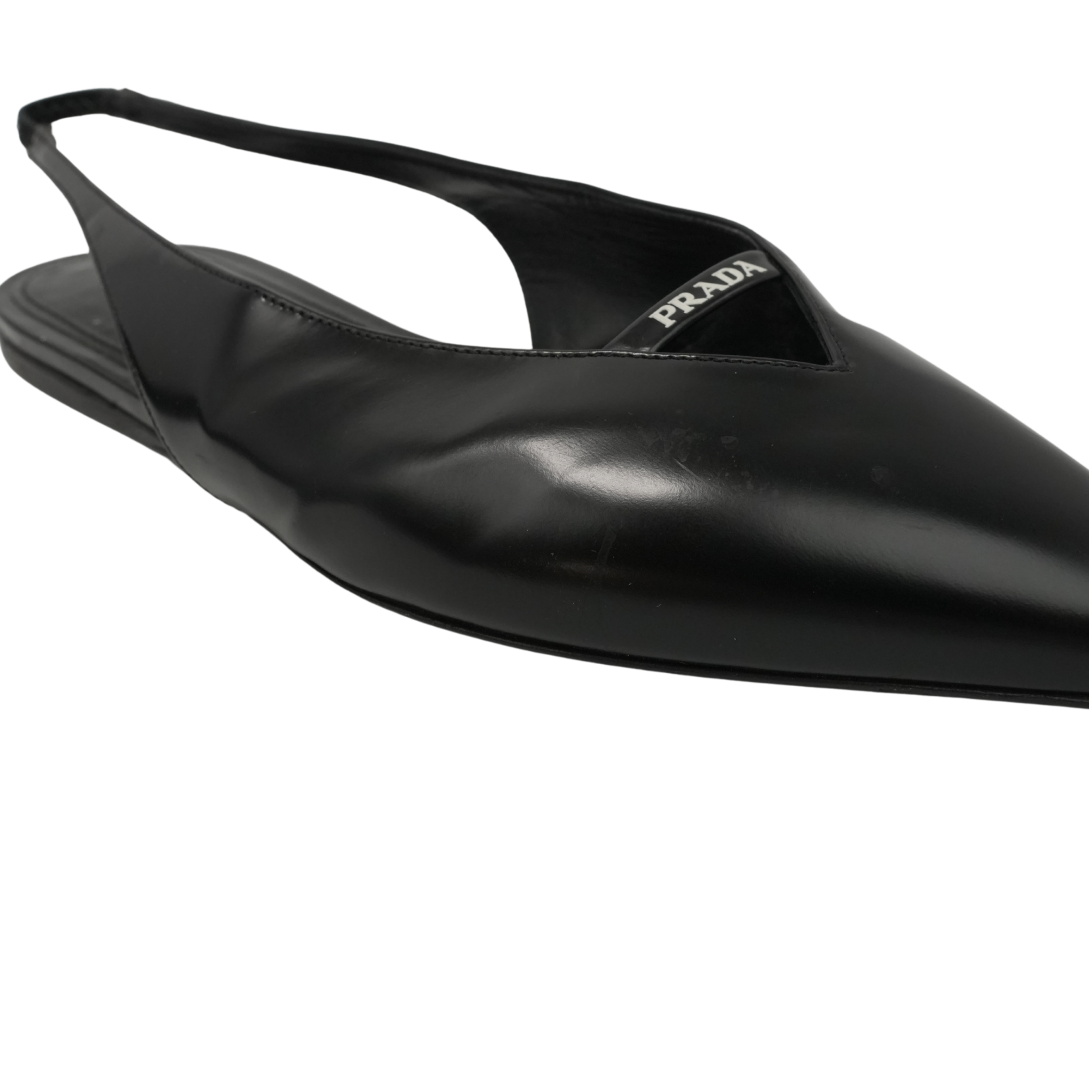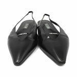 Prada slingback flats in black leather with a white logo on the top and a pointed toe.