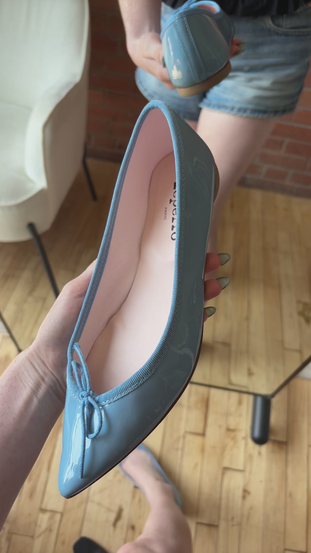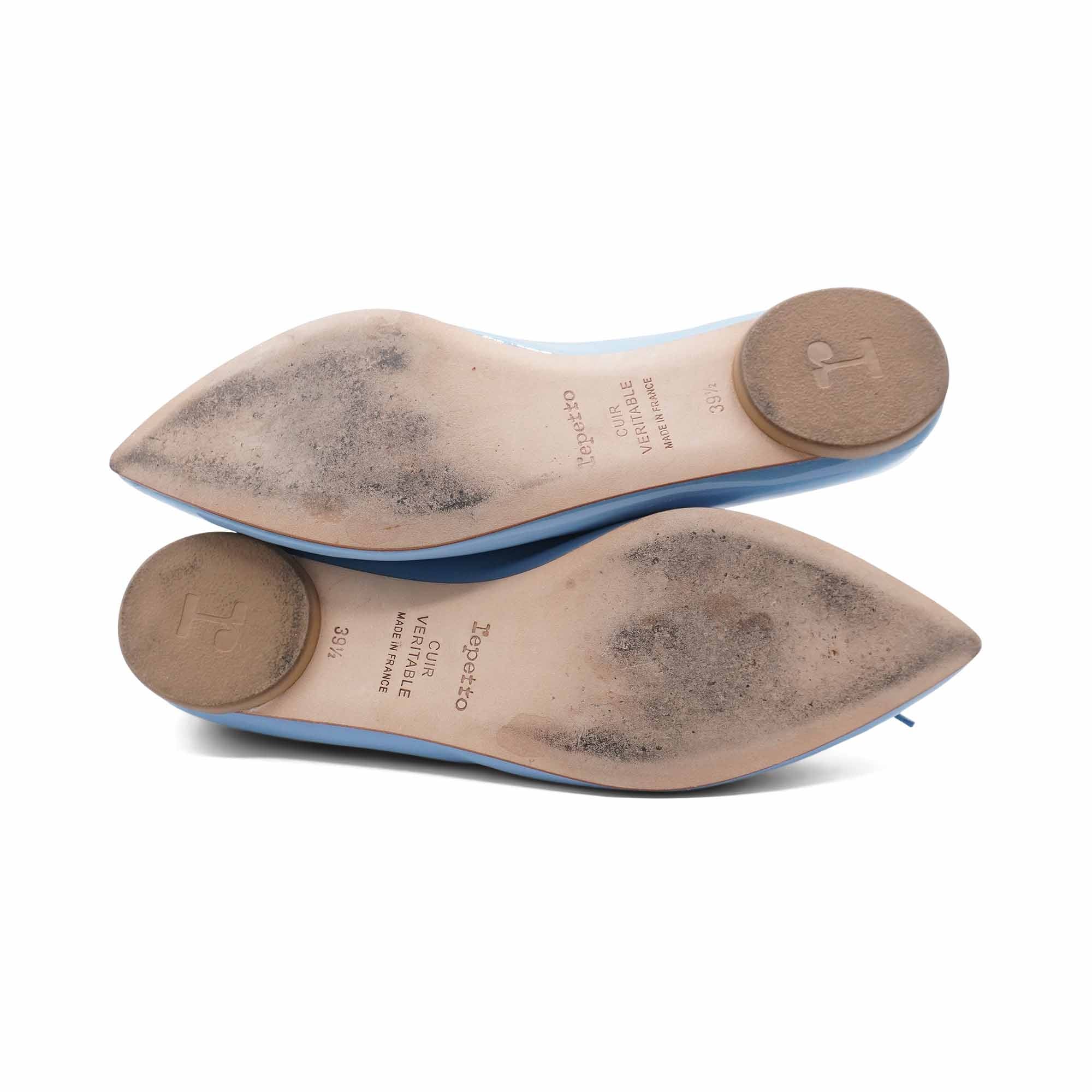 Repetto 'Rosa' flats in powder blue patent leather with a small bow detail and a pointed toe.