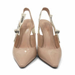 Christian Dior 'J'Adior' slingback pumps in nude beige patent leather with a canvas stretch monogram slingback strap and a bow detail on the side.