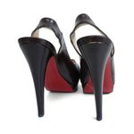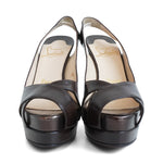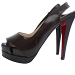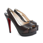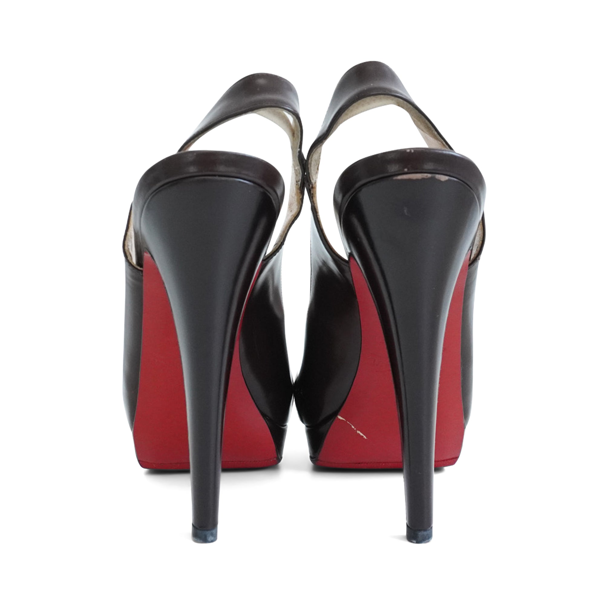 Christian Louboutin 'Soso' slingback heel in dark brown leather with criss cross toe straps and platform soles.