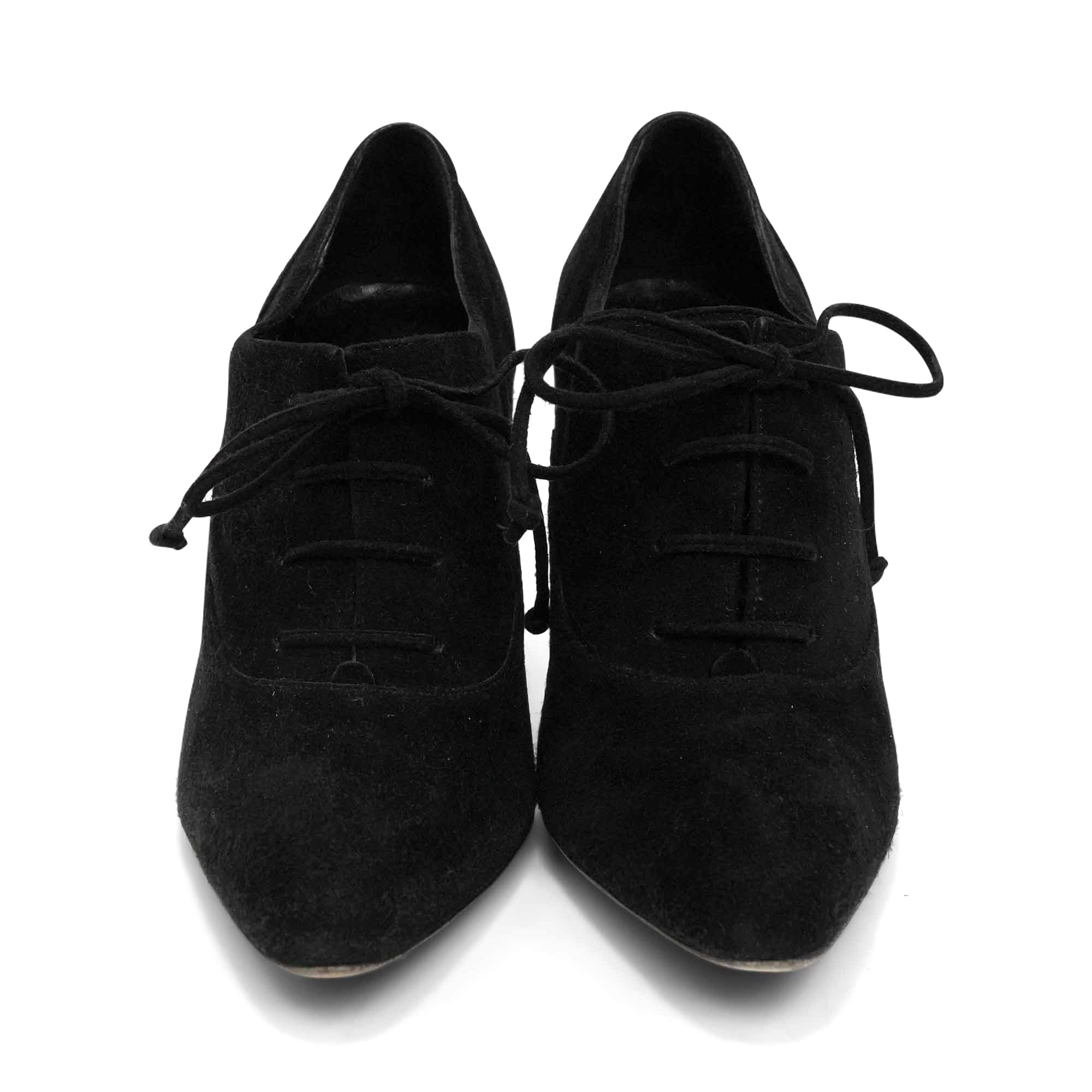 Manolo Blahnik heeled booties in black suede with a lace up detail, a wooden stiletto heel, and an almond toe.