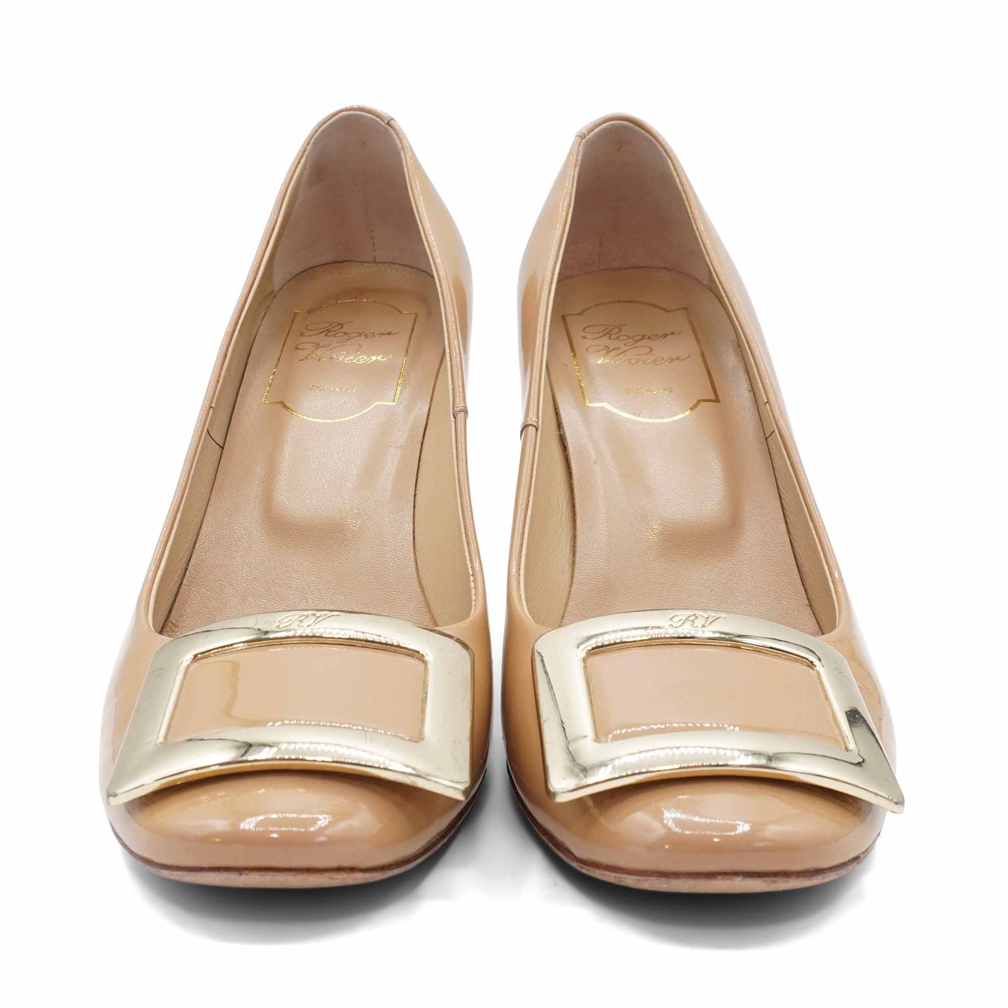 Roger Vivier almond toe pumps in tan patent leather with gold buckle on upper and curved heel.