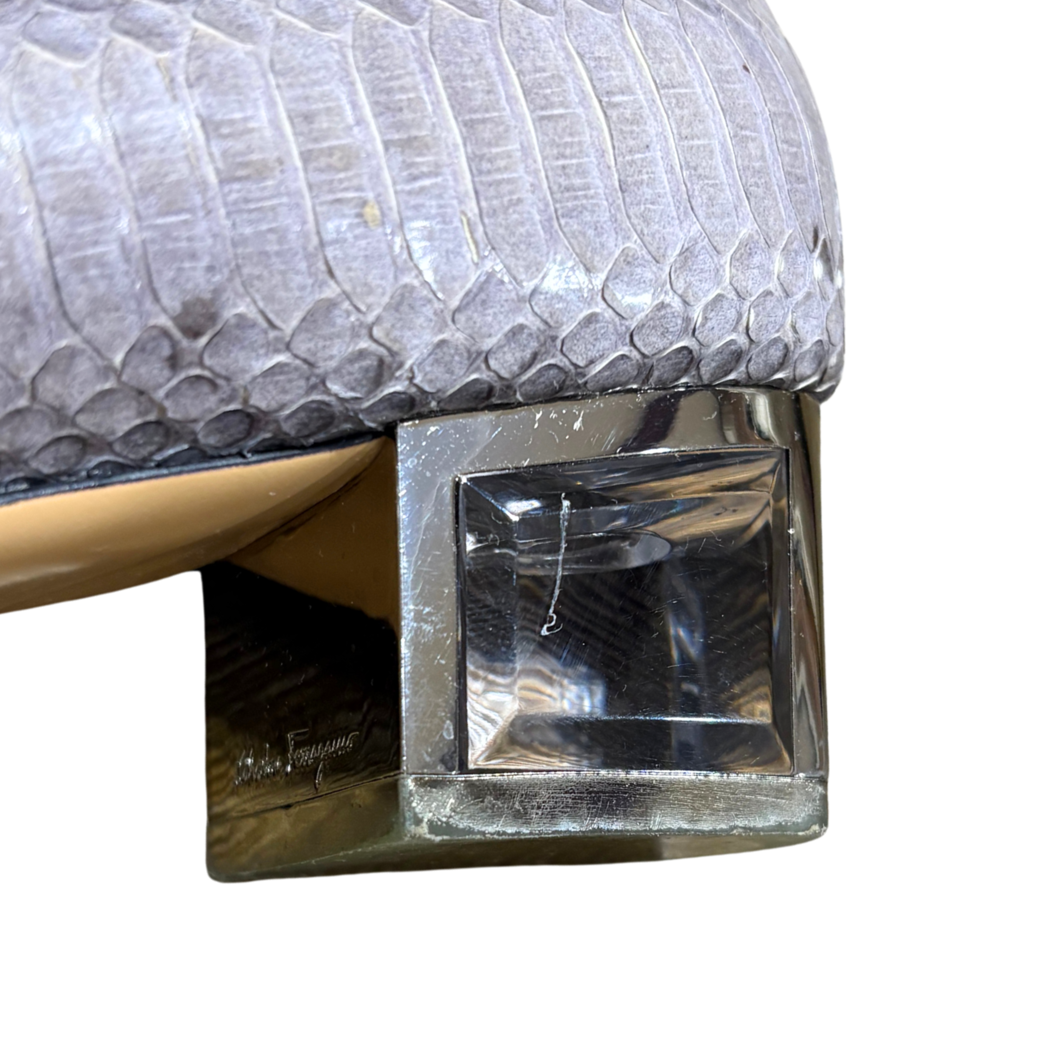 Salvatore Ferragamo round toe heels in purple snakeskin with a jewel heel encased in silver hardware.