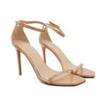Stuart Weitzman 'Nudistcurve' heels in nude beige patent leather with an ankle strap and gold buckle hardware.
