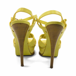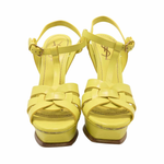 Yves Saint Laurent platform 'Tribute' sandals in yellow leather with wooden details. Features a peep toe, adjustable t-strap, cut outs on upper foot and a gold buckle.