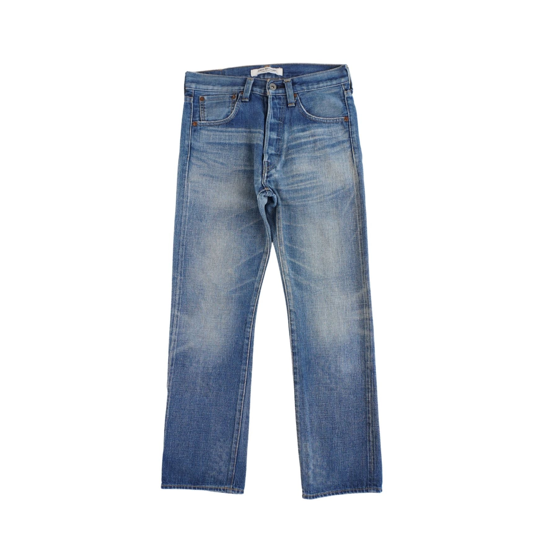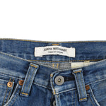 Junya Watanabe high-waisted straight-leg jeans in medium-blue wash denim. Features a full button-fly, front and back slip pockets, and a brown leather logo patch on the back waistband.