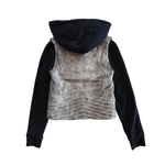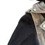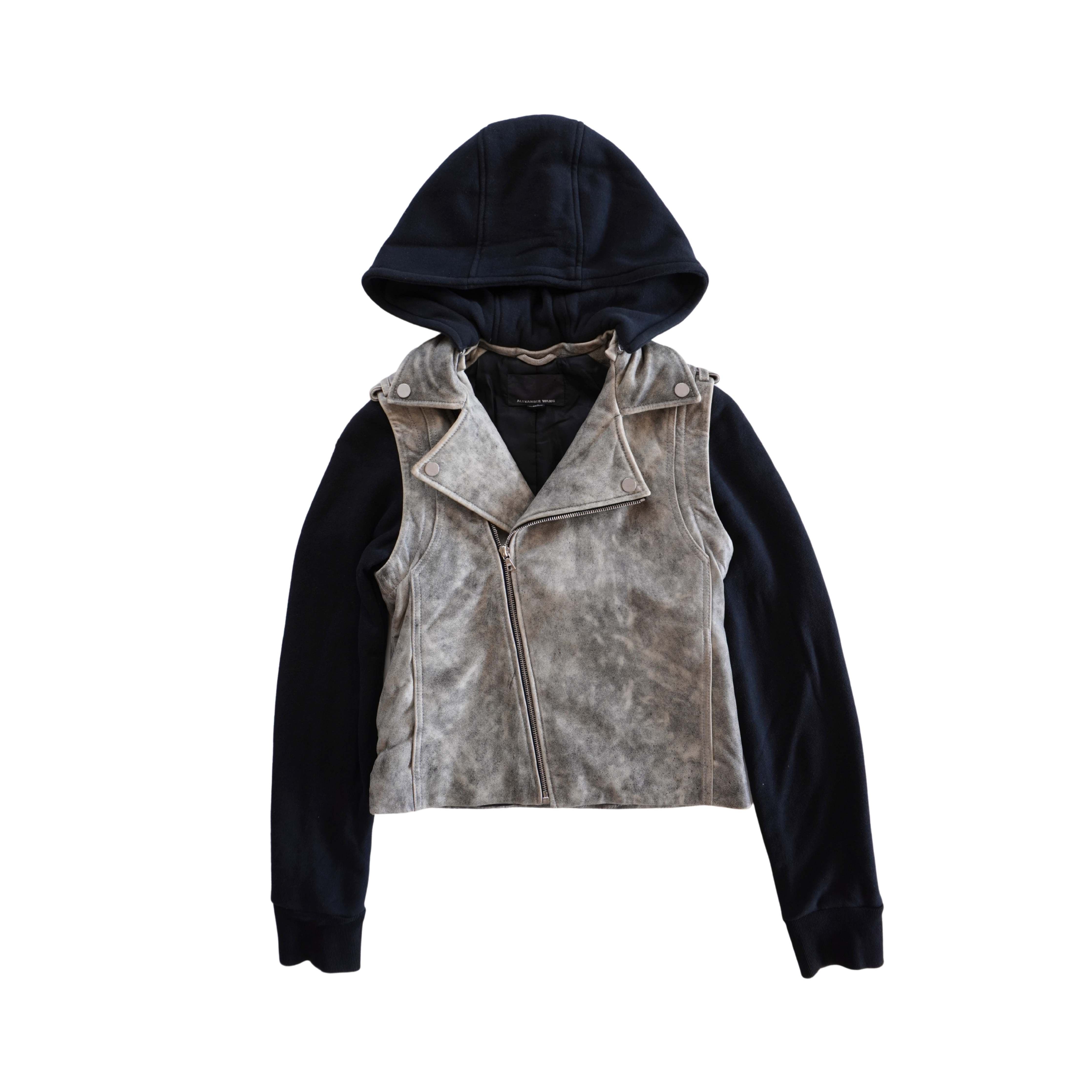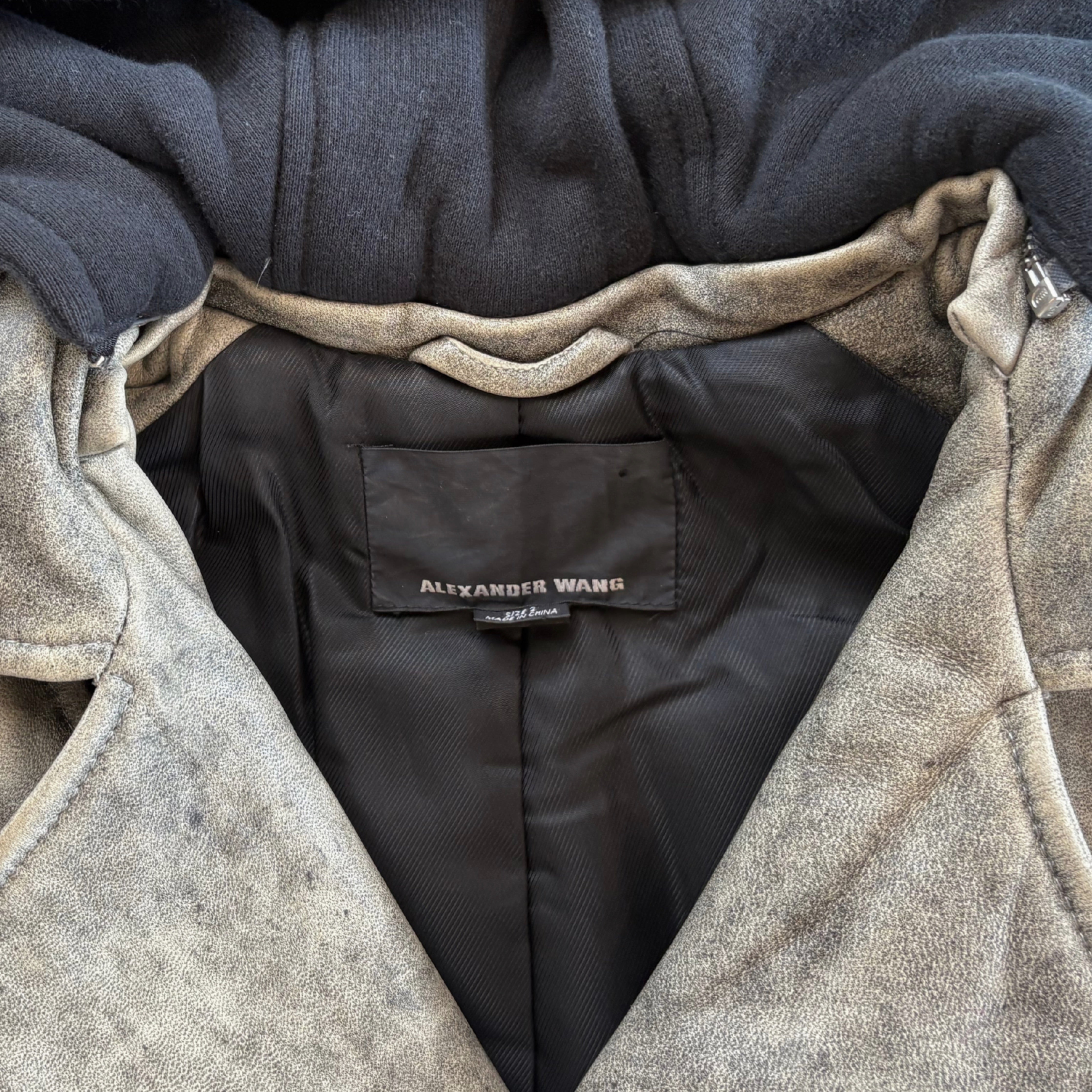 Alexander Wang vest jacket in grey distressed leather with black cotton removable sleeves and hood. Featuring side seam pockets, shoulder epaulettes and decorative panel lines on the back.