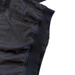 Bape bomber jacket in black nylon with a holographic logo patch on the chest, pink logo down the zipper, and ribbed cuffs and hem. Features two front slip pockets, a shoulder zip pocket and pink writing on the back.