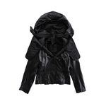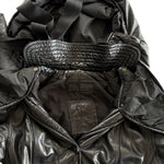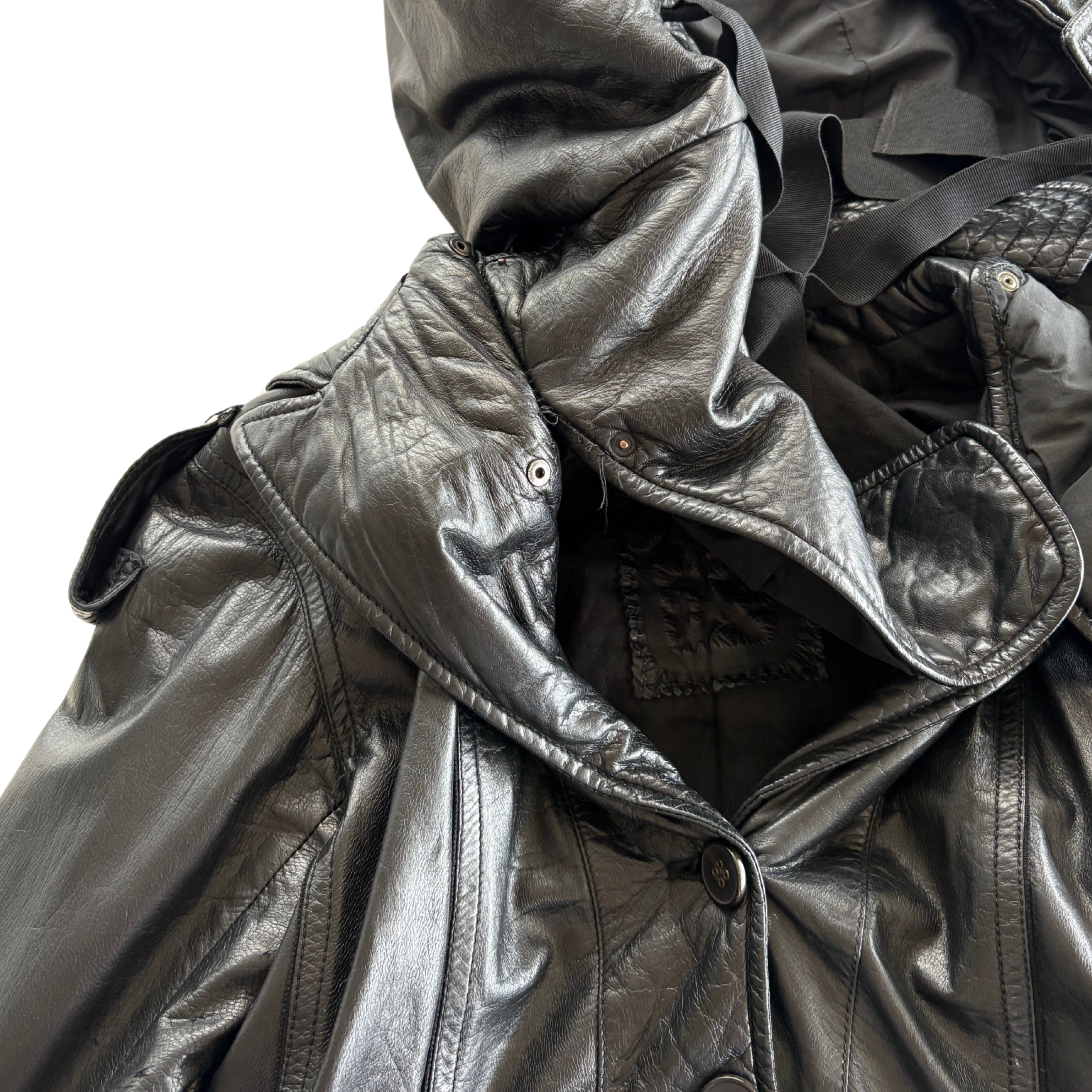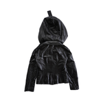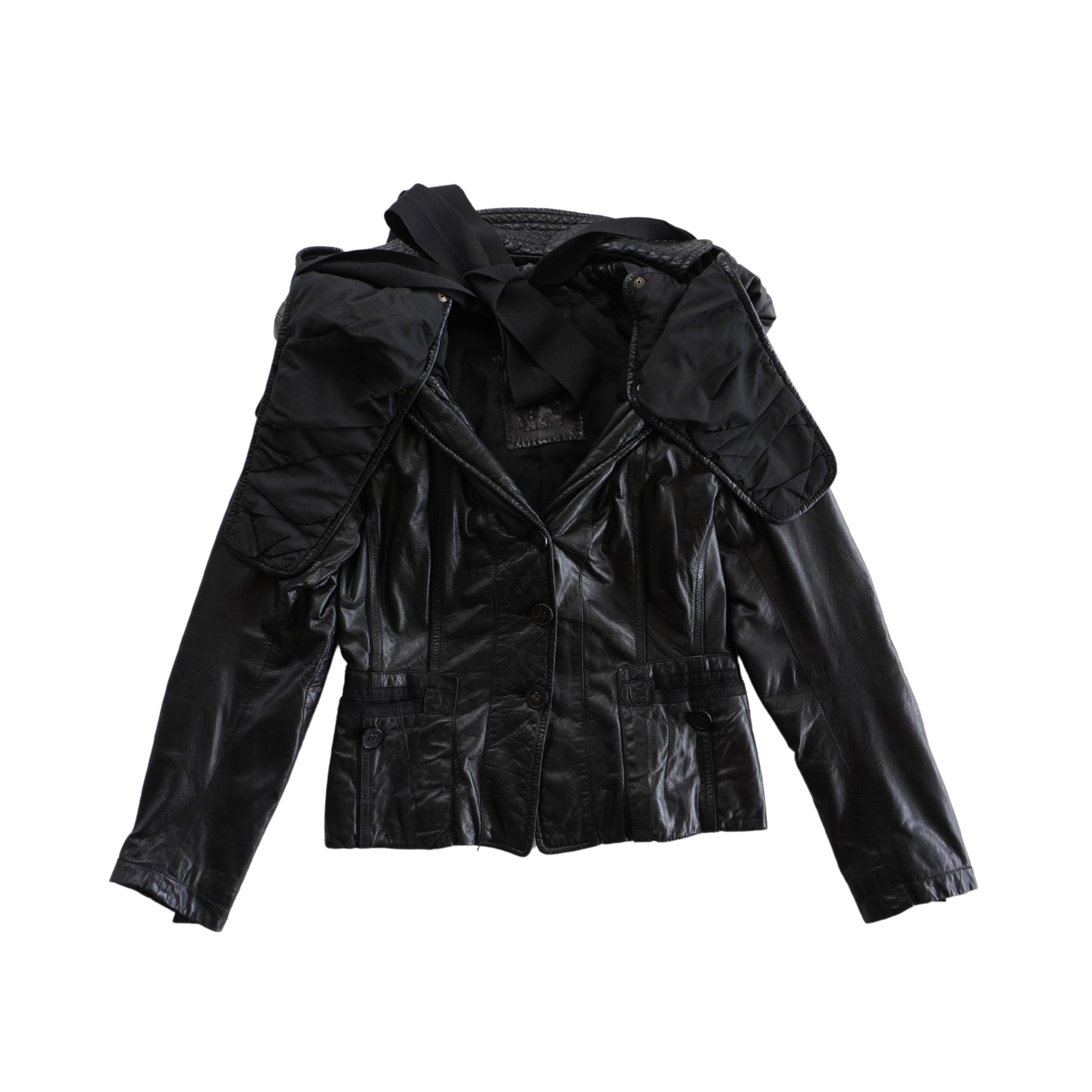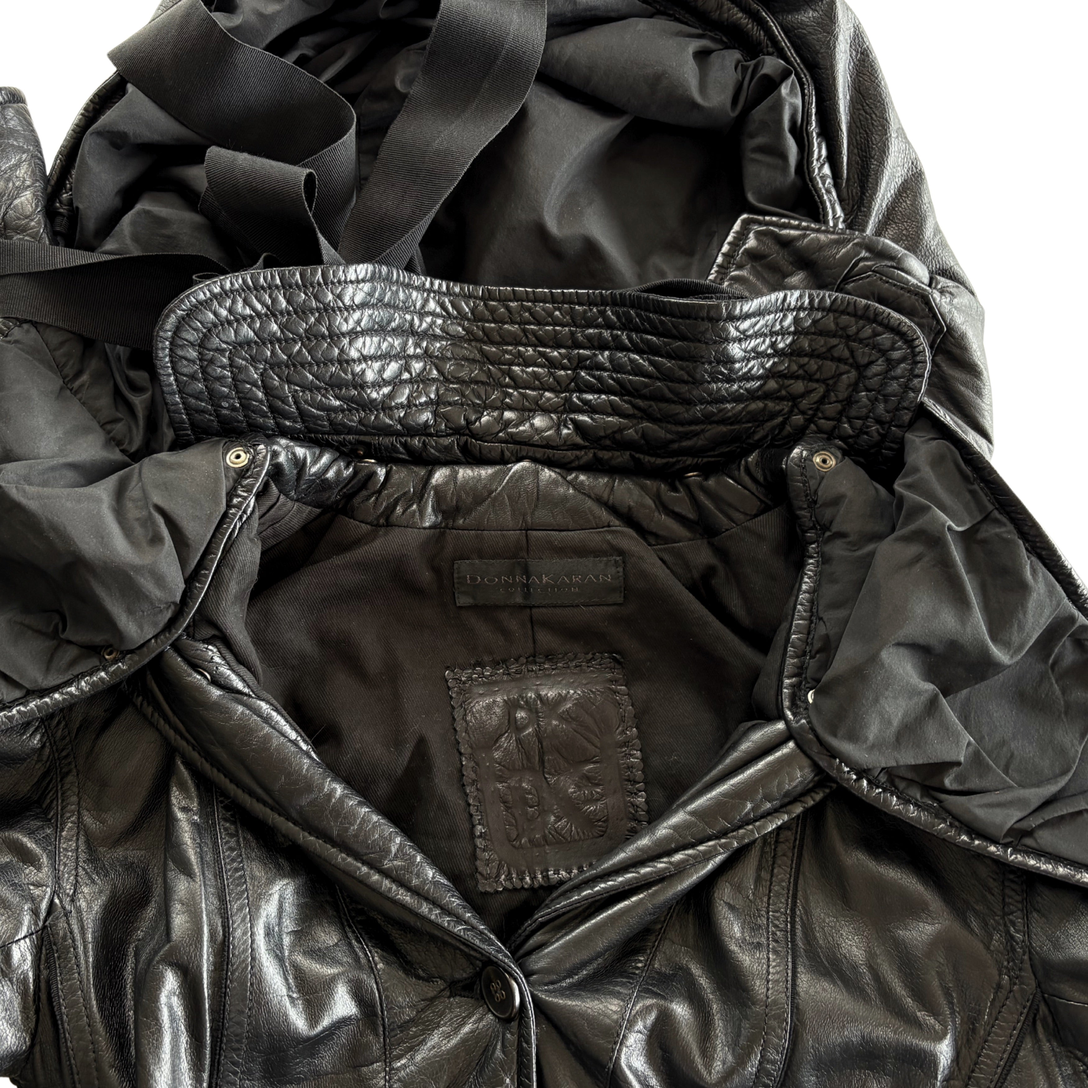 Donna Karan Collection black leather jacket with oversized hood, button closure, and grosgrain ribbon bow detail. Features quilted elbows and patch pockets.
