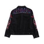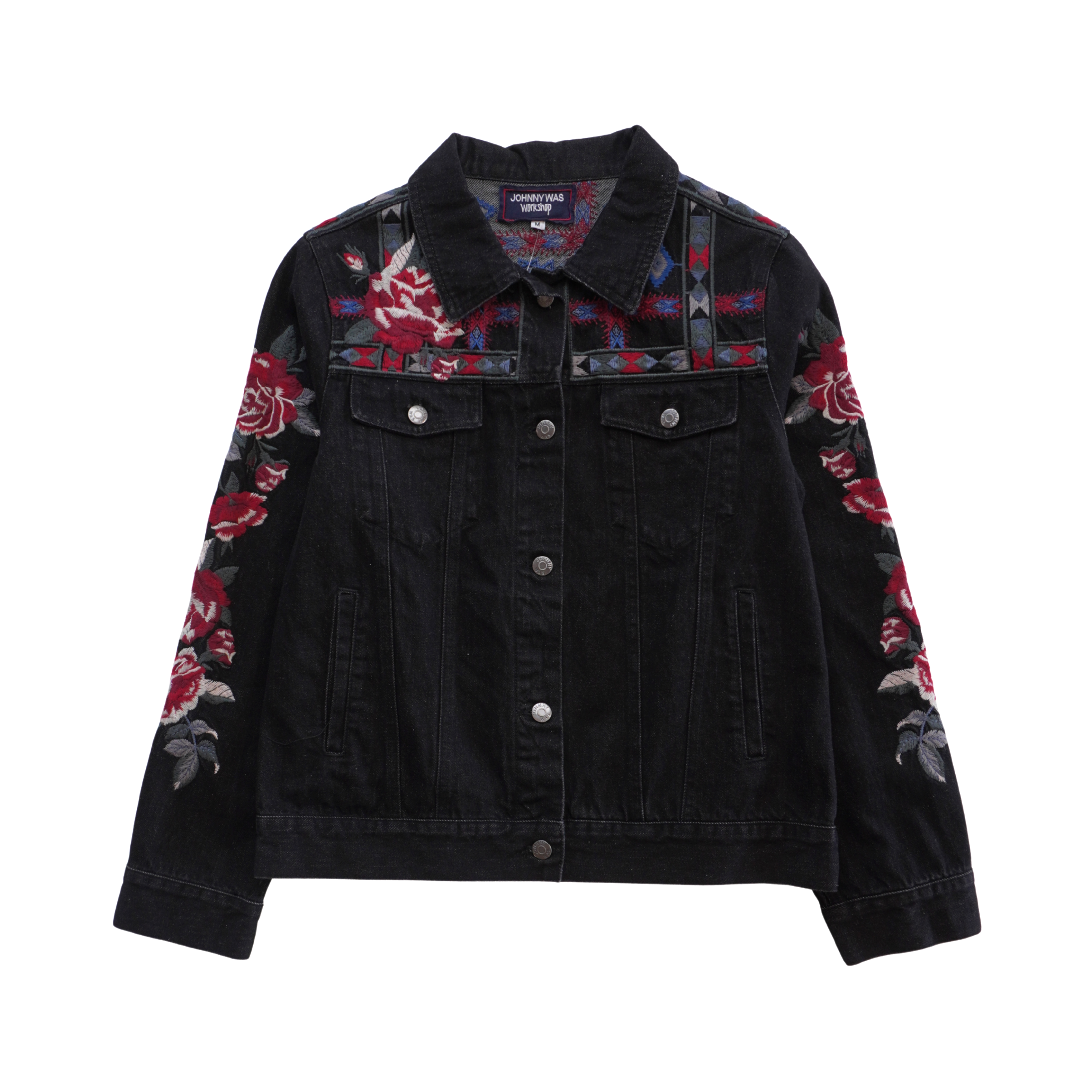 Johnny Was Workshop black denim jacket with red and white emrbodiered roses on the sleeves, geometric stitching on the yoke, and four pocket styling.