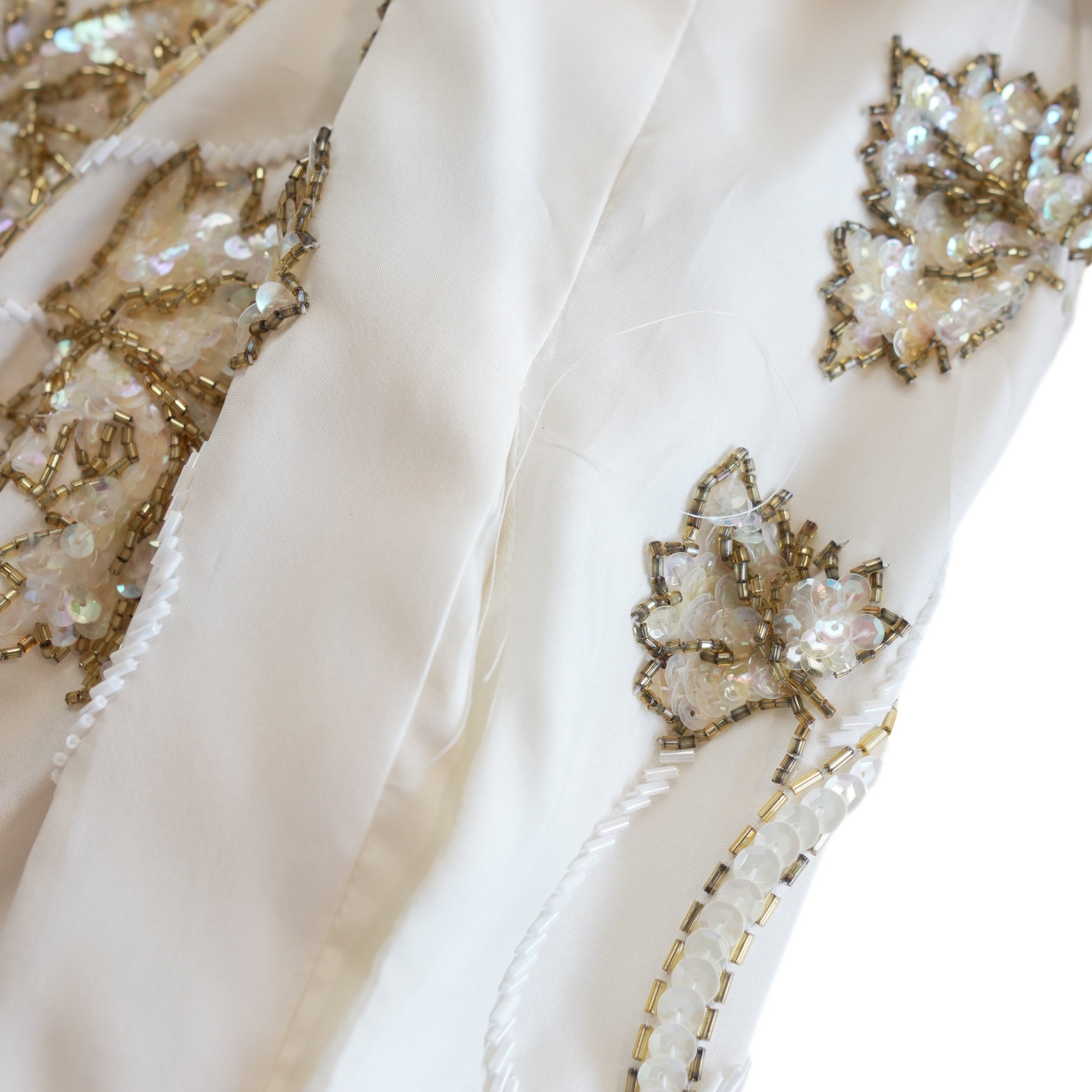 Marni Knits bomber jacket in cream silk with white, gold and iridescent beaded flower graphics throughout, a front zip opening in white hardware, and padded shoulders.