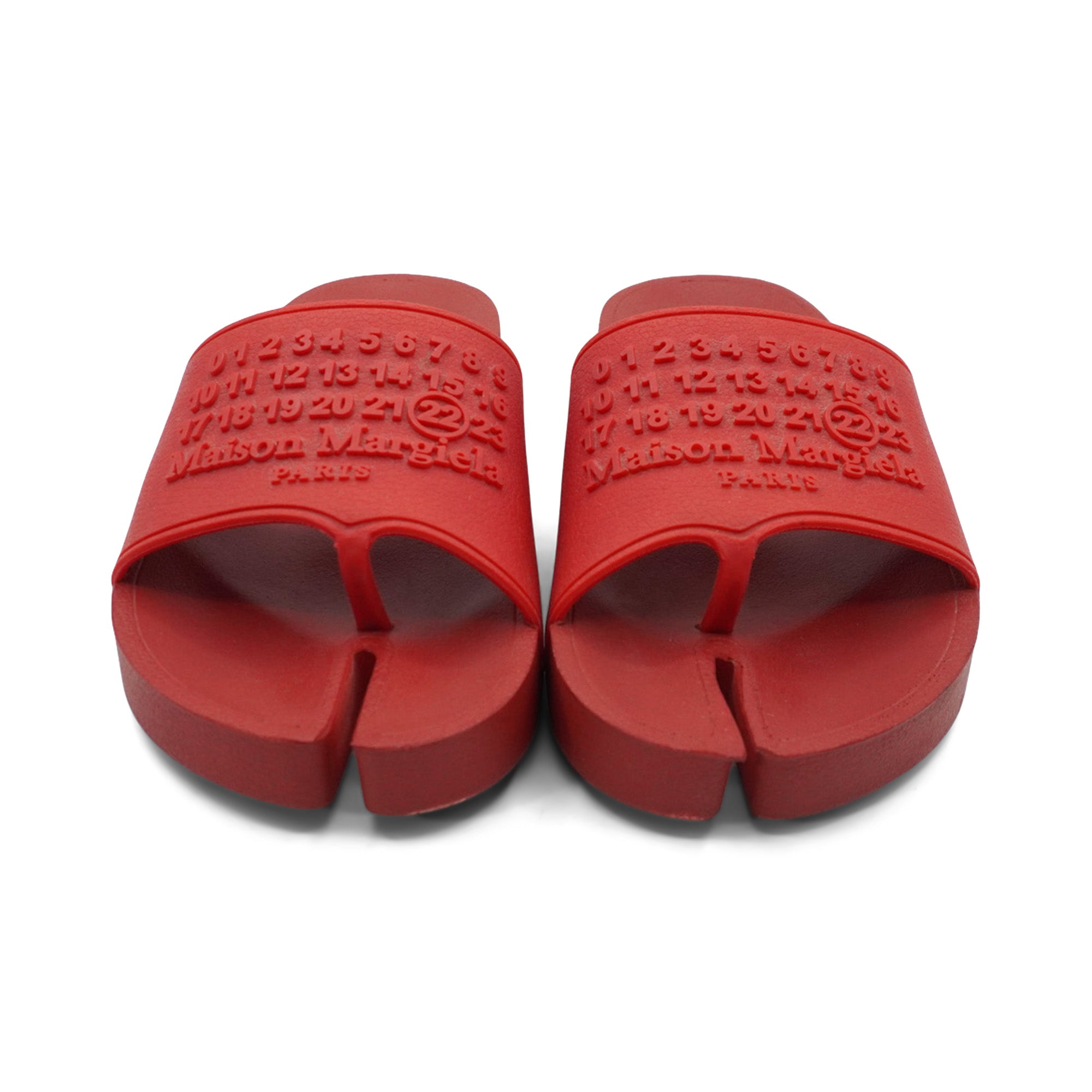 Maison Margiela 'Tabi' pool slides in red ribber with a raised logo graphic on the straps and a signature toe slit in the sole.